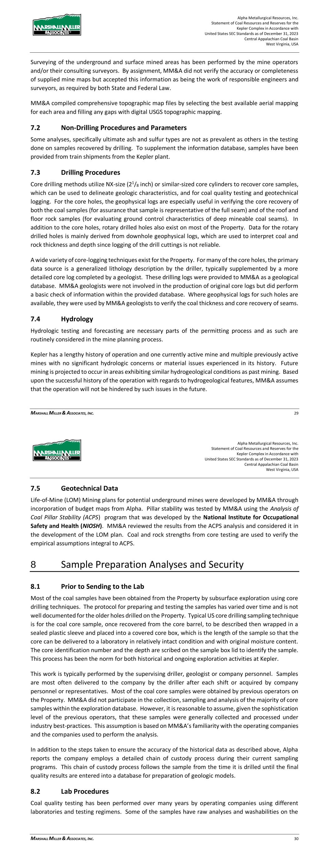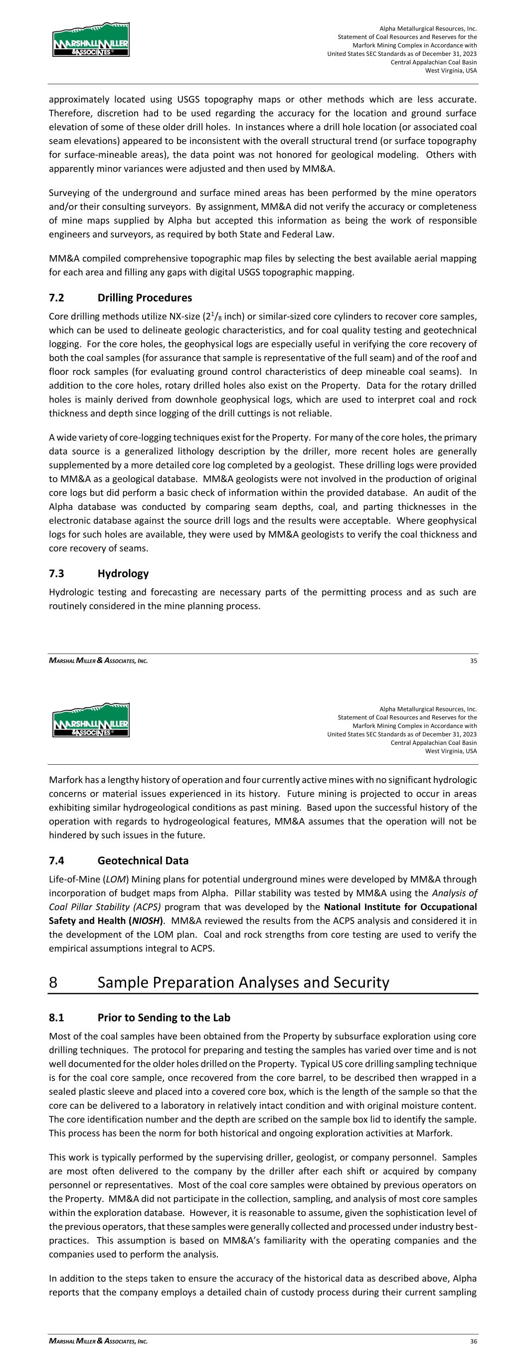 Alpha Metallurgical Resources, Inc. Statement of Coal Resources for the Power Mountain Underground Complex in Accordance with United States SEC Standards as of December 31, 2023 Central Appalachian Coal Basin West Virginia, USA MARSHALL MILLER & ASSOCIATES, INC. 21 Surveying of the underground and surface mined areas has been performed by the mine operators and/or their consulting surveyors. By assignment, MM&A did not verify the accuracy or completeness of mine maps supplied by Alpha but accepted this information as being the work of responsible engineers and surveyors, as required by both State and Federal Law. 7.2 Drilling Procedures Core drilling methods utilize NX-size (21/8 inch) or similar-sized core cylinders to recover core samples, which can be used to delineate geologic characteristics, and for coal quality testing and geotechnical logging. For the core holes, the geophysical logs are especially useful in verifying the core recovery of both the coal samples (for assurance that sample is representative of the full seam) and of the roof and floor rock samples (for evaluating ground control characteristics of deep mineable coal seams). In addition to the core holes, rotary drilled holes also exist on the Property. Data for the rotary drilled holes is mainly derived from downhole geophysical logs, which are used to interpret coal and rock thickness and depth since logging of the drill cuttings is not reliable. A wide variety of core-logging techniques exist for the Property. For many of the core holes, the primary data source is a generalized lithology description by the driller, more recent holes are generally supplemented by a more detailed core log completed by a geologist. These drilling logs were provided to MM&A as a geological database. MM&A geologists were not involved in the production of original core logs but did perform a basic check of information within the provided database. 7.3 Hydrology Hydrologic testing and forecasting are necessary parts of the permitting process and as such are routinely considered in the mine planning process. Power Mountain has a lengthy history of operation in the Eagle coal seam at Jerry Fork and no significant hydrologic concerns or material issues have been experienced in its history. Future mining is projected to occur in areas exhibiting similar hydrogeological conditions as past mining. Based upon the successful history of the operation with regards to hydrogeological features, MM&A assumes that the operation will not be hindered by such issues in the future. 7.4 Geotechnical Data The effects of weathering and stress-relief fracturing are more pronounced at shallow overburden depths, and due to the potential adverse mining conditions that can be encountered within those low- cover areas, coal resources have not been determined for any area that lies within less than 100 feet of overburden thickness. Other potential adverse conditions can be brought on by lithologic transition zones within the near roof strata of the mine. The Powellton seam roof has areas of sandstone roof that transitions to shale roof rock. The Eagle seam is dominated by a relatively consistent shale roof lithology. None of the potential features discussed above should preclude mine development if proper engineering controls are put in place. Alpha Metallurgical Resources, Inc. Statement of Coal Resources for the Power Mountain Underground Complex in Accordance with United States SEC Standards as of December 31, 2023 Central Appalachian Coal Basin West Virginia, USA MARSHALL MILLER & ASSOCIATES, INC. 22 MM&A’s site-specific knowledge of geotechnical information is limited to its employees’ experience at the operation and common knowledge of typical geotechnical based mining issues which are anticipated to be applicable to the subject resource. MM&A has not received exploration-based geotechnical information and has not conducted geotechnical modeling or assessments as part of this engagement. Such modeling would generally be applied to a reserve level analysis. 8 Sample Preparation Analyses and Security 8.1 Prior to Sending to the Lab Coal samples have been obtained from the Property by subsurface exploration using core drilling techniques. The protocol for preparing and testing the samples has varied over time and is not well documented for the older holes drilled on the Property. Typical core-drilling sampling methods for coal in the United States involves drilling through the seam, removing the core from the barrel, describing the lithology, wrapping the coal sample in a sealed plastic sleeve, and placing it lengthwise into a covered core box, and carefully marking hole ID and depth intervals on each box and lid, allowing the core to be delivered to a laboratory in correct stratigraphic order, and with original moisture content. This process has been the norm for both historical and ongoing exploration activities at the Property. This work is typically performed by the supervising driller, geologist, or company personnel. Samples are most often delivered to the company by the driller after each shift or acquired by company personnel or representatives. Coal core samples were obtained by previous or current operators on the Property. MM&A did not participate in the collection, sampling, shipment of core, and analysis of core samples. However, it is reasonable to assume, given the consistency of quality from other previous operators, that these samples were generally collected and processed under industry best practices. This assumption is based on MM&A’s familiarity with the operating companies and the companies used to perform the analysis. In addition to the steps taken to ensure the accuracy of the historical data as described above, Alpha reports that the company employs a detailed chain of custody process during their current sampling programs. This chain of custody process follows the sample from the time it is drilled until the final quality results a