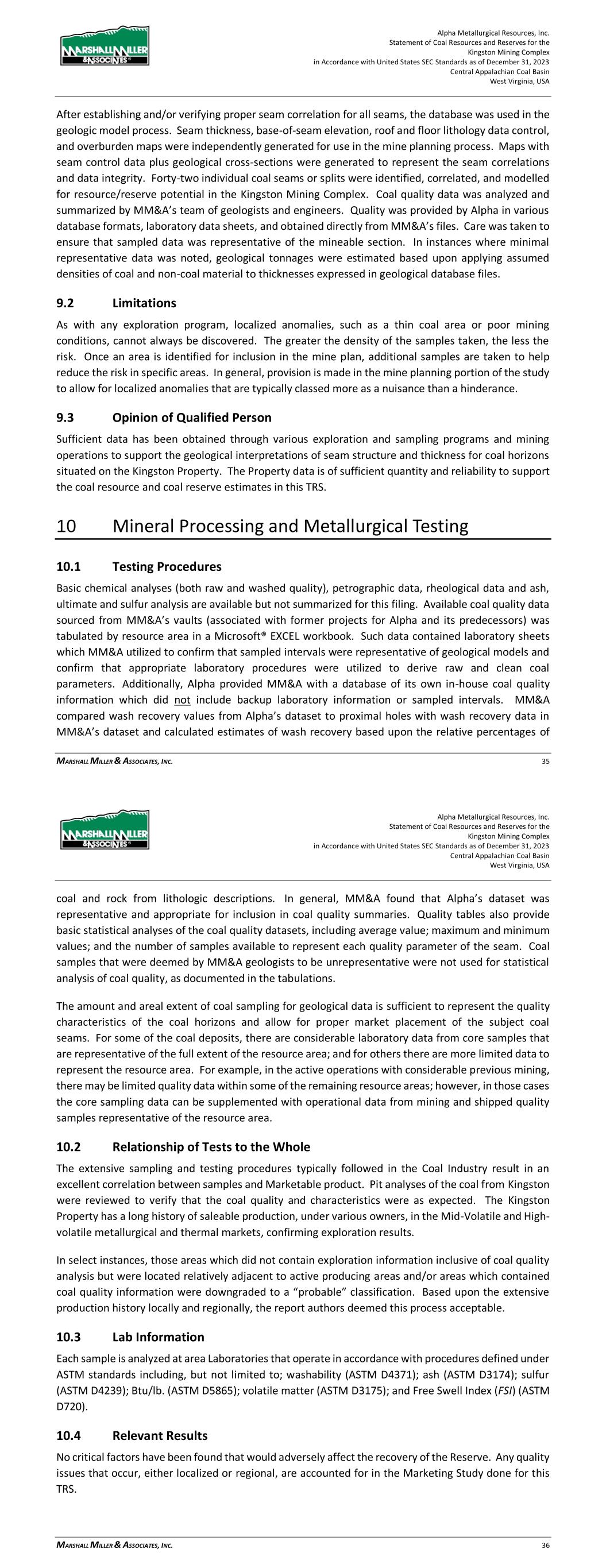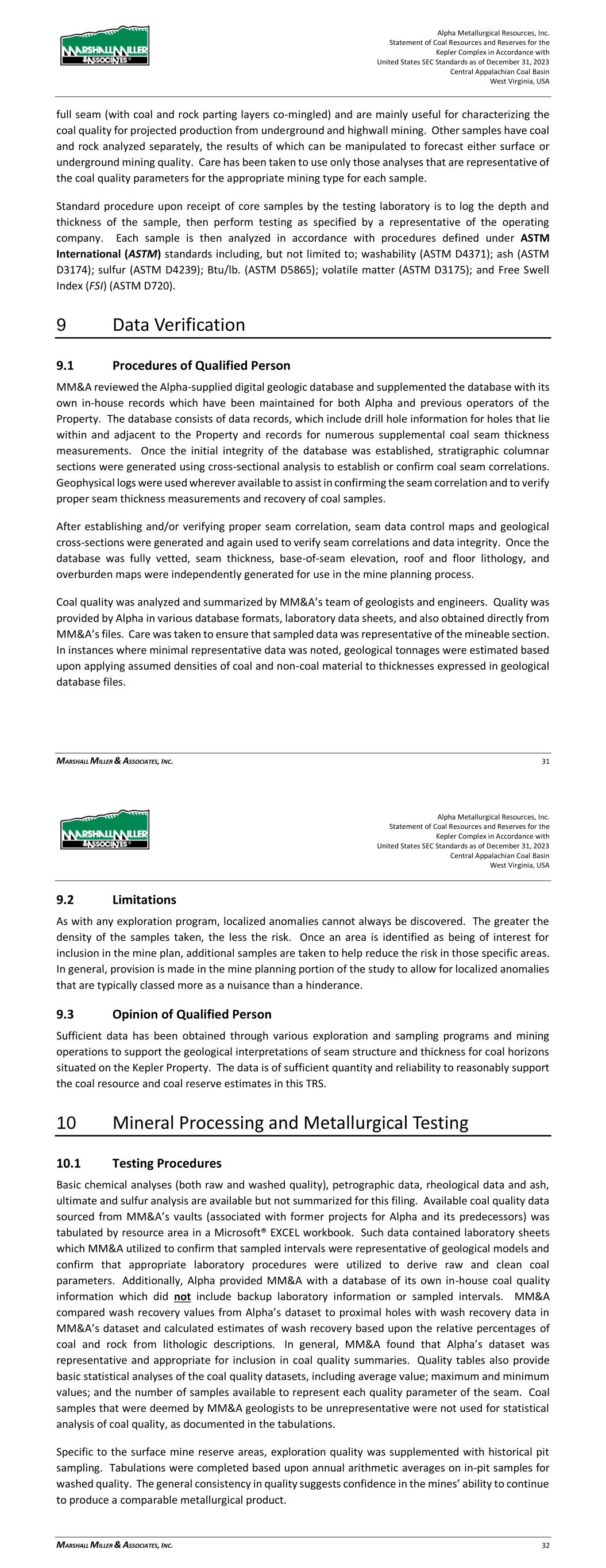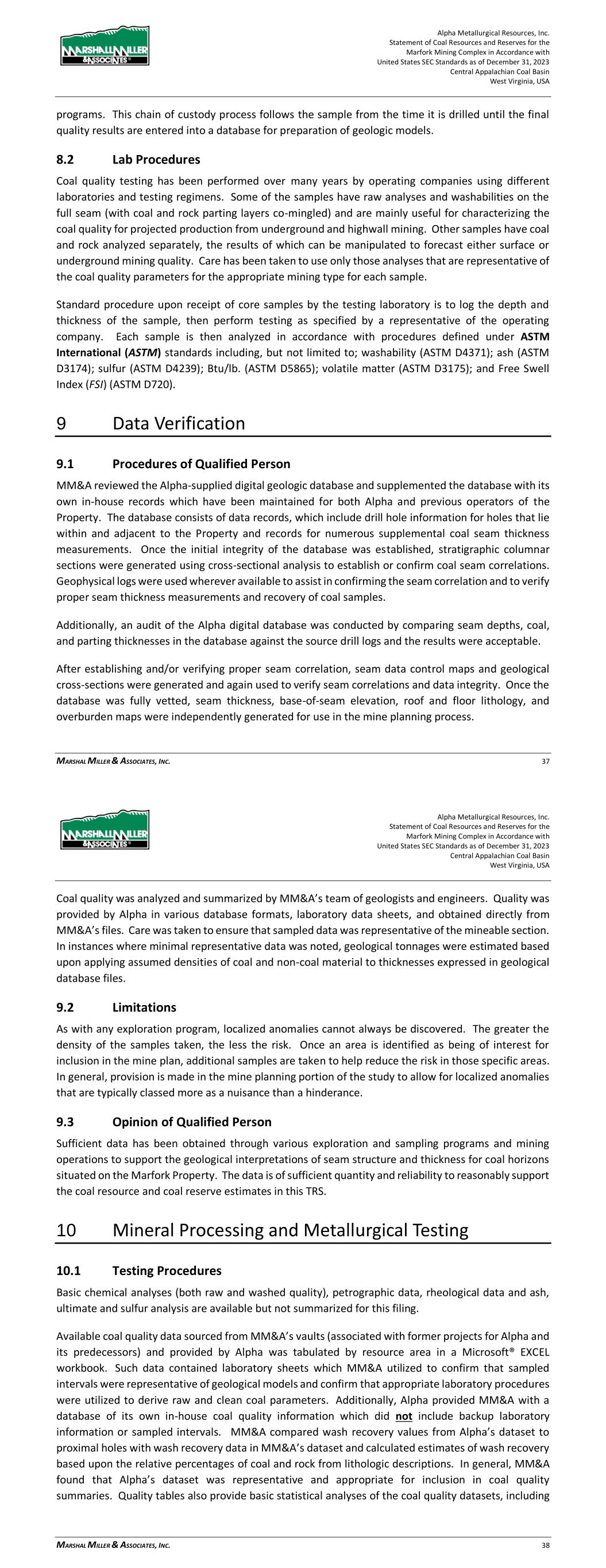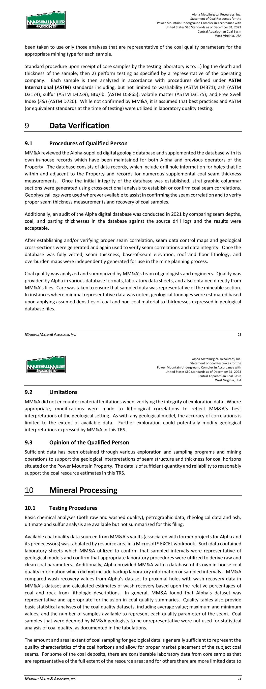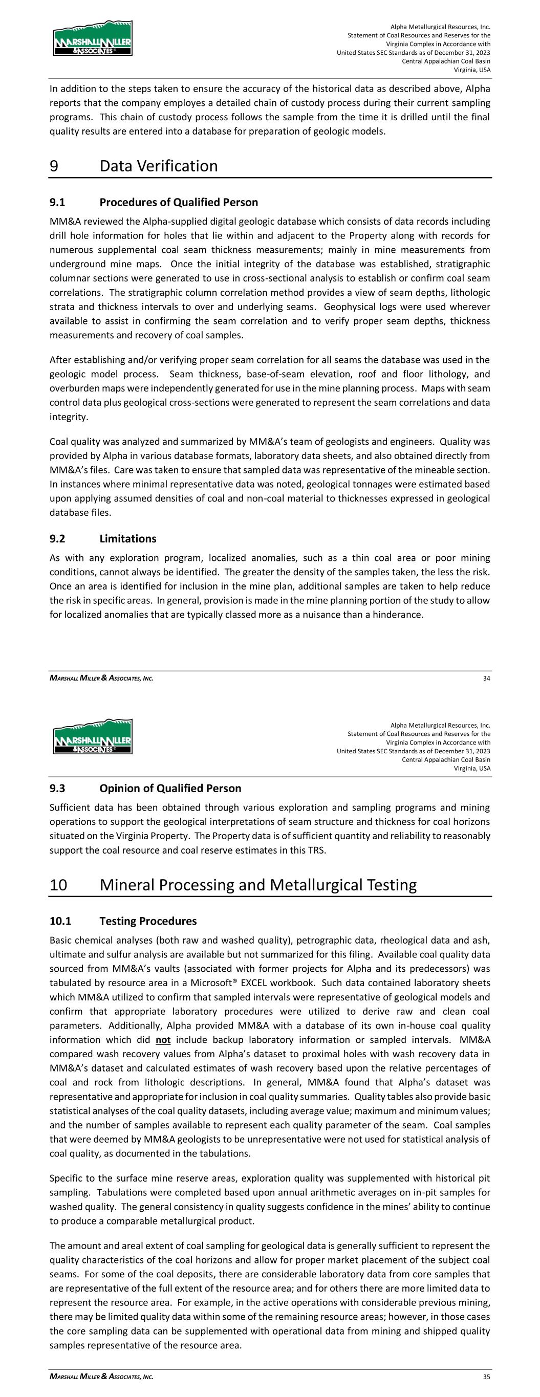 Alpha Metallurgical Resources, Inc. Statement of Coal Resources for the Power Mountain Underground Complex in Accordance with United States SEC Standards as of December 31, 2023 Central Appalachian Coal Basin West Virginia, USA MARSHALL MILLER & ASSOCIATES, INC. 23 been taken to use only those analyses that are representative of the coal quality parameters for the appropriate mining type for each sample. Standard procedure upon receipt of core samples by the testing laboratory is to: 1) log the depth and thickness of the sample; then 2) perform testing as specified by a representative of the operating company. Each sample is then analyzed in accordance with procedures defined under ASTM International (ASTM) standards including, but not limited to washability (ASTM D4371); ash (ASTM D3174); sulfur (ASTM D4239); Btu/lb. (ASTM D5865); volatile matter (ASTM D3175); and Free Swell Index (FSI) (ASTM D720). While not confirmed by MM&A, it is assumed that best practices and ASTM (or equivalent standards at the time of testing) were utilized in laboratory quality testing. 9 Data Verification 9.1 Procedures of Qualified Person MM&A reviewed the Alpha-supplied digital geologic database and supplemented the database with its own in-house records which have been maintained for both Alpha and previous operators of the Property. The database consists of data records, which include drill hole information for holes that lie within and adjacent to the Property and records for numerous supplemental coal seam thickness measurements. Once the initial integrity of the database was established, stratigraphic columnar sections were generated using cross-sectional analysis to establish or confirm coal seam correlations. Geophysical logs were used wherever available to assist in confirming the seam correlation and to verify proper seam thickness measurements and recovery of coal samples. Additionally, an audit of the Alpha digital database was conducted in 2021 by comparing seam depths, coal, and parting thicknesses in the database against the source drill logs and the results were acceptable. After establishing and/or verifying proper seam correlation, seam data control maps and geological cross-sections were generated and again used to verify seam correlations and data integrity. Once the database was fully vetted, seam thickness, base-of-seam elevation, roof and floor lithology, and overburden maps were independently generated for use in the mine planning process. Coal quality was analyzed and summarized by MM&A’s team of geologists and engineers. Quality was provided by Alpha in various database formats, laboratory data sheets, and also obtained directly from MM&A’s files. Care was taken to ensure that sampled data was representative of the mineable section. In instances where minimal representative data was noted, geological tonnages were estimated based upon applying assumed densities of coal and non-coal material to thicknesses expressed in geological database files. Alpha Metallurgical Resources, Inc. Statement of Coal Resources for the Power Mountain Underground Complex in Accordance with United States SEC Standards as of December 31, 2023 Central Appalachian Coal Basin West Virginia, USA MARSHALL MILLER & ASSOCIATES, INC. 24 9.2 Limitations MM&A did not encounter material limitations when verifying the integrity of exploration data. Where appropriate, modifications were made to lithological correlations to reflect MM&A’s best interpretations of the geological setting. As with any geological model, the accuracy of correlations is limited to the extent of available data. Further exploration could potentially modify geological interpretations expressed by MM&A in this TRS. 9.3 Opinion of the Qualified Person Sufficient data has been obtained through various exploration and sampling programs and mining operations to support the geological interpretations of seam structure and thickness for coal horizons situated on the Power Mountain Property. The data is of sufficient quantity and reliability to reasonably support the coal resource estimates in this TRS. 10 Mineral Processing 10.1 Testing Procedures Basic chemical analyses (both raw and washed quality), petrographic data, rheological data and ash, ultimate and sulfur analysis are available but not summarized for this filing. Available coal quality data sourced from MM&A’s vaults (associated with former projects for Alpha and its predecessors) was tabulated by resource area in a Microsoft® EXCEL workbook. Such data contained laboratory sheets which MM&A utilized to confirm that sampled intervals were representative of geological models and confirm that appropriate laboratory procedures were utilized to derive raw and clean coal parameters. Additionally, Alpha provided MM&A with a database of its own in-house coal quality information which did not include backup laboratory information or sampled intervals. MM&A compared wash recovery values from Alpha’s dataset to proximal holes with wash recovery data in MM&A’s dataset and calculated estimates of wash recovery based upon the relative percentages of coal and rock from lithologic descriptions. In general, MM&A found that Alpha’s dataset was representative and appropriate for inclusion in coal quality summaries. Quality tables also provide basic statistical analyses of the coal quality datasets, including average value; maximum and minimum values; and the number of samples available to represent each quality parameter of the seam. Coal samples that were deemed by MM&A geologists to be unrepresentative were not used for statistical analysis of coal quality, as documented in the tabulations. The amount and areal extent of coal sampling for geological data is generally sufficient to represent the quality characteristics of the coal horizons and allow for proper market placement of the subject coal seams. For some of the coal deposits, there are considerable laboratory data from core samples that ar