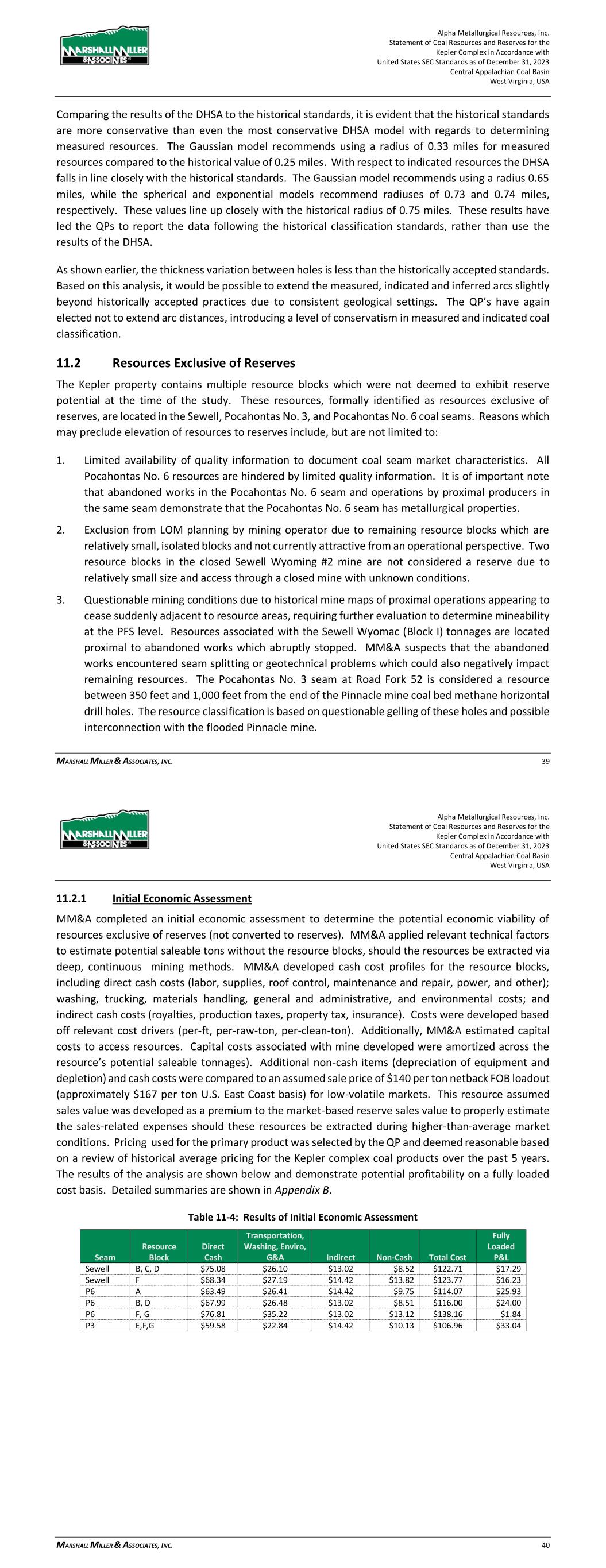 Alpha Metallurgical Resources, Inc. Statement of Coal Resources and Reserves for the Elk Run Underground Complex in Accordance with United States SEC Standards as of December 31, 2023 Central Appalachian Coal Basin West Virginia, USA MARSHALL MILLER & ASSOCIATES, INC. 38 Figure 11-4: Result of DHSA for the Powellton Seam Present in the Elk Run Complex Table 11-2: DHSA Results Summary for Radius from a Central Point Model: Measured Radial Distance (10% Relative Error) Indicated Radial Distance (20% Relative Error) Inferred Radial Distance (50% Relative Error) (Miles) (Miles) (Miles) Gaussian: 0.43 0.71 1.68 Spherical: 0.40 0.71 1.71 Exponential: 0.39 0.72 1.70 Comparing the results of the DHSA to the historical standards, it is evident that the historical standards are more conservative than even the most conservative DHSA model with regards to determining measured resources. The Exponential model recommends using a radius of 0.39 miles for measured resources compared to the historical value of 0.25 miles. With respect to indicated resources the DHSA falls in line closely with the historical standards. The Gaussian and Spherical models recommend using a radius of 0.71 miles, while the Exponential model recommends a radius of 0.72 miles. These values line up closely with the historical radius of 0.75 miles. These results have led the QP’s to report the data following the historical classification standards, as outlined in United States Geological Survey Circular 891 rather than use the results of the DHSA. 11.2 Resources Exclusive of Reserves The Elk Run property contains multiple resource blocks which were not deemed to exhibit reserve potential at the time of the study. These resources, formally identified as resources exclusive of 0 5 10 15 20 25 30 35 40 2000 3000 4000 5000 6000 7000 8000 9000 R el a ve E rr o r 9 5 % P er ce n le R a n ge Dril l Hole Spacing ( ) Gauss ian Exponen al Spherica l Alpha Metallurgical Resources, Inc. Statement of Coal Resources and Reserves for the Elk Run Underground Complex in Accordance with United States SEC Standards as of December 31, 2023 Central Appalachian Coal Basin West Virginia, USA MARSHALL MILLER & ASSOCIATES, INC. 39 reserves, are in the: Upper Cedar Groves, Peerless and Powellton seams. Reasons which may preclude elevation of resources to reserves include, but are not limited to: 1. Limited availability of quality information to document coal seam market characteristics. 2. Coal quality inconsistent with typical preferred market properties. 3. Isolation of resource blocks in which seam access costs are cost prohibitive at the time of the study. - Checkmate Powellton – Map 3: resource along White Castle abandoned mine works due to limited access and poor geometry for a new mine. 4. Unfavorable economics at the PFS level, yet economics could become attractive in the future under different market conditions. - Castle II Peerless - Map 2: raw coal haul distance and difficult up-dip access. 5. Exclusion from LOM planning by mining operator due to remaining resource blocks which are relatively small, isolated blocks and not currently attractive from an operational perspective. 6. Mineability constraints due to over/under mining, underground conditions and physical locations. - Prenter Upper Cedar Grove – Map 1: physical locations for access not identified and engineering and evaluation not completed to be included in the LOM planning. 11.2.1 Initial Economic Assessment MM&A completed an initial economic assessment to determine the potential economic viability of resources exclusive of reserves (not converted to reserves). MM&A applied relevant technical factors to estimate potential saleable tons without the resource blocks, should the resources be extracted via deep, continuous mining methods. MM&A developed cash cost profiles for the resource blocks, including direct cash costs (labor, supplies, roof control, maintenance and repair, power, and other); washing, trucking, materials handling, general and administrative, and environmental costs; and indirect cash costs (royalties, production taxes, property tax, insurance). Costs were developed based off relevant cost drivers (per-ft, per-raw-ton, per-clean-ton). Additionally, MM&A estimated capital costs to access resources. Capital costs associated with mine development were amortized across the resource’s potential saleable tonnages). Additional non-cash items (depreciation of equipment and depletion) and cash costs were compared to an assumed sale price of $130 per ton netback FOB loadout (approximately $150 per ton U.S. East Coast basis) for high-volatile markets. This resource assumed sales value was developed as a premium to the market-based reserve sales value to properly estimate the sales-related expenses should these resources be extracted during higher-than-average market conditions. The pricing used for the primary product was selected by the QP and deemed reasonable based on a review of historical average pricing for the Elk Run complex coal products over the past 5 years. The results of the analysis are shown below and demonstrate potential profitability on a fully loaded cost basis. Detailed summaries are shown in Appendix B.