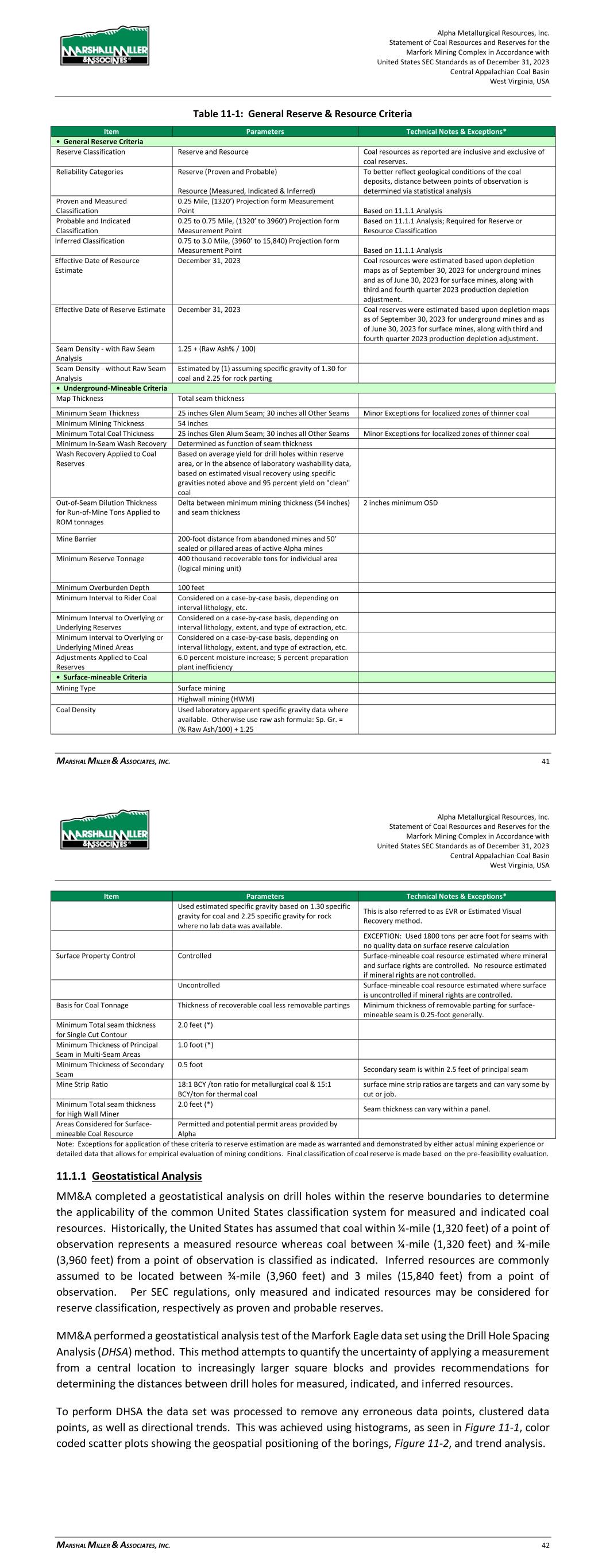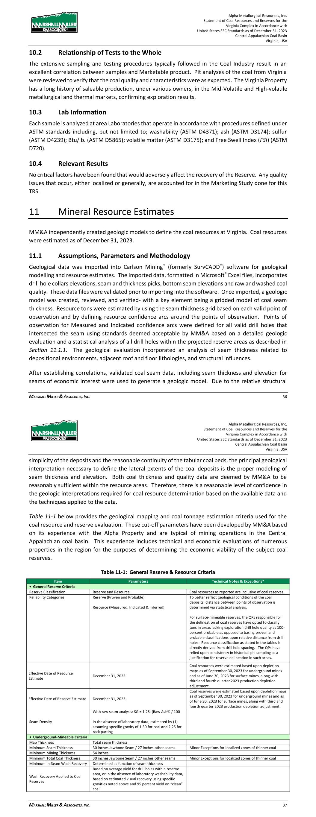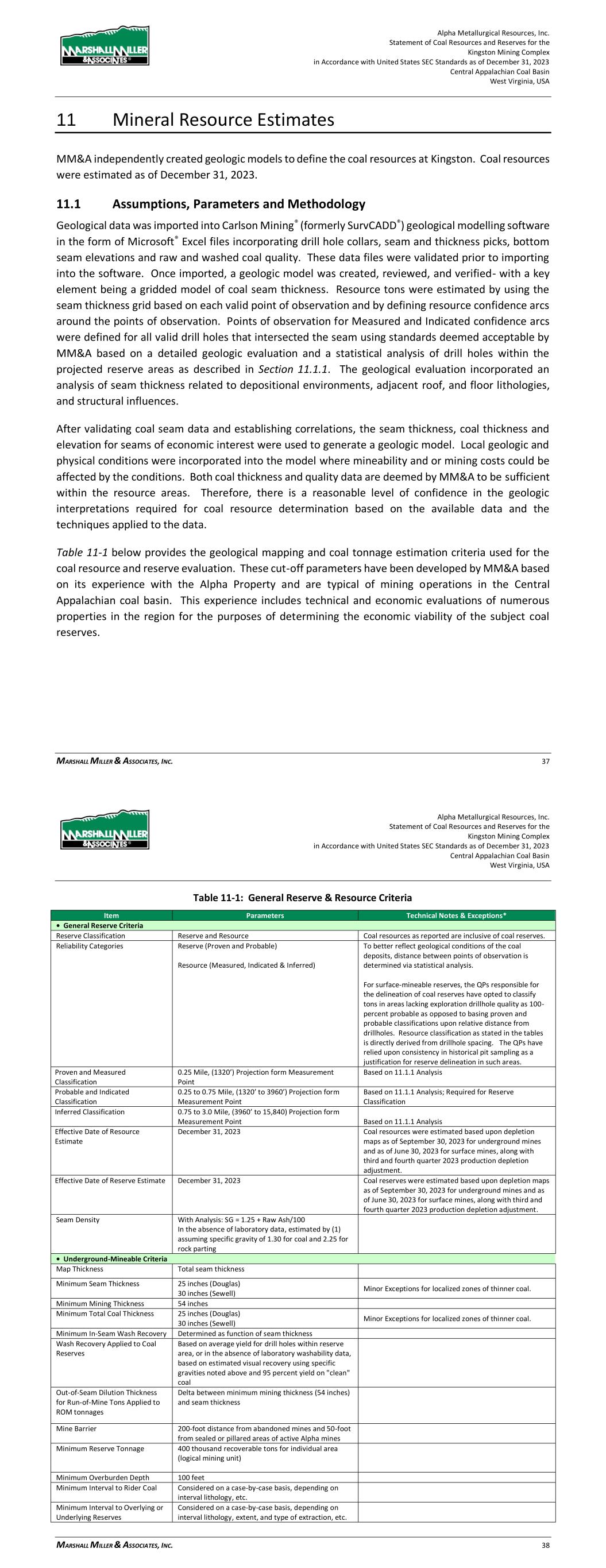Alpha Metallurgical Resources, Inc. Statement of Coal Resources and Reserves for the Elk Run Underground Complex in Accordance with United States SEC Standards as of December 31, 2023 Central Appalachian Coal Basin West Virginia, USA MARSHALL MILLER & ASSOCIATES, INC. 34 11.1 Assumptions, Parameters and Methodology Geological data was imported into Carlson Mining® (formerly SurvCADD®) geological modelling software in the form of Microsoft® Excel files incorporating drill hole collars, seam and thickness picks, bottom seam elevations and raw and washed coal quality. These data files were validated prior to importing into the software. Once imported, a geologic model was created, reviewed, and verified- with a key element being a gridded model of coal seam thickness. Resource tons were estimated by using the seam thickness grid based on each valid point of observation and by defining resource confidence arcs around the points of observation. Points of observation for Measured and Indicated confidence arcs were defined for all valid drill holes that intersected the seam using standards deemed acceptable by MM&A based on a detailed geologic evaluation and a statistical analysis of all drill holes within the projected reserve areas as described in Section 11.1.1. The geological evaluation incorporated an analysis of seam thickness related to depositional environments, adjacent roof and floor lithologies, and structural influences. After validating coal seam data and establishing correlations, the seam thickness, coal thickness and elevation for seams of economic interest were used to generate a geologic model. Local geologic and physical conditions were incorporated into the model where mineability and or mining costs could be affected by the conditions. Both coal thickness and quality data are deemed by MM&A to be reasonably sufficient within the resource areas. Therefore, there is a reasonable level of confidence in the geologic interpretations required for coal resource determination based on the available data and the techniques applied to the data. Table 11-1 below provides the geological mapping and coal tonnage estimation criteria used for the coal resource and reserve evaluation. These cut-off parameters have been developed by MM&A based on its experience with Alpha’s Elk Run Property and are typical of mining operations in the Central Appalachian coal basin. This experience includes technical and economic evaluations of numerous properties in the region for the purposes of determining the economic viability of the subject coal reserves. Table 11-1: General Reserve & Resource Criteria Item Parameters Technical Notes & Exceptions* • General Reserve Criteria Reserve Classification Reserve and Resource Coal resources as reported are inclusive of coal reserves. Reliability Categories Reserve (Proven and Probable) Resource (Measured, Indicated & Inferred) To better reflect geological conditions of the coal deposits, distance between points of observation is determined via statistical analysis Proven and Measured Classification 0.25 Mile, (1320’) Projection form Measurement Point Based on 11.1.1 Analysis Probable and Indicated Classification 0.25 to 0.75 Mile, (1320’ to 3960’) Projection form Measurement Point Based on 11.1.1 Analysis; Required for Reserve or Resource Classification Inferred Classification 0.75 to 3.0 Mile, (3960’ to 15,840) Projection form Measurement Point Based on 11.1.1 Analysis Effective Date of Resource Estimate December 31, 2023 Coal resources were estimated based upon depletion maps as of September 30, 2023, and a fourth quarter 2023 production depletion adjustment. Alpha Metallurgical Resources, Inc. Statement of Coal Resources and Reserves for the Elk Run Underground Complex in Accordance with United States SEC Standards as of December 31, 2023 Central Appalachian Coal Basin West Virginia, USA MARSHALL MILLER & ASSOCIATES, INC. 35 Item Parameters Technical Notes & Exceptions* Effective Date of Reserve Estimate December 31, 2023 Coal reserves were estimated based upon depletion maps as of September 30, 2023, and a fourth quarter 2023production depletion adjustment Seam Density - with Raw Seam Analysis 1.25 + (Raw Ash% / 100) • Underground-Mineable Criteria Map Thickness Total seam thickness Minimum Seam Thickness 30 inches Minor Exceptions for localized zones of thinner coal Minimum Mining Thickness 54 inches Minimum Total Coal Thickness 30 inches Minor Exceptions for localized zones of thinner coal Minimum In-Seam Wash Recovery Determined as function of seam thickness Wash Recovery Applied to Coal Reserves Based on average yield for drill holes within reserve area, or in the absence of laboratory washability data, based on estimated visual recovery using specific gravities noted above and 95 percent yield on "clean" coal Out-of-Seam Dilution Thickness for Run-of-Mine Tons Applied to ROM tonnages Delta between minimum mining thickness (54 inches) and seam thickness 2 inches minimum OSD Mine Barrier 200-foot distance from abandoned mines and 50’ sealed or pillared areas of active Alpha mines Minimum Reserve Tonnage 400 thousand recoverable tons for individual area (logical mining unit) Minimum Overburden Depth 100 feet Minimum Interval to Rider Coal Considered on a case-by-case basis, depending on interval lithology, etc. Minimum Interval to Overlying or Underlying Reserves Considered on a case-by-case basis, depending on interval lithology, extent and type of extraction, etc. Minimum Interval to Overlying or Underlying Mined Areas Considered on a case-by-case basis, depending on interval lithology, extent and type of extraction, etc. Adjustments Applied to Coal Reserves 6.0 percent moisture increase; 5 percent preparation plant inefficiency Note: Exceptions for application of these criteria to reserve estimation are made as warranted and demonstrated by either actual mining experience or detailed data that allows for empirical evaluation of minin