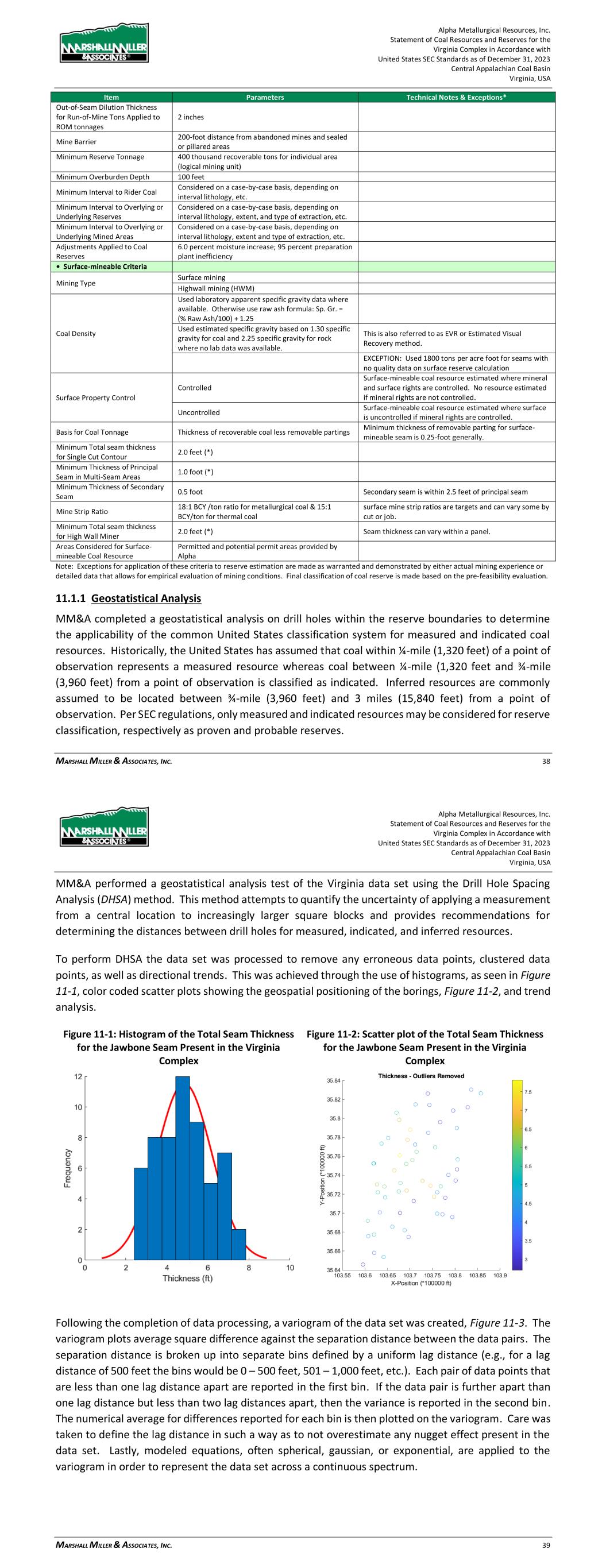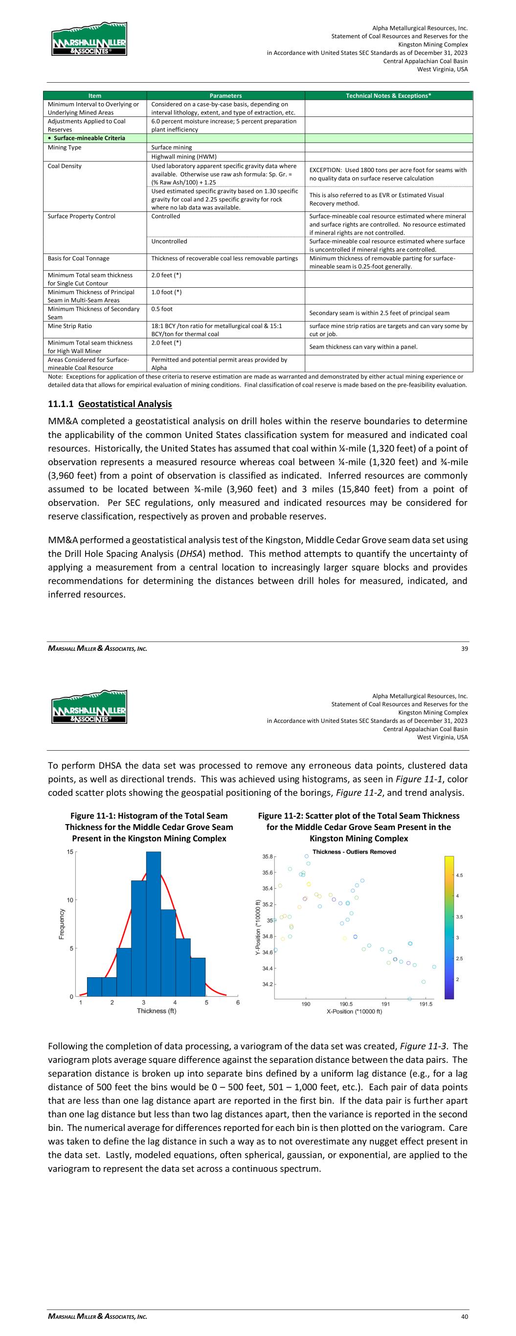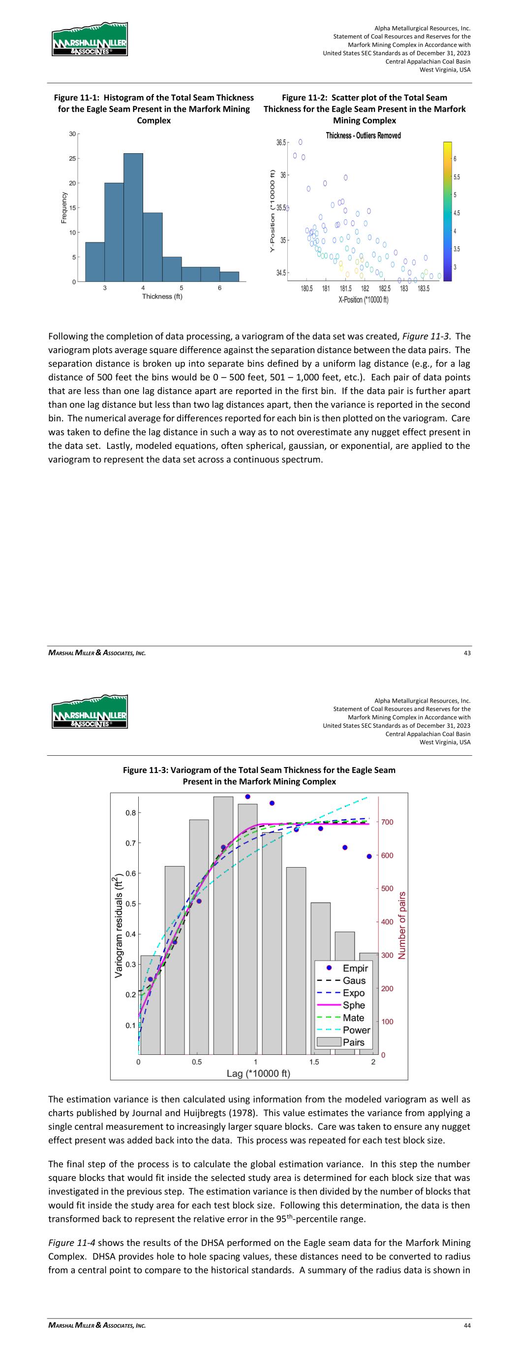 Alpha Metallurgical Resources, Inc. Statement of Coal Resources and Reserves for the Elk Run Underground Complex in Accordance with United States SEC Standards as of December 31, 2023 Central Appalachian Coal Basin West Virginia, USA MARSHALL MILLER & ASSOCIATES, INC. 36 To perform DHSA the data set was processed to remove any erroneous data points, clustered data points, as well as directional trends. This was achieved through the use of histograms, as seen in Figure 11-1, color coded scatter plots showing the geospatial positioning of the borings, Figure 11-2, and trend analysis. Figure 11-1: Histogram of the Total Seam Thickness for the Powellton Seam Present in the Elk Run Complex Figure 11-2: Scatter plot of the Total Seam Thickness for the Powellton Seam Present in the Elk Run Complex Following the completion of data processing, a variogram of the data set was created, Figure 11-3. The variogram plots average square difference against the separation distance between the data pairs. The separation distance is broken up into separate bins defined by a uniform lag distance (e.g., for a lag distance of 500 feet the bins would be 0 – 500 feet, 501 – 1,000 feet, etc.). Each pair of data points that are less than one lag distance apart are reported in the first bin. If the data pair is further apart than one lag distance but less than two lag distances apart, then the variance is reported in the second bin. The numerical average for differences reported for each bin is then plotted on the variogram. Care was taken to define the lag distance in such a way as to not overestimate any nugget effect present in the data set. Lastly, modeled equations, often spherical, gaussian, or exponential, are applied to the variogram in order to represent the data set across a continuous spectrum. Alpha Metallurgical Resources, Inc. Statement of Coal Resources and Reserves for the Elk Run Underground Complex in Accordance with United States SEC Standards as of December 31, 2023 Central Appalachian Coal Basin West Virginia, USA MARSHALL MILLER & ASSOCIATES, INC. 37 Figure 11-3: Variogram of the Total Seam Thickness for the Powellton Seam Present in the Elk Run Complex The estimation variance is then calculated using information from the modeled variogram as well as charts published by Journel and Huijbregts (1978). This value estimates the variance from applying a single central measurement to increasingly larger square blocks. Care was taken to ensure any nugget effect present was added back into the data. This process was repeated for each test block size. The final step of the process is to calculate the global estimation variance. In this step the number square blocks that would fit inside the selected study area is determined for each block size that was investigated in the previous step. The estimation variance is then divided by the number of blocks that would fit inside the study area for each test block size. Following this determination, the data is then transformed back to represent the relative error in the 95th-percentile range. Figure 11-4 shows the results of the DHSA performed on the Powellton seam data for the Elk Run Complex. DHSA provides hole to hole spacing values, these distances need to be converted to radius from a central point to compare to the historical standards. A summary of the radius data is shown in Table 11-2. DHSA prescribes measured, indicated, and inferred drill hole spacings be determined at the 10-percent, 20-percent, and 50-percent levels of relative error, respectively.
