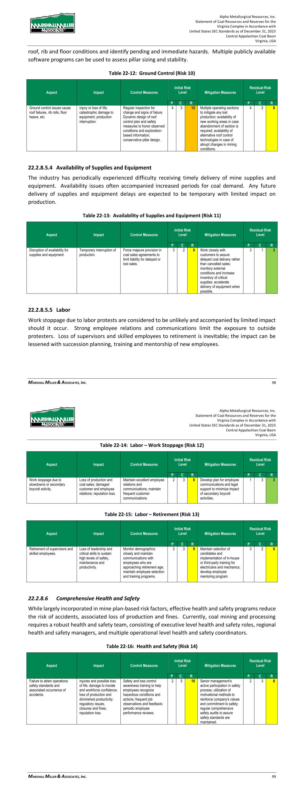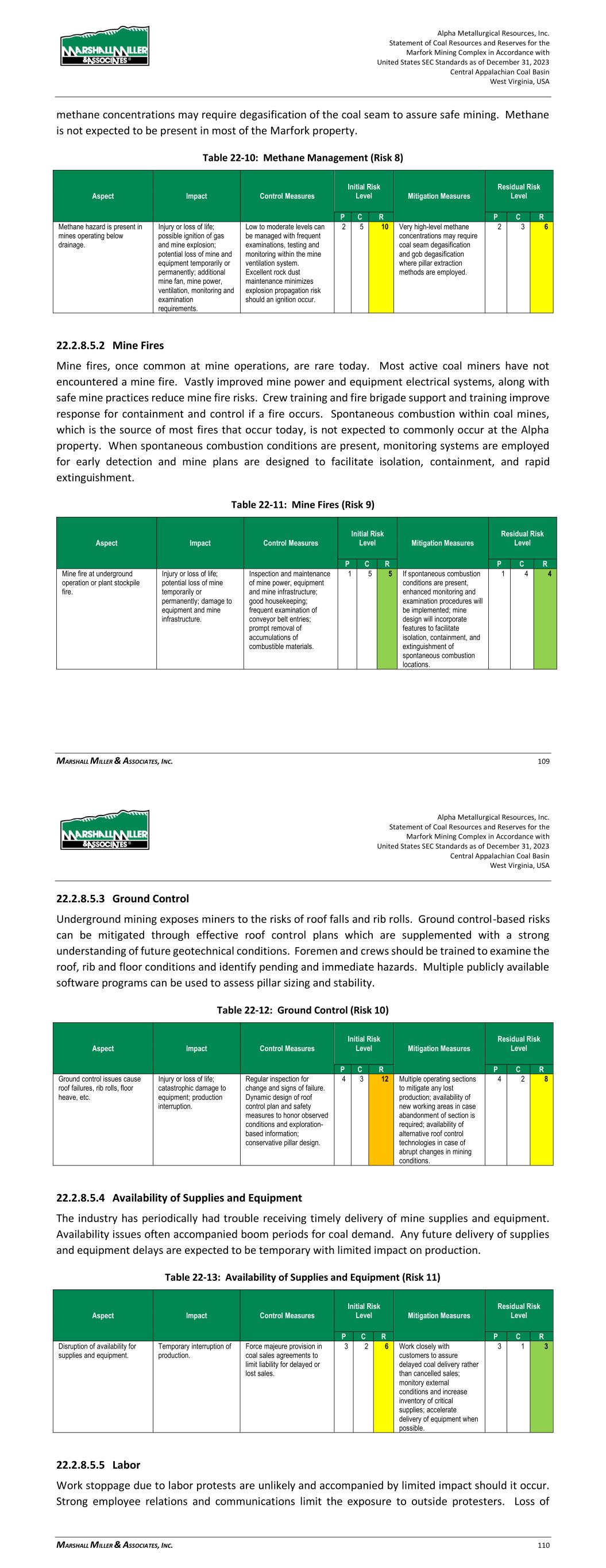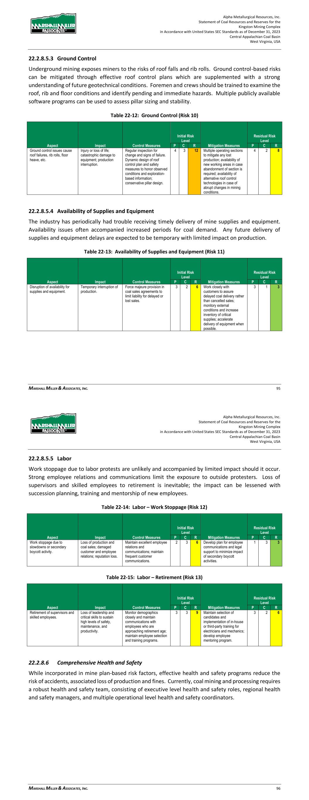 Alpha Metallurgical Resources, Inc. Statement of Coal Resources and Reserves for the Elk Run Underground Complex in Accordance with United States SEC Standards as of December 31, 2023 Central Appalachian Coal Basin West Virginia, USA MARSHALL MILLER & ASSOCIATES, INC. 80 methane concentrations may require degasification of the coal seam to assure safe mining. High methane concentrations are not expected to be present in the Elk Run mines. Table 22-10: Methane Management (Risk 8) Aspect Impact Control Measures Initial Risk Level Mitigation Measures Residual Risk Level P C R P C R Methane hazard is present in mines operating below drainage. Injury or loss of life; possible ignition of gas and mine explosion; potential loss of mine and equipment temporarily or permanently; additional mine fan, mine power, ventilation, monitoring and examination requirements. Low to moderate levels can be managed with frequent examinations, testing and monitoring within the mine ventilation system. Excellent rock dust maintenance minimizes explosion propagation risk should an ignition occur. 2 5 10 Very high-level methane concentrations may require coal seam degasification and gob degasification where pillar extraction methods are employed. 2 3 6 22.2.8.5.2 Mine Fires Mine fires, once common at mine operations, are rare today. Most active coal miners have not encountered a mine fire. Vastly improved mine power and equipment electrical systems, along with safe mine practices reduce mine fire risks. Crew training and fire brigade support and training improve response for containment and control if a fire occurs. Spontaneous combustion within coal mines, which is the source of most fires that occur today, is not expected to commonly occur at the Alpha property. When spontaneous combustion conditions are present, monitoring systems are employed for early detection and mine plans are designed to facilitate isolation, containment and rapid extinguishment. Table 22-11: Mine Fires (Risk 9) Aspect Impact Control Measures Initial Risk Level Mitigation Measures Residual Risk Level P C R P C R Mine fire at underground operation or plant stockpile fire. Injury or loss of life; potential loss of mine temporarily or permanently; damage to equipment and mine infrastructure. Inspection and maintenance of mine power, equipment and mine infrastructure; good housekeeping; frequent examination of conveyor belt entries; prompt removal of accumulations of combustible materials. 1 5 5 If spontaneous combustion conditions are present, enhanced monitoring and examination procedures will be implemented; mine design will incorporate features to facilitate isolation, containment and extinguishment of spontaneous combustion locations. 1 4 4 Alpha Metallurgical Resources, Inc. Statement of Coal Resources and Reserves for the Elk Run Underground Complex in Accordance with United States SEC Standards as of December 31, 2023 Central Appalachian Coal Basin West Virginia, USA MARSHALL MILLER & ASSOCIATES, INC. 81 22.2.8.5.3 Ground Control Underground mining exposes miners to the risks of roof falls and rib rolls. Ground control-based risks can be mitigated through effective roof control plans which are supplemented with a strong understanding of future geotechnical conditions. Foremen and crews should be trained to examine the roof, rib and floor conditions and identify pending and immediate hazards. Multiple publicly available software programs can be used to assess pillar sizing and stability. Table 22-12: Ground Control (Risk 10) Aspect Impact Control Measures Initial Risk Level Mitigation Measures Residual Risk Level P C R P C R Ground control issues cause roof failures, rib rolls, floor heave, etc. Injury or loss of life; catastrophic damage to equipment; production interruption. Regular inspection for change and signs of failure. Dynamic design of roof control plan and safety measures to honor observed conditions and exploration- based information; conservative pillar design. 4 3 12 Multiple operating sections to mitigate any lost production; availability of new working areas in case abandonment of section is required; availability of alternative roof control technologies in case of abrupt changes in mining conditions. 4 2 8 22.2.8.5.4 Availability of Supplies and Equipment The industry has periodically experienced difficulty receiving timely delivery of mine supplies and equipment. Availability issues often accompanied boom periods for coal demand. Any future delivery of supplies and equipment delays are expected to be temporary with limited impact on production. Table 22-13: Availability of Supplies and Equipment (Risk 11) Aspect Impact Control Measures Initial Risk Level Mitigation Measures Residual Risk Level P C R P C R Disruption of availability for supplies and equipment. Temporary interruption of production. Force majeure provision in coal sales agreements to limit liability for delayed or lost sales. 3 2 6 Work closely with customers to assure delayed coal delivery rather than cancelled sales; monitory external conditions and increase inventory of critical supplies; accelerate delivery of equipment when possible. 3 1 3 22.2.8.5.5 Labor Work stoppages due to labor protests are considered to be unlikely and accompanied by limited impact should it occur. Strong employee relations and communications limit the exposure to outside