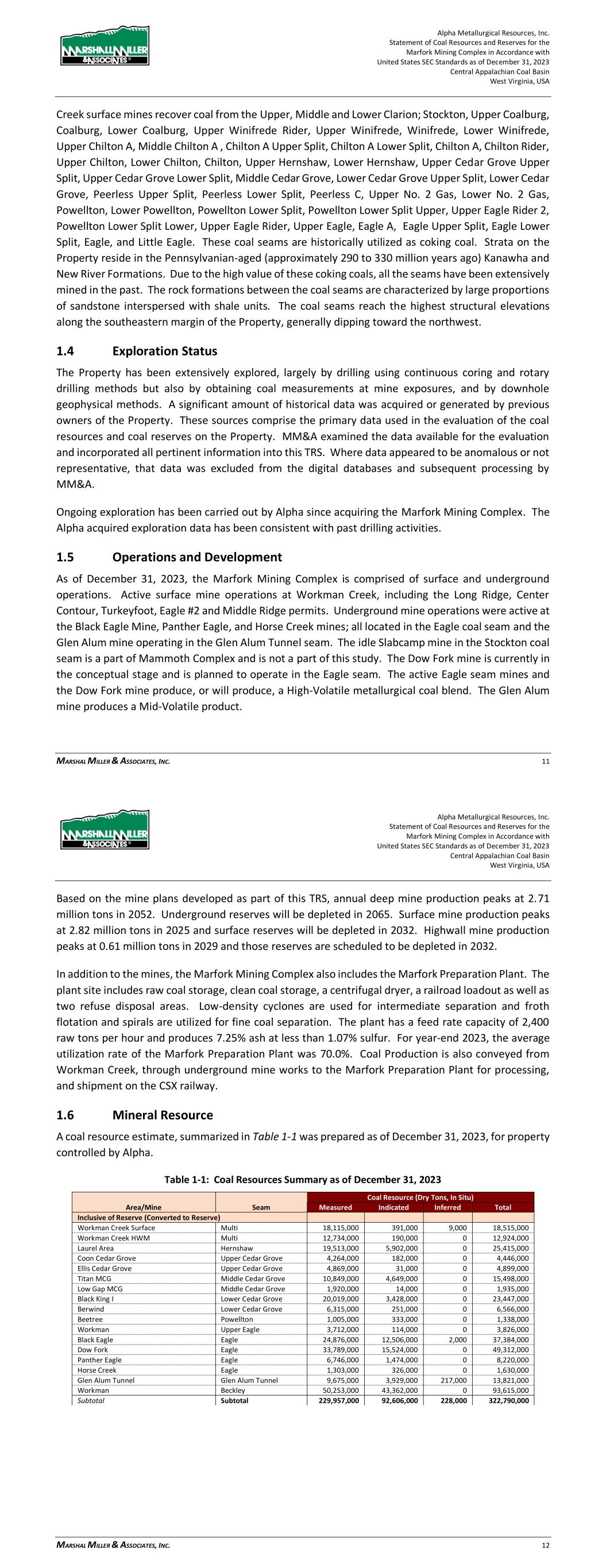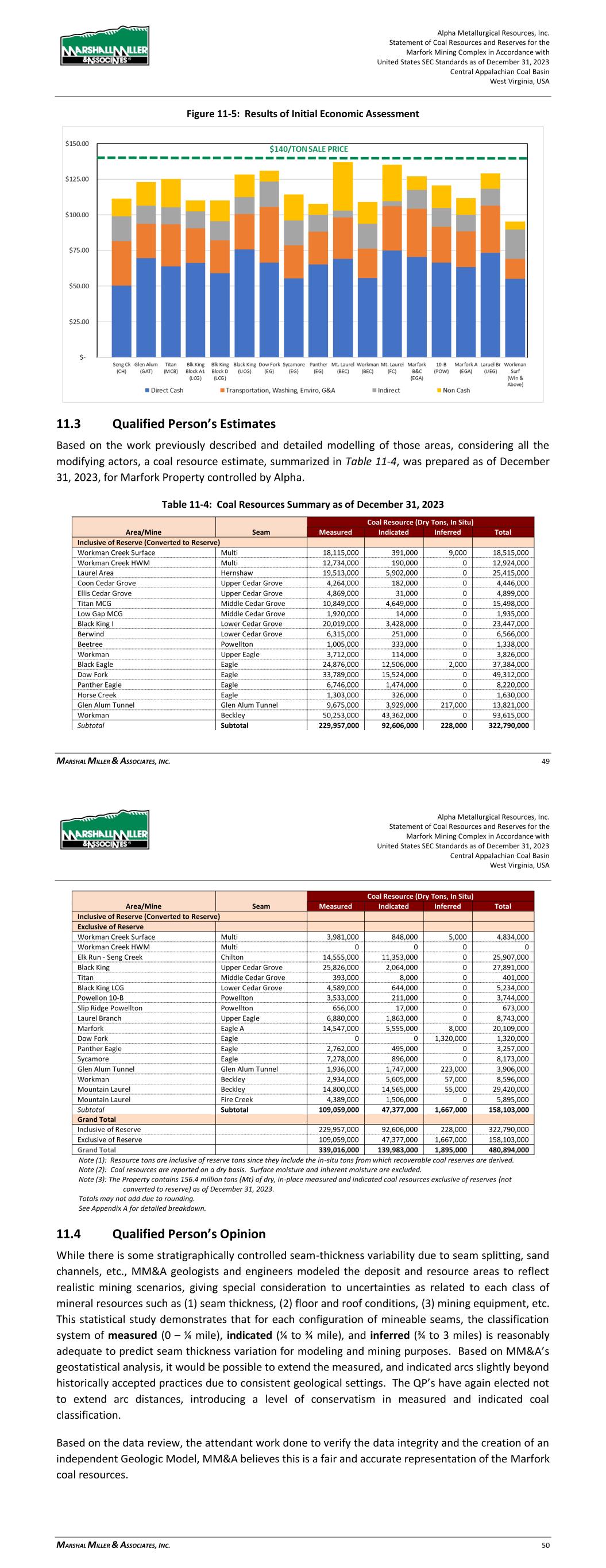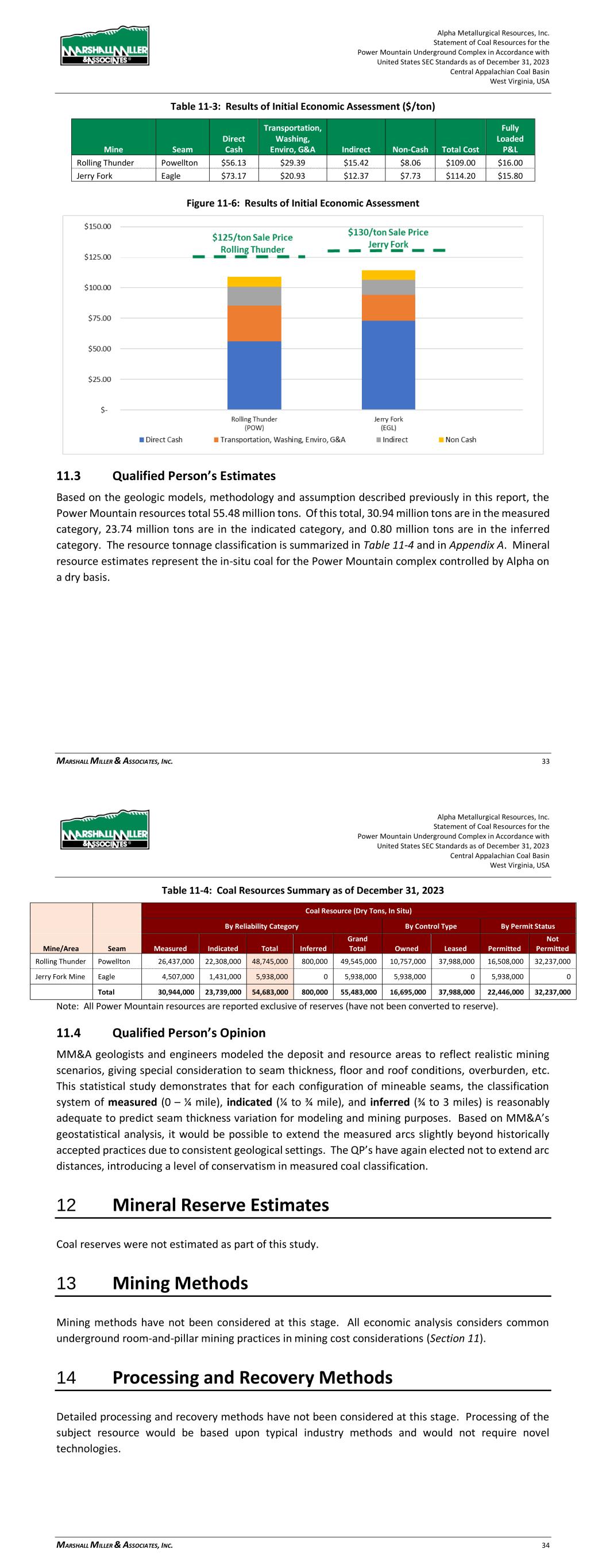 Alpha Metallurgical Resources, Inc. Statement of Coal Resources for the Power Mountain Underground Complex in Accordance with United States SEC Standards as of December 31, 2023 Central Appalachian Coal Basin West Virginia, USA MARSHALL MILLER & ASSOCIATES, INC. 33 Table 11-3: Results of Initial Economic Assessment ($/ton) Mine Seam Direct Cash Transportation, Washing, Enviro, G&A Indirect Non-Cash Total Cost Fully Loaded P&L Rolling Thunder Powellton $56.13 $29.39 $15.42 $8.06 $109.00 $16.00 Jerry Fork Eagle $73.17 $20.93 $12.37 $7.73 $114.20 $15.80 Figure 11-6: Results of Initial Economic Assessment 11.3 Qualified Person’s Estimates Based on the geologic models, methodology and assumption described previously in this report, the Power Mountain resources total 55.48 million tons. Of this total, 30.94 million tons are in the measured category, 23.74 million tons are in the indicated category, and 0.80 million tons are in the inferred category. The resource tonnage classification is summarized in Table 11-4 and in Appendix A. Mineral resource estimates represent the in-situ coal for the Power Mountain complex controlled by Alpha on a dry basis. Alpha Metallurgical Resources, Inc. Statement of Coal Resources for the Power Mountain Underground Complex in Accordance with United States SEC Standards as of December 31, 2023 Central Appalachian Coal Basin West Virginia, USA MARSHALL MILLER & ASSOCIATES, INC. 34 Table 11-4: Coal Resources Summary as of December 31, 2023 Coal Resource (Dry Tons, In Situ) By Reliability Category By Control Type By Permit Status Mine/Area Seam Measured Indicated Total Inferred Grand Total Owned Leased Permitted Not Permitted Rolling Thunder Powellton 26,437,000 22,308,000 48,745,000 800,000 49,545,000 10,757,000 37,988,000 16,508,000 32,237,000 Jerry Fork Mine Eagle 4,507,000 1,431,000 5,938,000 0 5,938,000 5,938,000 0 5,938,000 0 Total 30,944,000 23,739,000 54,683,000 800,000 55,483,000 16,695,000 37,988,000 22,446,000 32,237,000 Note: All Power Mountain resources are reported exclusive of reserves (have not been converted to reserve). 11.4 Qualified Person’s Opinion MM&A geologists and engineers modeled the deposit and resource areas to reflect realistic mining scenarios, giving special consideration to seam thickness, floor and roof conditions, overburden, etc. This statistical study demonstrates that for each configuration of mineable seams, the classification system of measured (0 – ¼ mile), indicated (¼ to ¾ mile), and inferred (¾ to 3 miles) is reasonably adequate to predict seam thickness variation for modeling and mining purposes. Based on MM&A’s geostatistical analysis, it would be possible to extend the measured arcs slightly beyond historically accepted practices due to consistent geological settings. The QP’s have again elected not to extend arc distances, introducing a level of conservatism in measured coal classification. 12 Mineral Reserve Estimates Coal reserves were not estimated as part of this study. 13 Mining Methods Mining methods have not been considered at this stage. All economic analysis considers common underground room-and-pillar mining practices in mining cost considerations (Section 11). 14 Processing and Recovery Methods Detailed processing and recovery methods have not been considered at this stage. Processing of the subject resource would be based upon typical industry methods and would not require novel technologies.