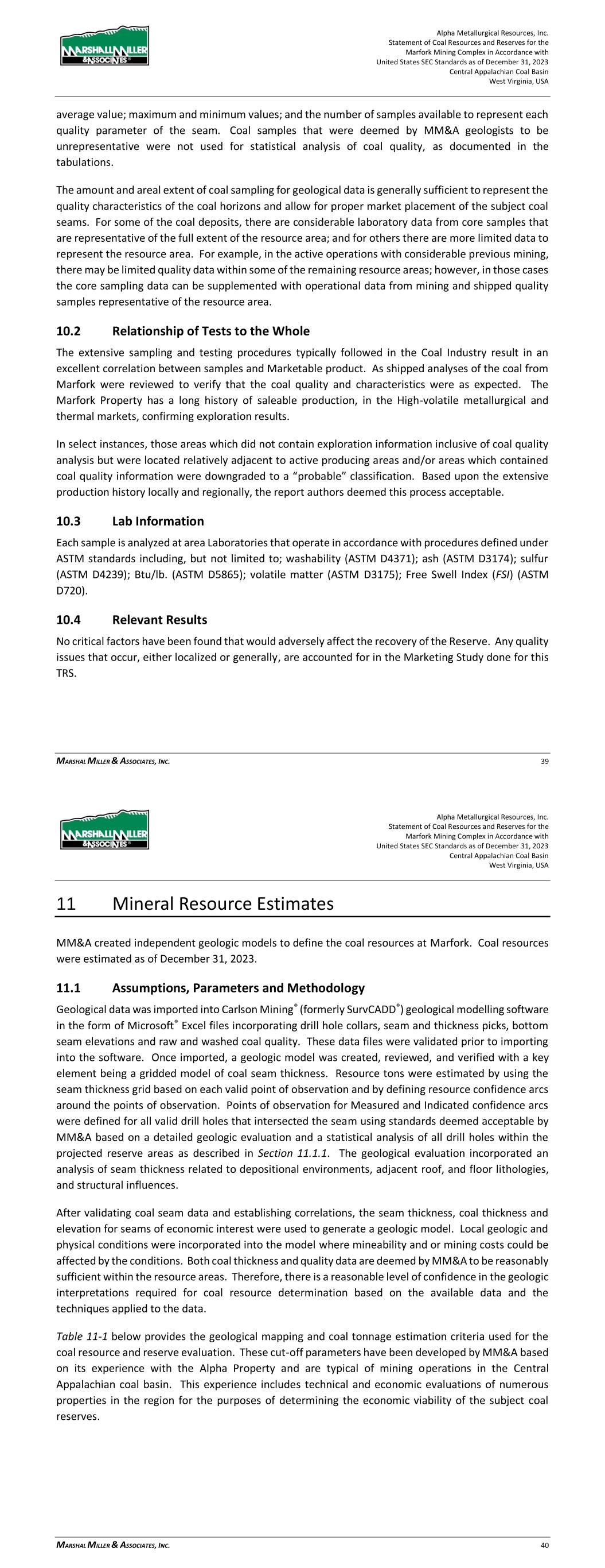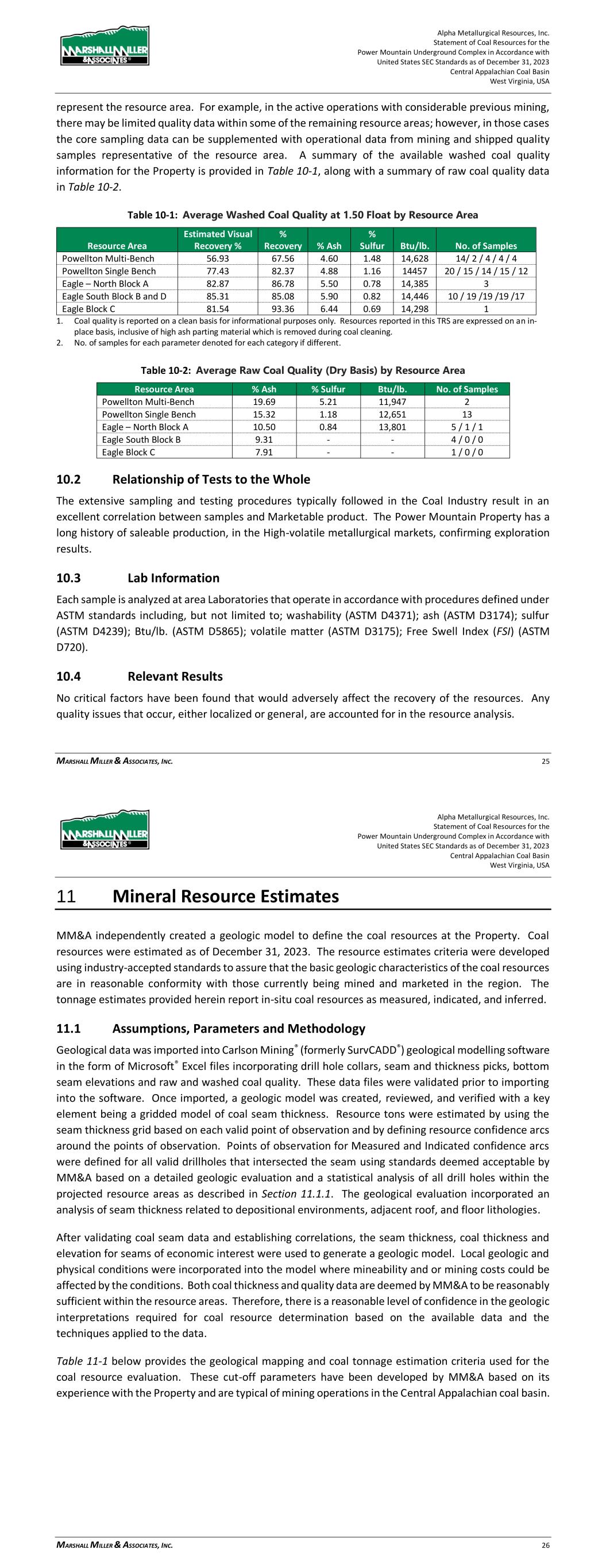 Alpha Metallurgical Resources, Inc. Statement of Coal Resources for the Power Mountain Underground Complex in Accordance with United States SEC Standards as of December 31, 2023 Central Appalachian Coal Basin West Virginia, USA MARSHALL MILLER & ASSOCIATES, INC. 25 represent the resource area. For example, in the active operations with considerable previous mining, there may be limited quality data within some of the remaining resource areas; however, in those cases the core sampling data can be supplemented with operational data from mining and shipped quality samples representative of the resource area. A summary of the available washed coal quality information for the Property is provided in Table 10-1, along with a summary of raw coal quality data in Table 10-2. Table 10-1: Average Washed Coal Quality at 1.50 Float by Resource Area Resource Area Estimated Visual Recovery % % Recovery % Ash % Sulfur Btu/lb. No. of Samples Powellton Multi-Bench 56.93 67.56 4.60 1.48 14,628 14/ 2 / 4 / 4 / 4 Powellton Single Bench 77.43 82.37 4.88 1.16 14457 20 / 15 / 14 / 15 / 12 Eagle – North Block A 82.87 86.78 5.50 0.78 14,385 3 Eagle South Block B and D 85.31 85.08 5.90 0.82 14,446 10 / 19 /19 /19 /17 Eagle Block C 81.54 93.36 6.44 0.69 14,298 1 1. Coal quality is reported on a clean basis for informational purposes only. Resources reported in this TRS are expressed on an in- place basis, inclusive of high ash parting material which is removed during coal cleaning. 2. No. of samples for each parameter denoted for each category if different. Table 10-2: Average Raw Coal Quality (Dry Basis) by Resource Area Resource Area % Ash % Sulfur Btu/lb. No. of Samples Powellton Multi-Bench 19.69 5.21 11,947 2 Powellton Single Bench 15.32 1.18 12,651 13 Eagle – North Block A 10.50 0.84 13,801 5 / 1 / 1 Eagle South Block B 9.31 - - 4 / 0 / 0 Eagle Block C 7.91 - - 1 / 0 / 0 10.2 Relationship of Tests to the Whole The extensive sampling and testing procedures typically followed in the Coal Industry result in an excellent correlation between samples and Marketable product. The Power Mountain Property has a long history of saleable production, in the High-volatile metallurgical markets, confirming exploration results. 10.3 Lab Information Each sample is analyzed at area Laboratories that operate in accordance with procedures defined under ASTM standards including, but not limited to; washability (ASTM D4371); ash (ASTM D3174); sulfur (ASTM D4239); Btu/lb. (ASTM D5865); volatile matter (ASTM D3175); Free Swell Index (FSI) (ASTM D720). 10.4 Relevant Results No critical factors have been found that would adversely affect the recovery of the resources. Any quality issues that occur, either localized or general, are accounted for in the resource analysis. Alpha Metallurgical Resources, Inc. Statement of Coal Resources for the Power Mountain Underground Complex in Accordance with United States SEC Standards as of December 31, 2023 Central Appalachian Coal Basin West Virginia, USA MARSHALL MILLER & ASSOCIATES, INC. 26 11 Mineral Resource Estimates MM&A independently created a geologic model to define the coal resources at the Property. Coal resources were estimated as of December 31, 2023. The resource estimates criteria were developed using industry-accepted standards to assure that the basic geologic characteristics of the coal resources are in reasonable conformity with those currently being mined and marketed in the region. The tonnage estimates provided herein report in-situ coal resources as measured, indicated, and inferred. 11.1 Assumptions, Parameters and Methodology Geological data was imported into Carlson Mining® (formerly SurvCADD®) geological modelling software in the form of Microsoft® Excel files incorporating drill hole collars, seam and thickness picks, bottom seam elevations and raw and washed coal quality. These data files were validated prior to importing into the software. Once imported, a geologic model was created, reviewed, and verified with a key element being a gridded model of coal seam thickness. Resource tons were estimated by using the seam thickness grid based on each valid point of observation and by defining resource confidence arcs around the points of observation. Points of observation for Measured and Indicated confidence arcs were defined for all valid drillholes that intersected the seam using standards deemed acceptable by MM&A based on a detailed geologic evaluation and a statistical analysis of all drill holes within the projected resource areas as described in Section 11.1.1. The geological evaluation incorporated an analysis of seam thickness related to depositional environments, adjacent roof, and floor lithologies. After validating coal seam data and establishing correlations, the seam thickness, coal thickness and elevation for seams of economic interest were used to generate a geologic model. Local geologic and physical conditions were incorporated into the model where mineability and or mining costs could be affected by the conditions. Both coal thickness and quality data are deemed by MM&A to be reasonably sufficient within the resource areas. Therefore, there is a reasonable level of confidence in the geologic interpretations required for coal resource determination based on the available data and the techniques applied to the data. Table 11-1 below provides the geological mapping and coal tonnage estimation criteria used for the coal resource evaluation. These cut-off parameters have been developed by MM&A based on its experience with the Property and are typical of mining operations in the Central Appalachian coal basin.