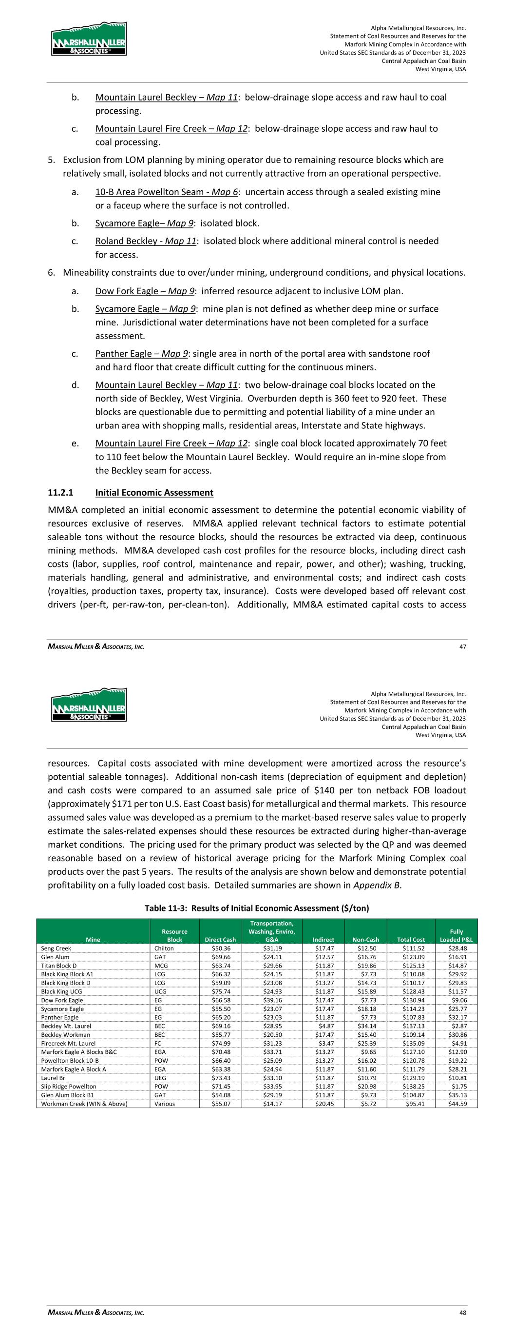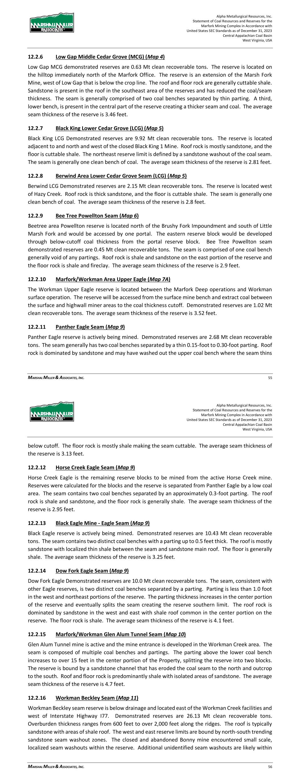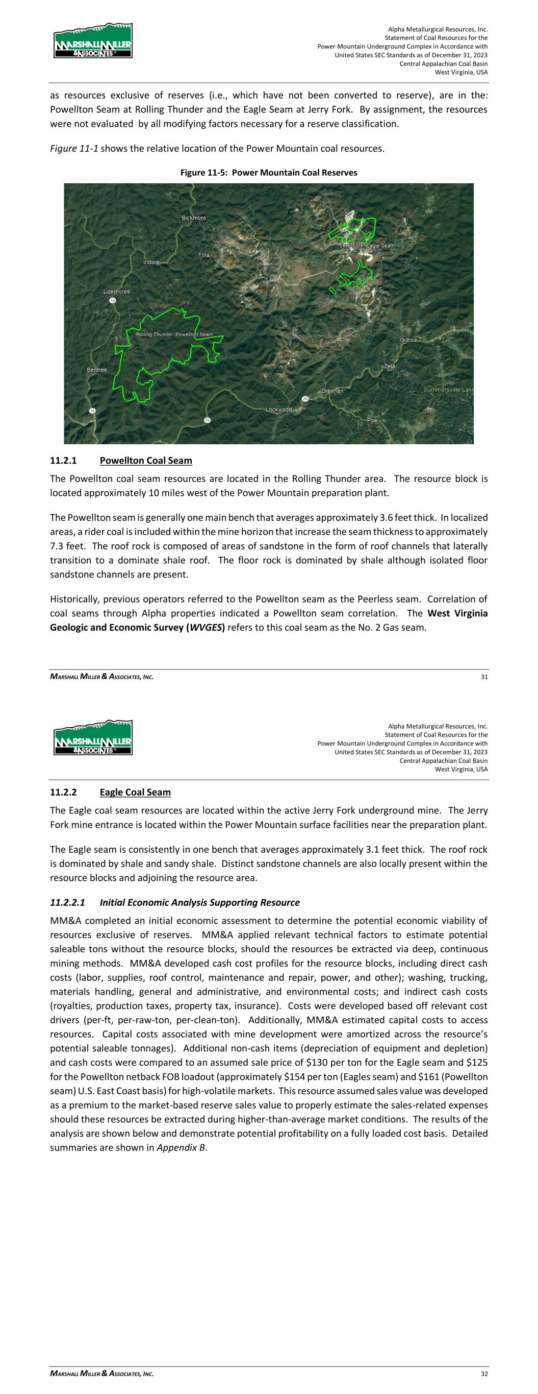 Alpha Metallurgical Resources, Inc. Statement of Coal Resources for the Power Mountain Underground Complex in Accordance with United States SEC Standards as of December 31, 2023 Central Appalachian Coal Basin West Virginia, USA MARSHALL MILLER & ASSOCIATES, INC. 31 as resources exclusive of reserves (i.e., which have not been converted to reserve), are in the: Powellton Seam at Rolling Thunder and the Eagle Seam at Jerry Fork. By assignment, the resources were not evaluated by all modifying factors necessary for a reserve classification. Figure 11-1 shows the relative location of the Power Mountain coal resources. Figure 11-5: Power Mountain Coal Reserves 11.2.1 Powellton Coal Seam The Powellton coal seam resources are located in the Rolling Thunder area. The resource block is located approximately 10 miles west of the Power Mountain preparation plant. The Powellton seam is generally one main bench that averages approximately 3.6 feet thick. In localized areas, a rider coal is included within the mine horizon that increase the seam thickness to approximately 7.3 feet. The roof rock is composed of areas of sandstone in the form of roof channels that laterally transition to a dominate shale roof. The floor rock is dominated by shale although isolated floor sandstone channels are present. Historically, previous operators referred to the Powellton seam as the Peerless seam. Correlation of coal seams through Alpha properties indicated a Powellton seam correlation. The West Virginia Geologic and Economic Survey (WVGES) refers to this coal seam as the No. 2 Gas seam. Alpha Metallurgical Resources, Inc. Statement of Coal Resources for the Power Mountain Underground Complex in Accordance with United States SEC Standards as of December 31, 2023 Central Appalachian Coal Basin West Virginia, USA MARSHALL MILLER & ASSOCIATES, INC. 32 11.2.2 Eagle Coal Seam The Eagle coal seam resources are located within the active Jerry Fork underground mine. The Jerry Fork mine entrance is located within the Power Mountain surface facilities near the preparation plant. The Eagle seam is consistently in one bench that averages approximately 3.1 feet thick. The roof rock is dominated by shale and sandy shale. Distinct sandstone channels are also locally present within the resource blocks and adjoining the resource area. 11.2.2.1 Initial Economic Analysis Supporting Resource MM&A completed an initial economic assessment to determine the potential economic viability of resources exclusive of reserves. MM&A applied relevant technical factors to estimate potential saleable tons without the resource blocks, should the resources be extracted via deep, continuous mining methods. MM&A developed cash cost profiles for the resource blocks, including direct cash costs (labor, supplies, roof control, maintenance and repair, power, and other); washing, trucking, materials handling, general and administrative, and environmental costs; and indirect cash costs (royalties, production taxes, property tax, insurance). Costs were developed based off relevant cost drivers (per-ft, per-raw-ton, per-clean-ton). Additionally, MM&A estimated capital costs to access resources. Capital costs associated with mine development were amortized across the resource’s potential saleable tonnages). Additional non-cash items (depreciation of equipment and depletion) and cash costs were compared to an assumed sale price of $130 per ton for the Eagle seam and $125 for the Powellton netback FOB loadout (approximately $154 per ton (Eagles seam) and $161 (Powellton seam) U.S. East Coast basis) for high-volatile markets. This resource assumed sales value was developed as a premium to the market-based reserve sales value to properly estimate the sales-related expenses should these resources be extracted during higher-than-average market conditions. The results of the analysis are shown below and demonstrate potential profitability on a fully loaded cost basis. Detailed summaries are shown in Appendix B.