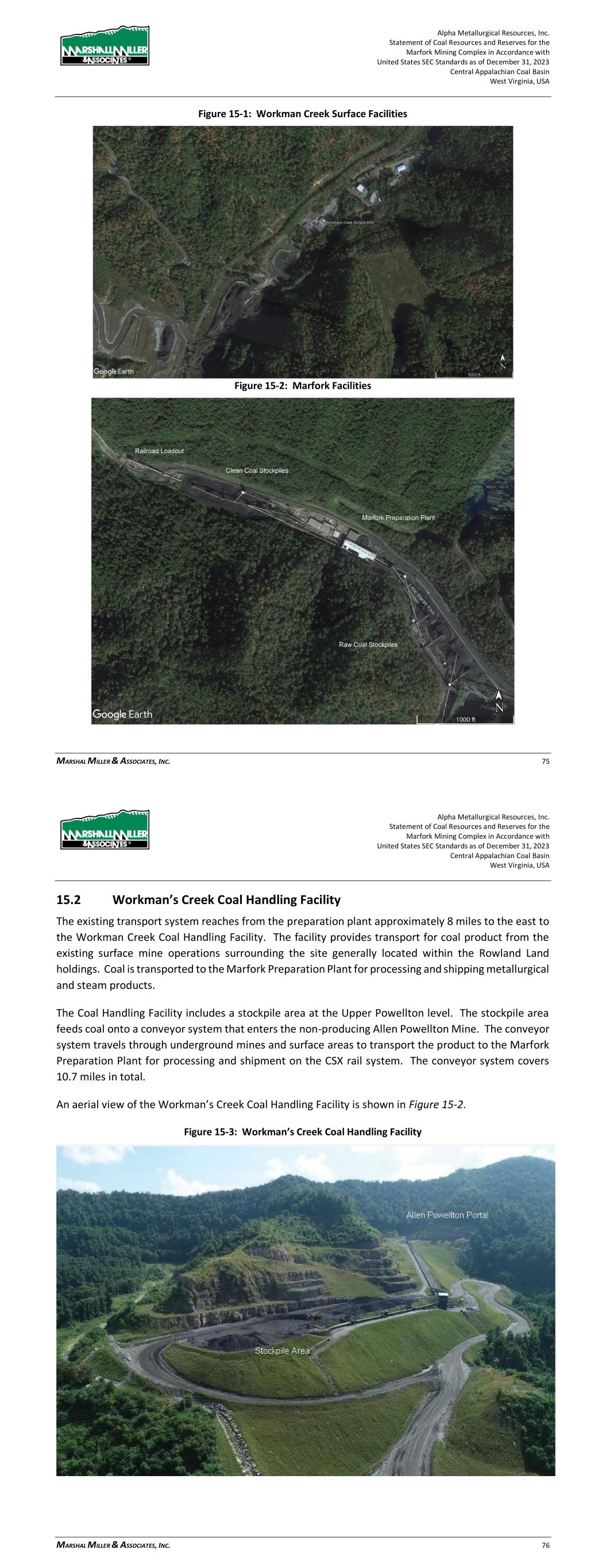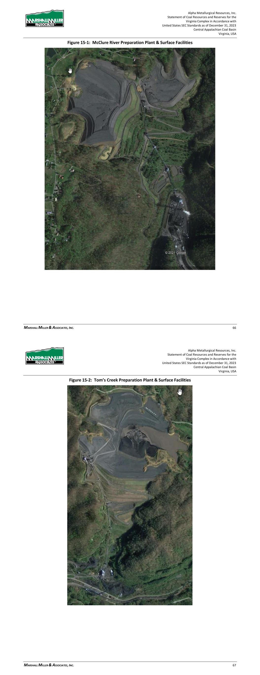Alpha Metallurgical Resources, Inc. Statement of Coal Resources for the Power Mountain Underground Complex in Accordance with United States SEC Standards as of December 31, 2023 Central Appalachian Coal Basin West Virginia, USA MARSHALL MILLER & ASSOCIATES, INC. 35 15 Infrastructure Existing infrastructure on the Power Mountain Complex including the coal preparation plant, loadout and Eagle seam Jerry Fork Mine are fully in place. The Rolling Thunder Powellton seam was developed in 2023. Production from Rolling Thunder Powellton is projected to be transported to the Power Mountain facilities for processing and market access. During the initial startup of operations, raw coal is trucked to the nearby Mammoth preparation plant for processing and market access. The Power Mountain plant, originally constructed in 1985, has a capacity of 1,200 tph and utilization of 25.65% in 2023. An aerial photo of the Power Mountain facility follows in Figure 15-1. Figure 15-1: Power Mountain Facilities 16 Market Studies 16.1 Market Description The quality characteristics for the subject coal resources have been reviewed in detail by MM&A. The drill hole data was used to develop average coal quality characteristics for the mining site. These Alpha Metallurgical Resources, Inc. Statement of Coal Resources for the Power Mountain Underground Complex in Accordance with United States SEC Standards as of December 31, 2023 Central Appalachian Coal Basin West Virginia, USA MARSHALL MILLER & ASSOCIATES, INC. 36 average coal quality characteristics were then used as the basis for determining the various markets into which the saleable coal will likely be placed. Typical quality specifications for the Power Mountain products are as shown in Table 16-1. Table 16-1: Dry Quality Specifications Powellton Eagle HVB HVB Ash (%) 4.82 7.46 Sulfur (%) 1.22 0.75 Volatile Matter (%) 35.80 33.7 The mine production serves the high-volatile metallurgical markets. 16.2 Price Forecasts Pricing data as provided by Alpha from third party sources is described in Table 16-2. The pricing data assumes a flat-line long term realization of $154 per short ton port pricing, with an average of $130 per ton netback pricing reflective of the high-volatile metallurgical Eagle seam product currently sold at Power Mountain. The Powellton seam pricing data assumes a flat-line long term realization of $161 per short ton port pricing, with an average $125 per ton netback pricing reflective of the high-volatile metallurgical product. Pricing was judgmentally selected by the QP based on review of historical average pricing over the past 5 years. A large majority of the coal sold by Alpha and their Power Mountain business group is shipped internationally as part of blended products from other business units within Alpha or sourced from other companies. These netback adjustments reflect these additional costs carried after the products leave the Power Mountain business unit. Table 16-2: Price Forecast Coal Quality Market Pricing Per Ton (1) (2) High-Vol. B $154 to $161 (1) - Market pricing shown on U.S. East Coast basis. (2) - Metallurgical pricing based on review of historical average pricing over the past 5 years. 17 Environmental Studies, Permitting and Plans 17.1 Environmental Permit Requirements and Status All mining operations are subject to federal and state laws and must obtain permits to operate mines, coal preparation and related facilities, haul roads, and other incidental surface disturbances necessary for mining to occur. Permits generally require that the permittee post a performance bond in an amount established by the regulatory program to provide assurance that any disturbance or liability created during mining operations is properly restored to an approved post-mining land use and that all