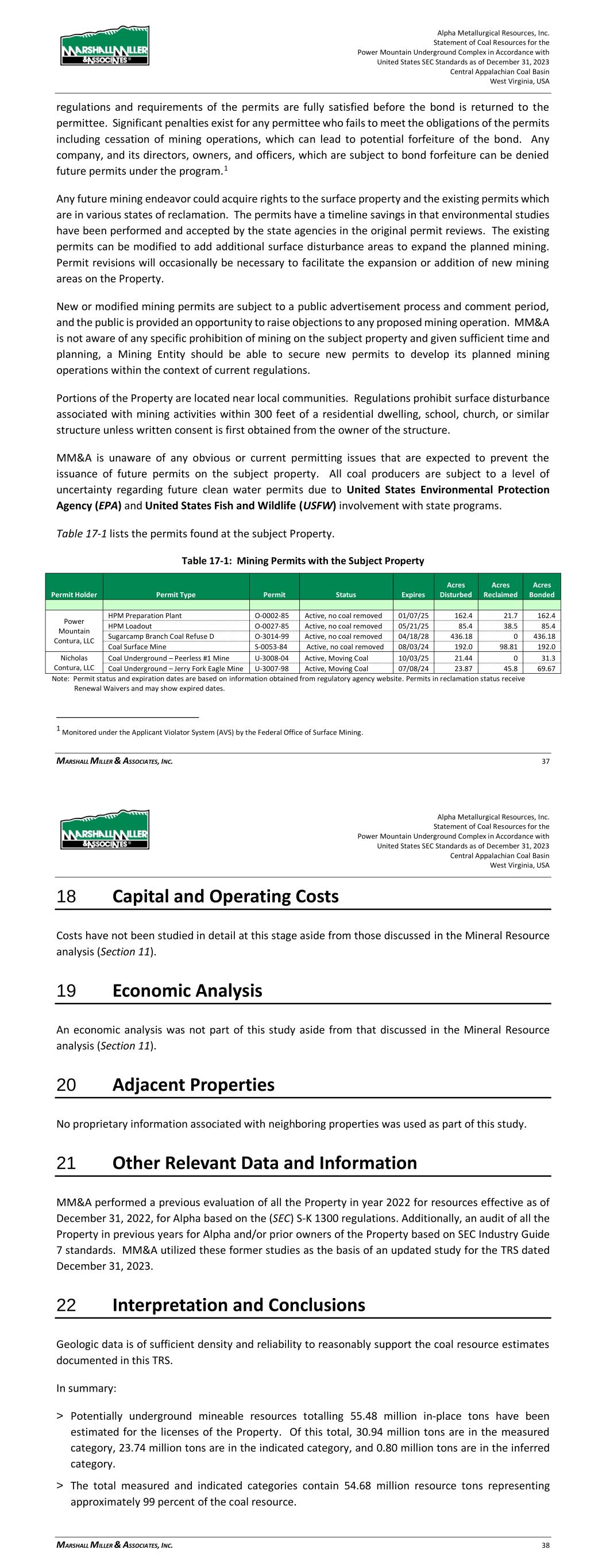 Alpha Metallurgical Resources, Inc. Statement of Coal Resources for the Power Mountain Underground Complex in Accordance with United States SEC Standards as of December 31, 2023 Central Appalachian Coal Basin West Virginia, USA MARSHALL MILLER & ASSOCIATES, INC. 37 regulations and requirements of the permits are fully satisfied before the bond is returned to the permittee. Significant penalties exist for any permittee who fails to meet the obligations of the permits including cessation of mining operations, which can lead to potential forfeiture of the bond. Any company, and its directors, owners, and officers, which are subject to bond forfeiture can be denied future permits under the program.1 Any future mining endeavor could acquire rights to the surface property and the existing permits which are in various states of reclamation. The permits have a timeline savings in that environmental studies have been performed and accepted by the state agencies in the original permit reviews. The existing permits can be modified to add additional surface disturbance areas to expand the planned mining. Permit revisions will occasionally be necessary to facilitate the expansion or addition of new mining areas on the Property. New or modified mining permits are subject to a public advertisement process and comment period, and the public is provided an opportunity to raise objections to any proposed mining operation. MM&A is not aware of any specific prohibition of mining on the subject property and given sufficient time and planning, a Mining Entity should be able to secure new permits to develop its planned mining operations within the context of current regulations. Portions of the Property are located near local communities. Regulations prohibit surface disturbance associated with mining activities within 300 feet of a residential dwelling, school, church, or similar structure unless written consent is first obtained from the owner of the structure. MM&A is unaware of any obvious or current permitting issues that are expected to prevent the issuance of future permits on the subject property. All coal producers are subject to a level of uncertainty regarding future clean water permits due to United States Environmental Protection Agency (EPA) and United States Fish and Wildlife (USFW) involvement with state programs. Table 17-1 lists the permits found at the subject Property. Table 17-1: Mining Permits with the Subject Property Permit Holder Permit Type Permit Status Expires Acres Disturbed Acres Reclaimed Acres Bonded Power Mountain Contura, LLC HPM Preparation Plant O-0002-85 Active, no coal removed 01/07/25 162.4 21.7 162.4 HPM Loadout O-0027-85 Active, no coal removed 05/21/25 85.4 38.5 85.4 Sugarcamp Branch Coal Refuse D O-3014-99 Active, no coal removed 04/18/28 436.18 0 436.18 Coal Surface Mine S-0053-84 Active, no coal removed 08/03/24 192.0 98.81 192.0 Nicholas Contura, LLC Coal Underground – Peerless #1 Mine U-3008-04 Active, Moving Coal 10/03/25 21.44 0 31.3 Coal Underground – Jerry Fork Eagle Mine U-3007-98 Active, Moving Coal 07/08/24 23.87 45.8 69.67 Note: Permit status and expiration dates are based on information obtained from regulatory agency website. Permits in reclamation status receive Renewal Waivers and may show expired dates. 1 Monitored under the Applicant Violator System (AVS) by the Federal Office of Surface Mining. Alpha Metallurgical Resources, Inc. Statement of Coal Resources for the Power Mountain Underground Complex in Accordance with United States SEC Standards as of December 31, 2023 Central Appalachian Coal Basin West Virginia, USA MARSHALL MILLER & ASSOCIATES, INC. 38 18 Capital and Operating Costs Costs have not been studied in detail at this stage aside from those discussed in the Mineral Resource analysis (Section 11). 19 Economic Analysis An economic analysis was not part of this study aside from that discussed in the Mineral Resource analysis (Section 11). 20 Adjacent Properties No proprietary information associated with neighboring properties was used as part of this study. 21 Other Relevant Data and Information MM&A performed a previous evaluation of all the Property in year 2022 for resources effective as of December 31, 2022, for Alpha based on the (SEC) S-K 1300 regulations. Additionally, an audit of all the Property in previous years for Alpha and/or prior owners of the Property based on SEC Industry Guide 7 standards. MM&A utilized these former studies as the basis of an updated study for the TRS dated December 31, 2023. 22 Interpretation and Conclusions Geologic data is of sufficient density and reliability to reasonably support the coal resource estimates documented in this TRS. In summary: > Potentially underground mineable resources totalling 55.48 million in-place tons have been estimated for the licenses of the Property. Of this total, 30.94 million tons are in the measured category, 23.74 million tons are in the indicated category, and 0.80 million tons are in the inferred category. > The total measured and indicated categories contain 54.68 million resource tons representing approximately 99 percent of the coal resource.