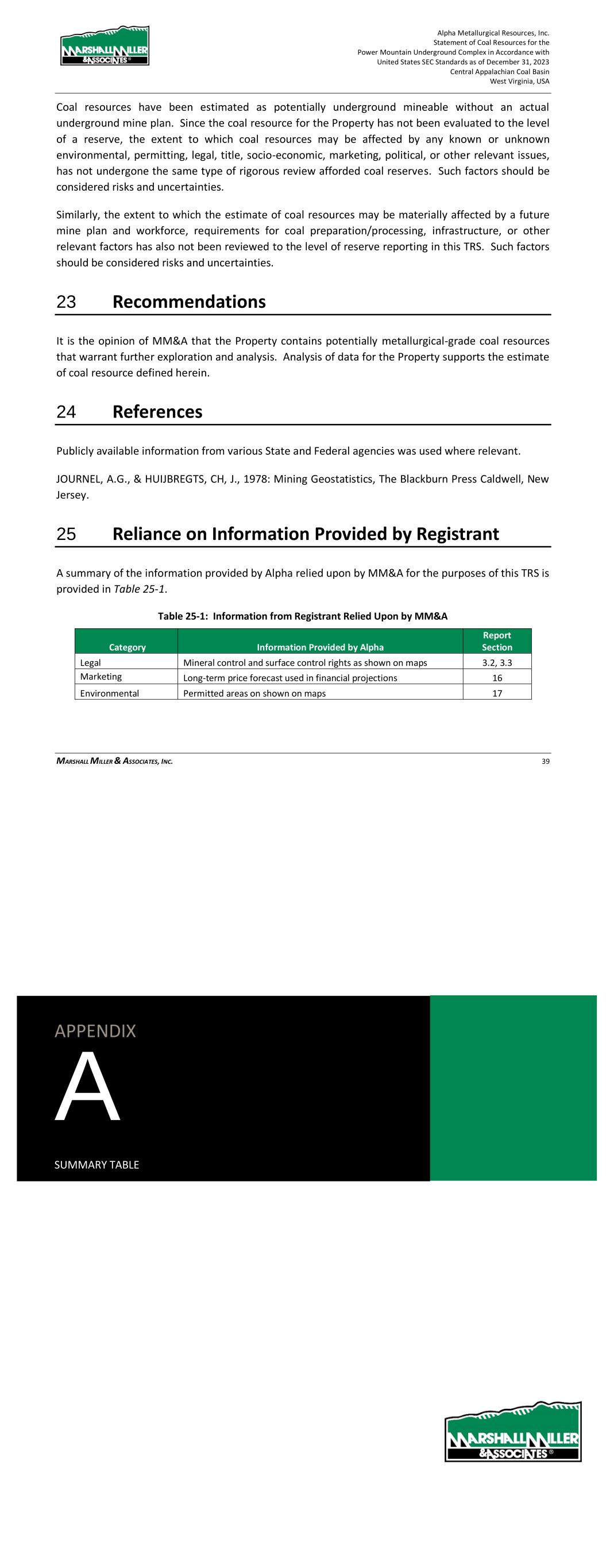 Alpha Metallurgical Resources, Inc. Statement of Coal Resources for the Power Mountain Underground Complex in Accordance with United States SEC Standards as of December 31, 2023 Central Appalachian Coal Basin West Virginia, USA MARSHALL MILLER & ASSOCIATES, INC. 39 Coal resources have been estimated as potentially underground mineable without an actual underground mine plan. Since the coal resource for the Property has not been evaluated to the level of a reserve, the extent to which coal resources may be affected by any known or unknown environmental, permitting, legal, title, socio-economic, marketing, political, or other relevant issues, has not undergone the same type of rigorous review afforded coal reserves. Such factors should be considered risks and uncertainties. Similarly, the extent to which the estimate of coal resources may be materially affected by a future mine plan and workforce, requirements for coal preparation/processing, infrastructure, or other relevant factors has also not been reviewed to the level of reserve reporting in this TRS. Such factors should be considered risks and uncertainties. 23 Recommendations It is the opinion of MM&A that the Property contains potentially metallurgical-grade coal resources that warrant further exploration and analysis. Analysis of data for the Property supports the estimate of coal resource defined herein. 24 References Publicly available information from various State and Federal agencies was used where relevant. JOURNEL, A.G., & HUIJBREGTS, CH, J., 1978: Mining Geostatistics, The Blackburn Press Caldwell, New Jersey. 25 Reliance on Information Provided by Registrant A summary of the information provided by Alpha relied upon by MM&A for the purposes of this TRS is provided in Table 25-1. Table 25-1: Information from Registrant Relied Upon by MM&A Category Information Provided by Alpha Report Section Legal Mineral control and surface control rights as shown on maps 3.2, 3.3 Marketing Long-term price forecast used in financial projections 16 Environmental Permitted areas on shown on maps 17 APPENDIX A SUMMARY TABLE