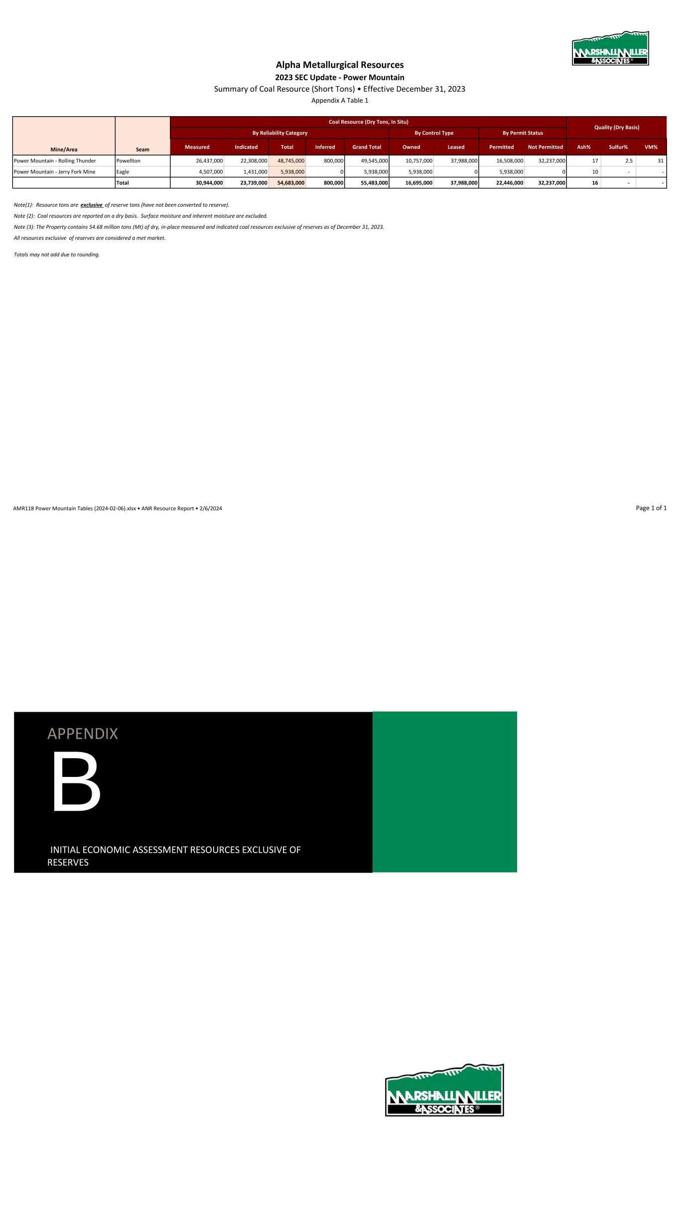 Alpha Metallurgical Resources 2023 SEC Update - Power Mountain Summary of Coal Resource (Short Tons) • Effective December 31, 2023 Appendix A Table 1 Mine/Area Seam Measured Indicated Total Inferred Grand Total Owned Leased Permitted Not Permitted Ash% Sulfur% VM% Power Mountain - Rolling Thunder Powellton 26,437,000 22,308,000 48,745,000 800,000 49,545,000 10,757,000 37,988,000 16,508,000 32,237,000 17 2.5 31 Power Mountain - Jerry Fork Mine Eagle 4,507,000 1,431,000 5,938,000 0 5,938,000 5,938,000 0 5,938,000 0 10 - - Total 30,944,000 23,739,000 54,683,000 800,000 55,483,000 16,695,000 37,988,000 22,446,000 32,237,000 16 - - Note(1): Resource tons are exclusive of reserve tons (have not been converted to reserve). Note (2): Coal resources are reported on a dry basis. Surface moisture and inherent moisture are excluded. Note (3): The Property contains 54.68 million tons (Mt) of dry, in-place measured and indicated coal resources exclusive of reserves as of December 31, 2023. All resources exclusive of reserves are considered a met market. Totals may not add due to rounding. Coal Resource (Dry Tons, In Situ) Quality (Dry Basis) By Reliability Category By Control Type By Permit Status AMR118 Power Mountain Tables (2024-02-06).xlsx • ANR Resource Report • 2/6/2024 Page 1 of 1 APPENDIX B INITIAL ECONOMIC ASSESSMENT RESOURCES EXCLUSIVE OF RESERVES