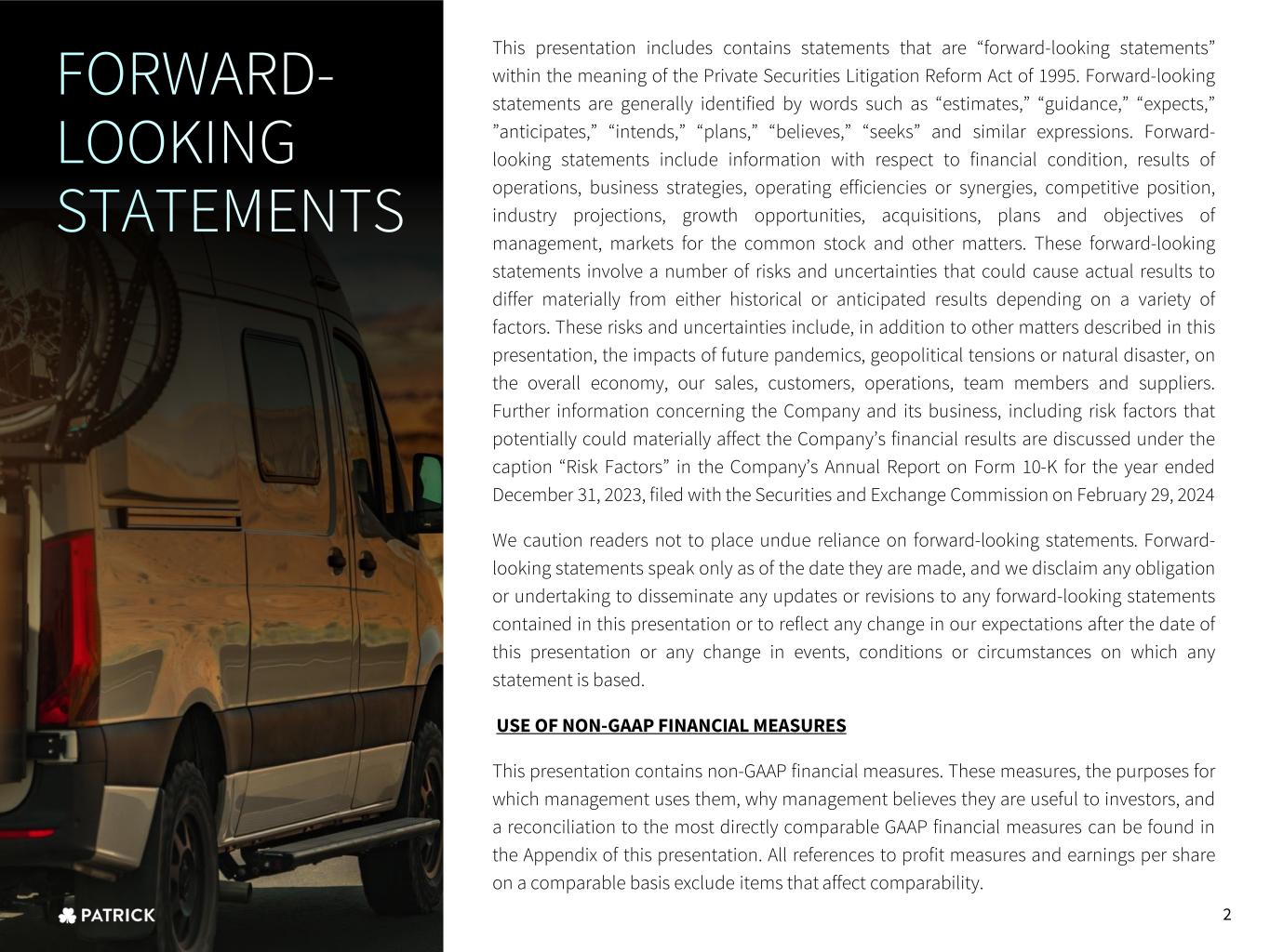 This presentation includes contains statements that are “forward-looking statements” within the meaning of the Private Securities Litigation Reform Act of 1995. Forward-looking statements are generally identified by words such as “estimates,” “guidance,” “expects,” ”anticipates,” “intends,” “plans,” “believes,” “seeks” and similar expressions. Forward- looking statements include information with respect to financial condition, results of operations, business strategies, operating efficiencies or synergies, competitive position, industry projections, growth opportunities, acquisitions, plans and objectives of management, markets for the common stock and other matters. These forward-looking statements involve a number of risks and uncertainties that could cause actual results to differ materially from either historical or anticipated results depending on a variety of factors. These risks and uncertainties include, in addition to other matters described in this presentation, the impacts of future pandemics, geopolitical tensions or natural disaster, on the overall economy, our sales, customers, operations, team members and suppliers. Further information concerning the Company and its business, including risk factors that potentially could materially affect the Company’s financial results are discussed under the caption “Risk Factors” in the Company’s Annual Report on Form 10-K for the year ended December 31, 2023, filed with the Securities and Exchange Commission on February 29, 2024 We caution readers not to place undue reliance on forward-looking statements. Forward- looking statements speak only as of the date they are made, and we disclaim any obligation or undertaking to disseminate any updates or revisions to any forward-looking statements contained in this presentation or to reflect any change in our expectations after the date of this presentation or any change in events, conditions or circumstances on which any statement is based. USE OF NON-GAAP FINANCIAL MEASURES This presentation contains non-GAAP financial measures. These measures, the purposes for which management uses them, why management believes they are useful to investors, and a reconciliation to the most directly comparable GAAP financial measures can be found in the Appendix of this presentation. All references to profit measures and earnings per share on a comparable basis exclude items that affect comparability. FORWARD- LOOKING STATEMENTS 2