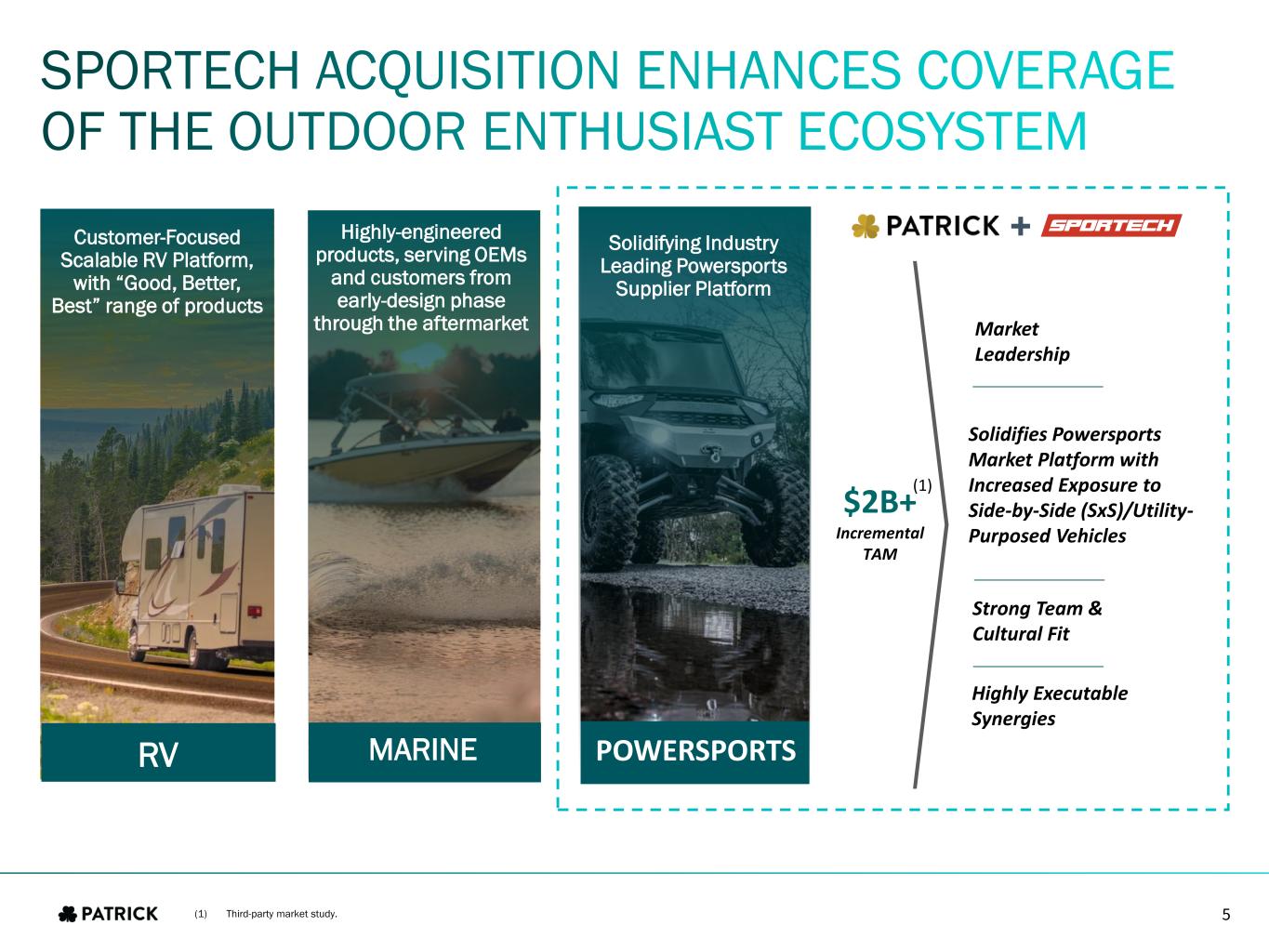 POWERSPORTS Sportech acquisition provides a unique opportunity to capitalize on strong organic growth in the expanding SxS/UTV market and unlocks a new M&A landscape to add depth and dimension to Patrick’s powersports Complementary Product Portfolio and Capabilities Across Powersports, Marine and RV Markets STORAGE, BUMPERS/GUARDS & LIGHTING AUDIO Opportunity to provide relevant adjacent product categories through Sportech’s powersports channels Existing Audio Upgrades Offered by Leading OEMs MARINE & RV Lock & Ride Bed Extender LED Headlight Kit Front Brushguard Lock & Ride Gun Rack 6 Dual-Row LED Flood Light Rock Guard with Step Leverage Sportech’s capabilities across Patrick’s end markets Audio Roof Full Audio System Audio Upgrade Marine Windshield Plexiglass Side Console Door Vents Exterior Storage Pontoon Windshield 30