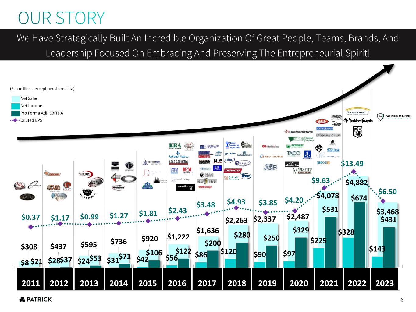 $308 $437 $595 $736 $920 $1,222 $1,636 $2,263 $2,337 $2,487 $4,078 $4,882 $3,468 2011 2012 2013 2014 2015 2016 2017 2018 2019 2020 2021 2022 Q1 23 TTm $8 $28 $24 $31 $42 $56 $86 $120 $90 $97 $225 $328 $143 $21 $37 $53 $71 $106 $122 $200 $280 $250 $329 $531 $674 $431 $0.37 $1.17 $0.99 $1.27 $1.81 $2.43 $3.48 $4.93 $3.85 $4.20 $9.63 $13.49 $6.50 2011 2012 2013 2014 2015 2016 2017 2018 2019 2020 2021 2022 Q1 2023 TTM Net Sales Net Income Pro Forma Adj. EBITDA Diluted EPS We Have Strategically Built An Incredible Organization Of Great People, Teams, Brands, And Leadership Focused On Embracing And Preserving The Entrepreneurial Spirit! ($ in millions, except per share data) OUR STORY 2011 2012 2013 2014 2015 2016 2017 2018 2019 2020 2021 2022 2023 6