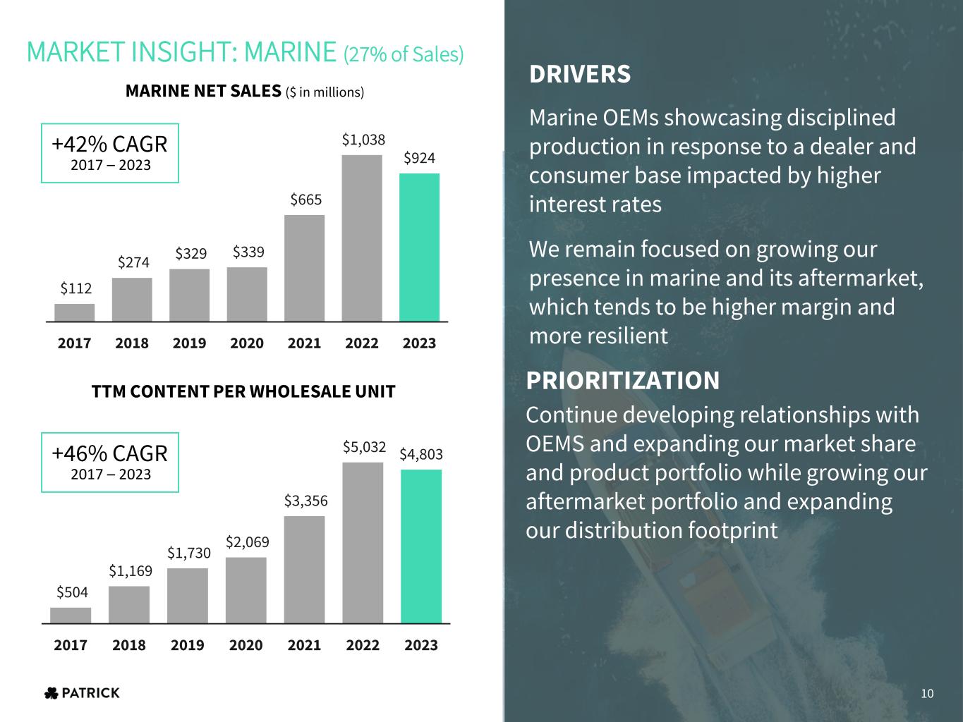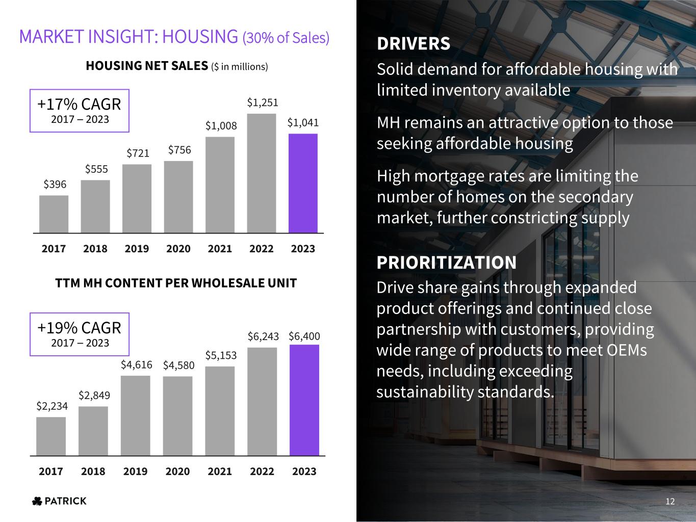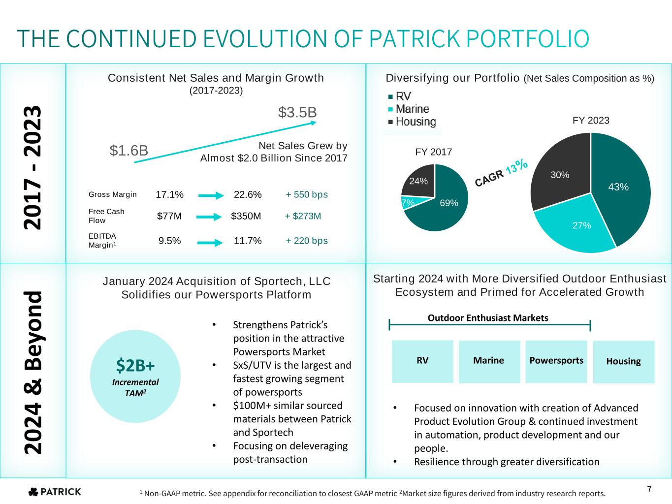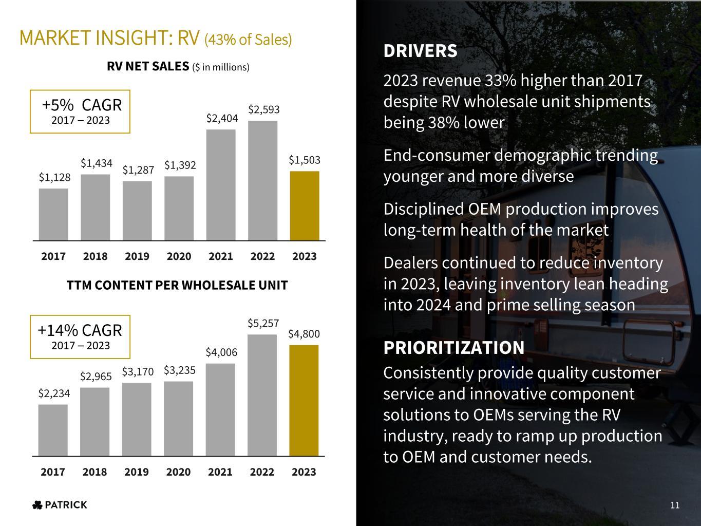 LEADERSHIP IN THE MARKETS WE SERVE RV MARINE HOUSING PATRICK Sales by End Market 43% 27% 30% FY 2023 RV HOUSING MARINE 69% 7% 24% FY 2017 Extensive Supplier to OEMs with Growing Aftermarket Presence Strong OEM Relationships Built Through Customer Service and Scalability $3.5B $1.6B Leading Component Solutions Provider to OEMs 43% 2023 net sales 27% 2023 net sales 30% 2023 net sales 4