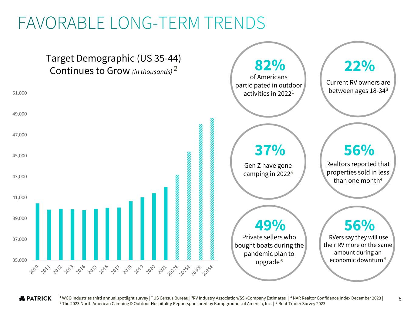 FAVORABLE LONG-TERM TRENDS 1 WGO Industries third annual spotlight survey | 2 US Census Bureau | 3RV Industry Association/SSI/Company Estimates | 4 NAR Realtor Confidence Index December 2023 | 5 The 2023 North American Camping & Outdoor Hospitality Report sponsored by Kampgrounds of America, Inc. | 6 Boat Trader Survey 2023 Target Demographic (US 35-44) Continues to Grow (in thousands) 2 of Americans participated in outdoor activities in 20221 82% Current RV owners are between ages 18-343 22% Gen Z have gone camping in 20225 37% Realtors reported that properties sold in less than one month4 56% Private sellers who bought boats during the pandemic plan to upgrade 6 49% RVers say they will use their RV more or the same amount during an economic downturn 5 56% 35,000 37,000 39,000 41,000 43,000 45,000 47,000 49,000 51,000 8