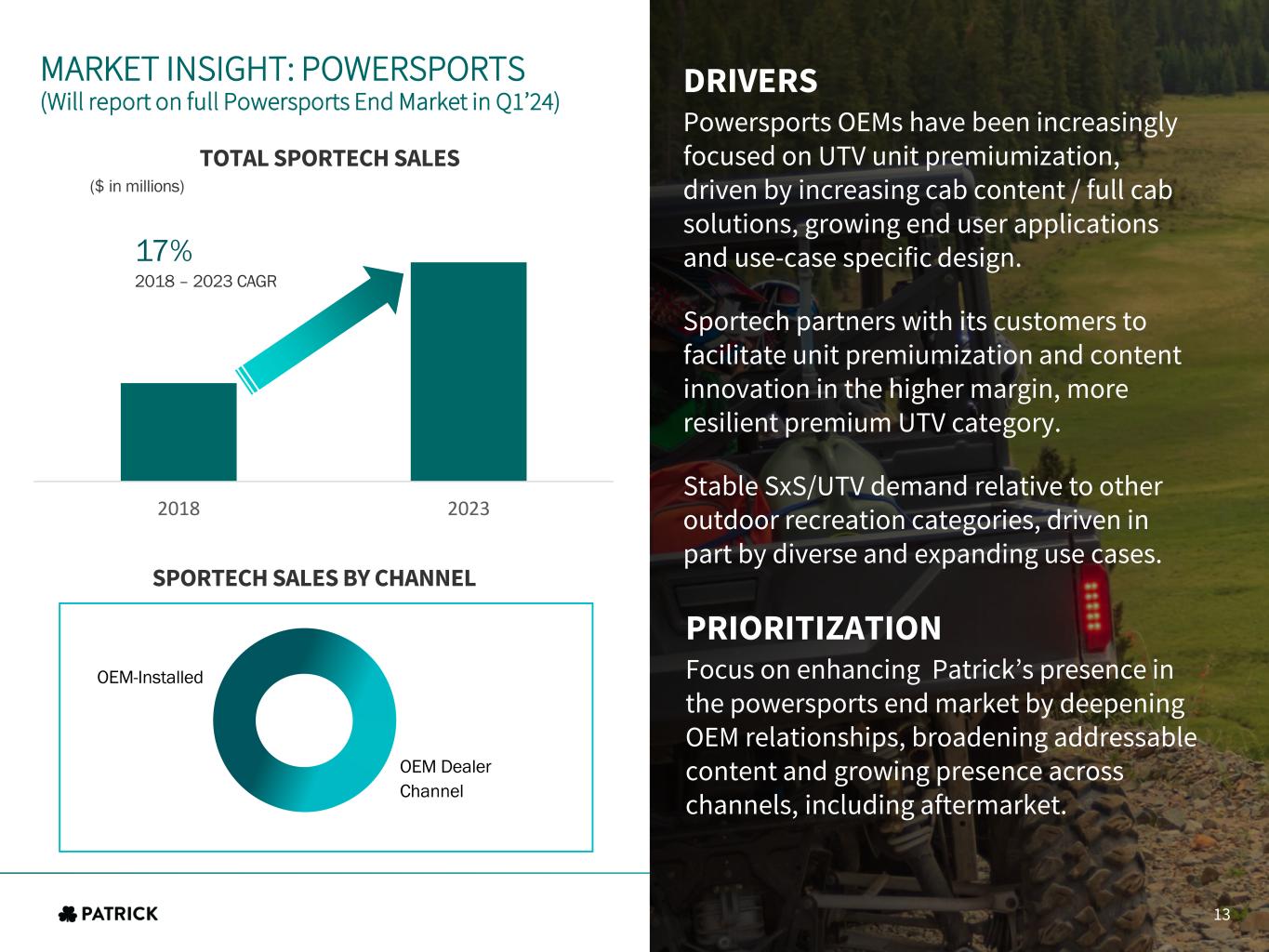 2018 2023 DRIVERS Powersports OEMs have been increasingly focused on UTV unit premiumization, driven by increasing cab content / full cab solutions, growing end user applications and use-case specific design. Sportech partners with its customers to facilitate unit premiumization and content innovation in the higher margin, more resilient premium UTV category. Stable SxS/UTV demand relative to other outdoor recreation categories, driven in part by diverse and expanding use cases. PRIORITIZATION Focus on enhancing Patrick’s presence in the powersports end market by deepening OEM relationships, broadening addressable content and growing presence across channels, including aftermarket. TOTAL SPORTECH SALES ($ in millions) 17% 2018 – 2023 CAGR SPORTECH SALES BY CHANNEL OEM Dealer Channel OEM-Installed MARKET INSIGHT: POWERSPORTS (Will report on full Powersports End Market in Q1’24) 13