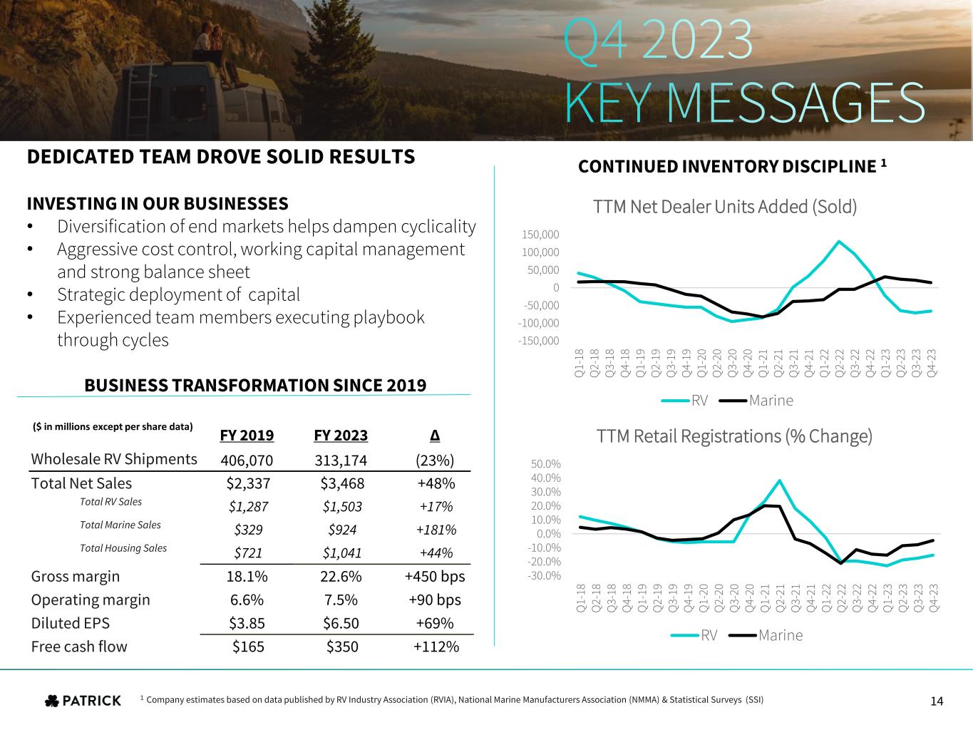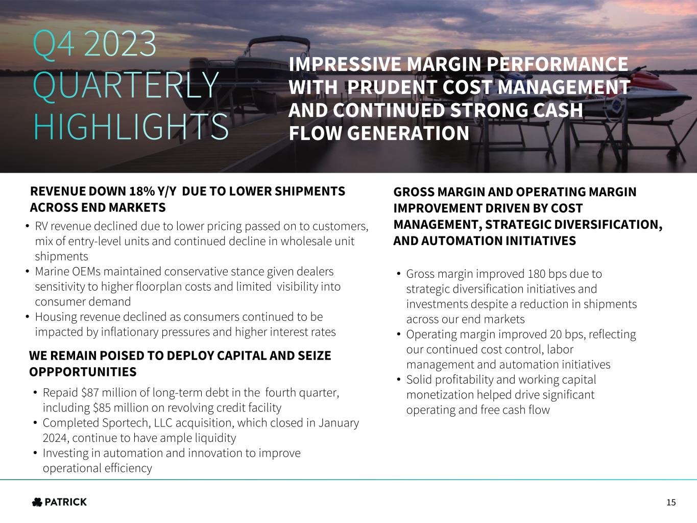 DEDICATED TEAM DROVE SOLID RESULTS INVESTING IN OUR BUSINESSES • Diversification of end markets helps dampen cyclicality • Aggressive cost control, working capital management and strong balance sheet • Strategic deployment of capital • Experienced team members executing playbook through cycles BUSINESS TRANSFORMATION SINCE 2019 Q4 2023 KEY MESSAGES FY 2019 FY 2023 Δ Wholesale RV Shipments 406,070 313,174 (23%) Total Net Sales $2,337 $3,468 +48% Total RV Sales $1,287 $1,503 +17% Total Marine Sales $329 $924 +181% Total Housing Sales $721 $1,041 +44% Gross margin 18.1% 22.6% +450 bps Operating margin 6.6% 7.5% +90 bps Diluted EPS $3.85 $6.50 +69% Free cash flow $165 $350 +112% CONTINUED INVENTORY DISCIPLINE 1 ($ in millions except per share data) -150,000 -100,000 -50,000 0 50,000 100,000 150,000 Q 1- 18 Q 2- 18 Q 3- 18 Q 4- 18 Q 1- 19 Q 2- 19 Q 3- 19 Q 4- 19 Q 1- 20 Q 2- 20 Q 3- 20 Q 4- 20 Q 1- 21 Q 2- 21 Q 3- 21 Q 4- 21 Q 1- 22 Q 2- 22 Q 3- 22 Q 4- 22 Q 1- 23 Q 2- 23 Q 3- 23 Q 4- 23 TTM Net Dealer Units Added (Sold) RV Marine -30.0% -20.0% -10.0% 0.0% 10.0% 20.0% 30.0% 40.0% 50.0% Q 1- 18 Q 2- 18 Q 3- 18 Q 4- 18 Q 1- 19 Q 2- 19 Q 3- 19 Q 4- 19 Q 1- 20 Q 2- 20 Q 3- 20 Q 4- 20 Q 1- 21 Q 2- 21 Q 3- 21 Q 4- 21 Q 1- 22 Q 2- 22 Q 3- 22 Q 4- 22 Q 1- 23 Q 2- 23 Q 3- 23 Q 4- 23 TTM Retail Registrations (% Change) RV Marine 1 Company estimates based on data published by RV Industry Association (RVIA), National Marine Manufacturers Association (NMMA) & Statistical Surveys (SSI) 14