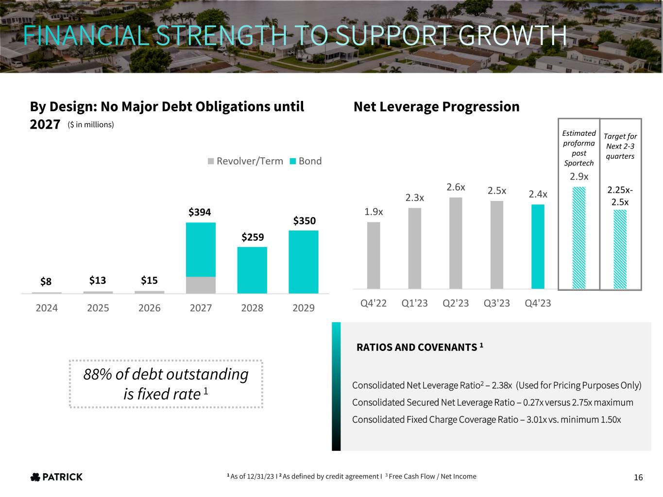 Q4 2023 QUARTERLY HIGHLIGHTS • RV revenue declined due to lower pricing passed on to customers, mix of entry-level units and continued decline in wholesale unit shipments • Marine OEMs maintained conservative stance given dealers sensitivity to higher floorplan costs and limited visibility into consumer demand • Housing revenue declined as consumers continued to be impacted by inflationary pressures and higher interest rates REVENUE DOWN 18% Y/Y DUE TO LOWER SHIPMENTS ACROSS END MARKETS IMPRESSIVE MARGIN PERFORMANCE WITH PRUDENT COST MANAGEMENT AND CONTINUED STRONG CASH FLOW GENERATION • Repaid $87 million of long-term debt in the fourth quarter, including $85 million on revolving credit facility • Completed Sportech, LLC acquisition, which closed in January 2024, continue to have ample liquidity • Investing in automation and innovation to improve operational efficiency WE REMAIN POISED TO DEPLOY CAPITAL AND SEIZE OPPPORTUNITIES • Gross margin improved 180 bps due to strategic diversification initiatives and investments despite a reduction in shipments across our end markets • Operating margin improved 20 bps, reflecting our continued cost control, labor management and automation initiatives • Solid profitability and working capital monetization helped drive significant operating and free cash flow GROSS MARGIN AND OPERATING MARGIN IMPROVEMENT DRIVEN BY COST MANAGEMENT, STRATEGIC DIVERSIFICATION, AND AUTOMATION INITIATIVES 15