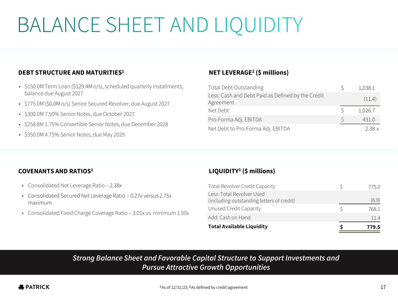 3 Team members 10,000 Years of Success 65 Facilities 250+ 2023 Revenue $3.5B 2023 Diluted EPS $6.50 Pro Forma Adjusted EBITDA $431M1 Free Cash Flow $350M1 Liquidity $780M Total Net Leverage 2.4x1,2 1 Non-GAAP metric. See appendix for reconciliation to closest GAAP metric | 2 As defined by credit agreement 2023 Highlights Value Proposition PATRICK AT A GLANCE TRICK AT A GLANCE Patrick’s goal is to improve the quality of everyday life through better component products and building materials. We deliver on this promise by building strong relationships with partners and team members based on trust and proven performance. 3