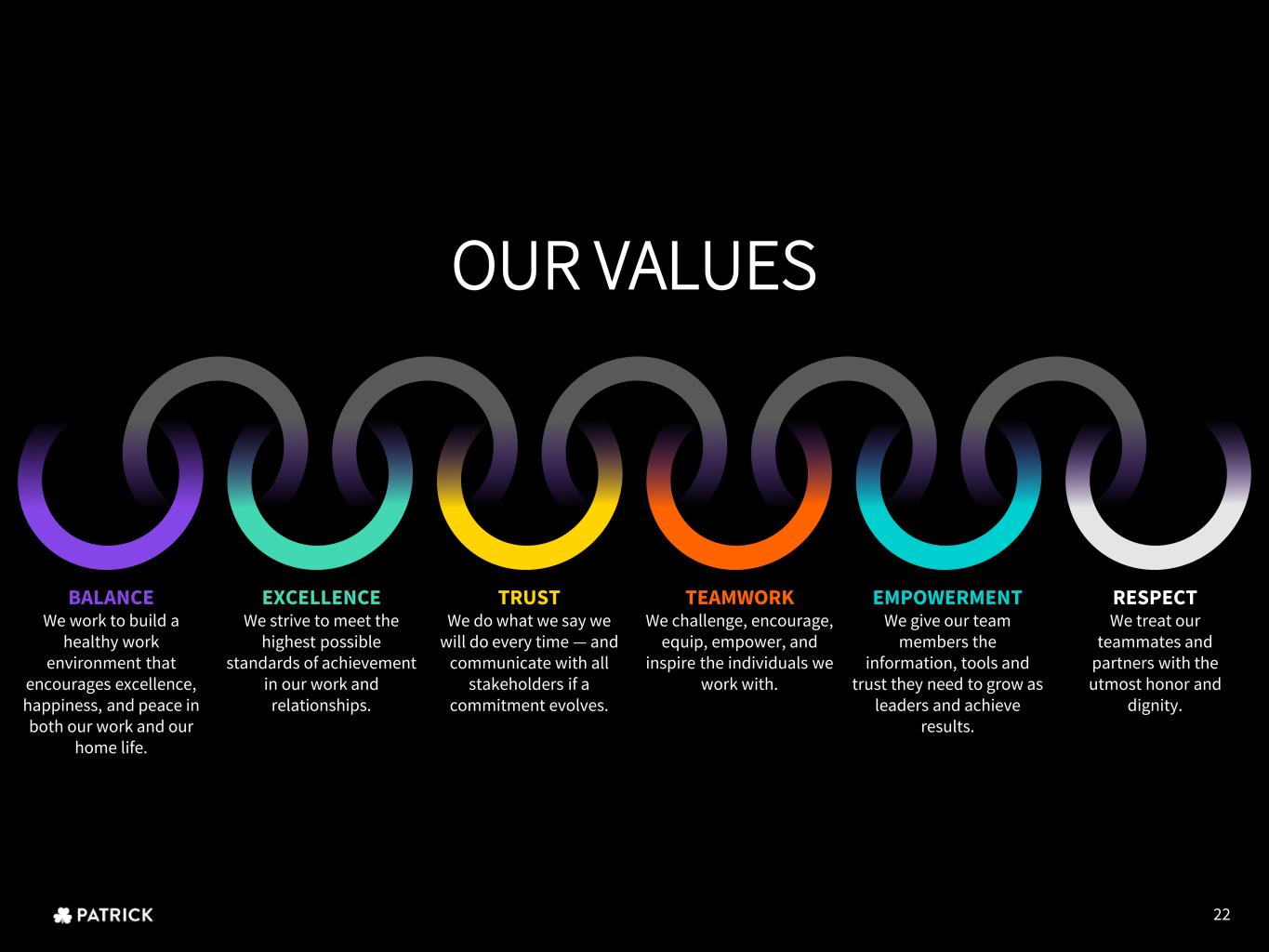 BALANCE We work to build a healthy work environment that encourages excellence, happiness, and peace in both our work and our home life. EXCELLENCE We strive to meet the highest possible standards of achievement in our work and relationships. TRUST We do what we say we will do every time — and communicate with all stakeholders if a commitment evolves. TEAMWORK We challenge, encourage, equip, empower, and inspire the individuals we work with. EMPOWERMENT We give our team members the information, tools and trust they need to grow as leaders and achieve results. RESPECT We treat our teammates and partners with the utmost honor and dignity. OUR VALUES 22