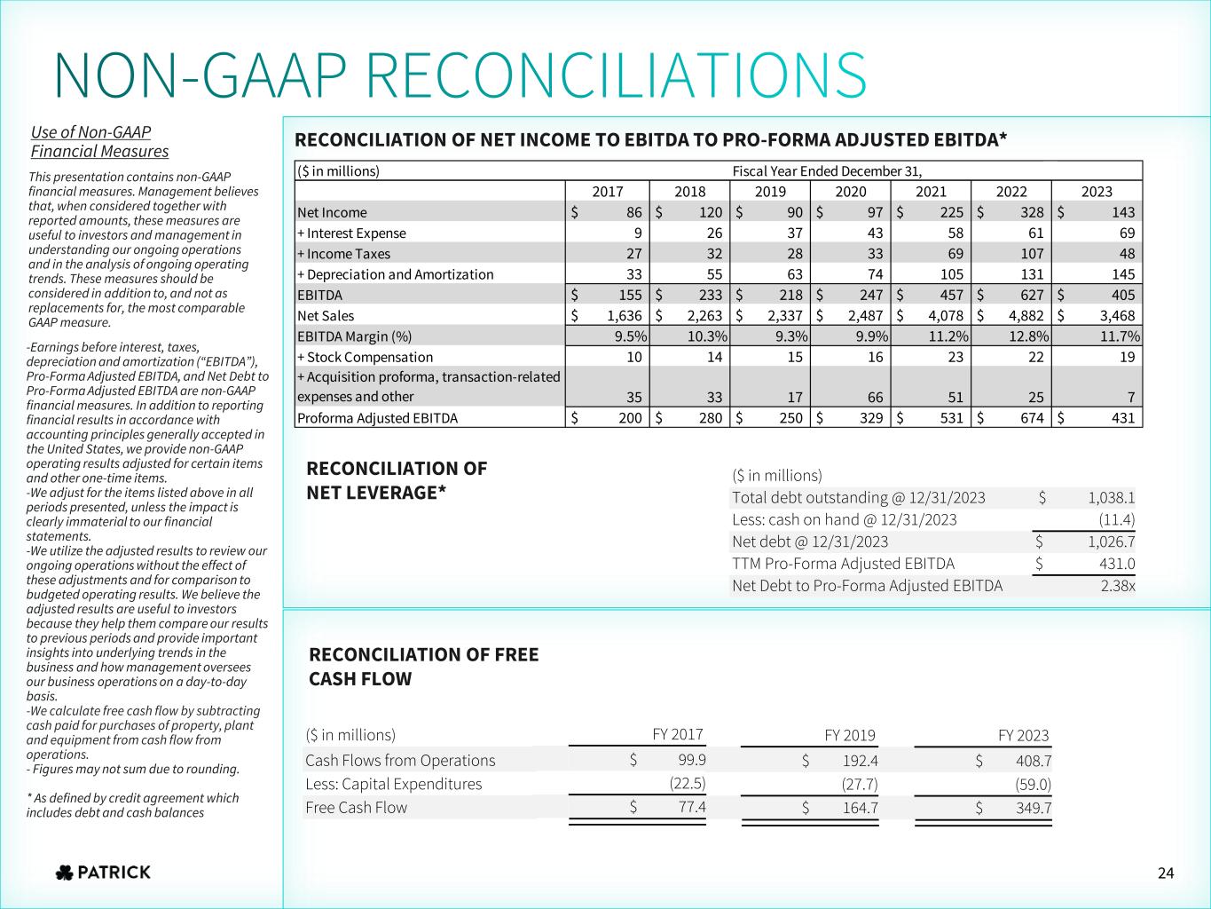 RECONCILIATION OF NET LEVERAGE* -Earnings before interest, taxes, depreciation and amortization (“EBITDA”), Pro-Forma Adjusted EBITDA, and Net Debt to Pro-Forma Adjusted EBITDA are non-GAAP financial measures. In addition to reporting financial results in accordance with accounting principles generally accepted in the United States, we provide non-GAAP operating results adjusted for certain items and other one-time items. -We adjust for the items listed above in all periods presented, unless the impact is clearly immaterial to our financial statements. -We utilize the adjusted results to review our ongoing operations without the effect of these adjustments and for comparison to budgeted operating results. We believe the adjusted results are useful to investors because they help them compare our results to previous periods and provide important insights into underlying trends in the business and how management oversees our business operations on a day-to-day basis. -We calculate free cash flow by subtracting cash paid for purchases of property, plant and equipment from cash flow from operations. - Figures may not sum due to rounding. * As defined by credit agreement which includes debt and cash balances RECONCILIATION OF NET INCOME TO EBITDA TO PRO-FORMA ADJUSTED EBITDA* RECONCILIATION OF FREE CASH FLOW NON-GAAP RECONCILIATIONS Use of Non-GAAP Financial Measures This presentation contains non-GAAP financial measures. Management believes that, when considered together with reported amounts, these measures are useful to investors and management in understanding our ongoing operations and in the analysis of ongoing operating trends. These measures should be considered in addition to, and not as replacements for, the most comparable GAAP measure. ($ in millions) Total debt outstanding @ 12/31/2023 $ 1,038.1 Less: cash on hand @ 12/31/2023 (11.4) Net debt @ 12/31/2023 $ 1,026.7 TTM Pro-Forma Adjusted EBITDA $ 431.0 Net Debt to Pro-Forma Adjusted EBITDA 2.38x ($ in millions) Cash Flows from Operations Less: Capital Expenditures Free Cash Flow 24 FY 2019 $ 192.4 (27.7) $ 164.7 FY 2017 $ 99.9 (22.5) $ 77.4 ($ in millions) Fiscal Year Ended December 31, Net Income $ 86 $ 120 $ 90 $ 97 $ 225 $ 328 $ 143 + Interest Expense 9 26 37 43 58 61 69 + Income Taxes 27 32 28 33 69 107 48 + Depreciation and Amortization 33 55 63 74 105 131 145 EBITDA $ 155 $ 233 $ 218 $ 247 $ 457 $ 627 $ 405 Net Sales $ 1,636 $ 2,263 $ 2,337 $ 2,487 $ 4,078 $ 4,882 $ 3,468 EBITDA Margin (%) 9.5% 10.3% 9.3% 9.9% 11.2% 12.8% 11.7% + Stock Compensation 10 14 15 16 23 22 19 + Acquisition proforma, transaction-related expenses and other 35 33 17 66 51 25 7 Proforma Adjusted EBITDA $ 200 $ 280 $ 250 $ 329 $ 531 $ 674 $ 431 20232017 2018 2019 2020 2021 2022 FY 2023 $ 408.7 (59.0) $ 349.7