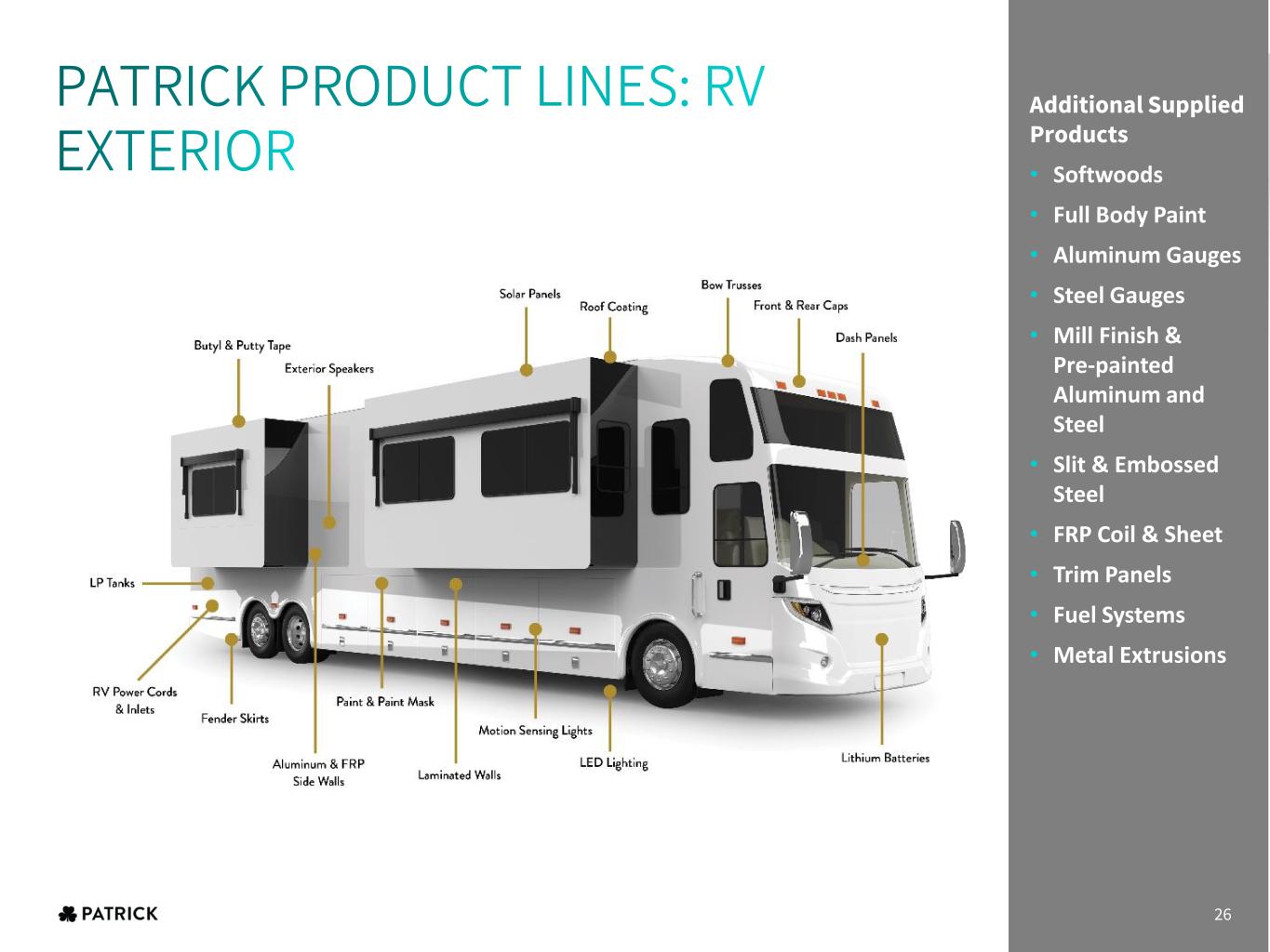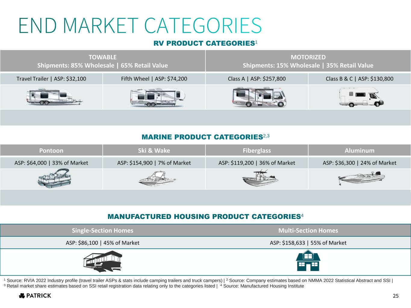 Single-Section Homes Multi-Section Homes ASP: $86,100 | 45% of Market ASP: $158,633 | 55% of Market TOWABLE Shipments: 85% Wholesale | 65% Retail Value MOTORIZED Shipments: 15% Wholesale | 35% Retail Value Travel Trailer | ASP: $32,100 Fifth Wheel | ASP: $74,200 Class A | ASP: $257,800 Class B & C | ASP: $130,800 RV PRODUCT CATEGORIES1 Pontoon Ski & Wake Fiberglass Aluminum ASP: $64,000 | 33% of Market ASP: $154,900 | 7% of Market ASP: $119,200 | 36% of Market ASP: $36,300 | 24% of Market U.S Expenditures on Boats, Engines, and Accessories Totaled $xxB in 2019 MARINE PRODUCT CATEGORIES2,3 MANUFACTURED HOUSING PRODUCT CATEGORIES4 1 Source: RVIA 2022 Industry profile (travel trailer ASPs & stats include camping trailers and truck campers) | 2 Source: Company estimates based on NMMA 2022 Statistical Abstract and SSI | 3 Retail market share estimates based on SSI retail registration data relating only to the categories listed | 4 Source: Manufactured Housing Institute END MARKET CATEGORIES 25