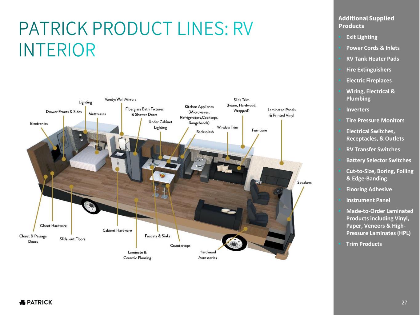 PATRICK PRODUCT LINES: RV EXTERIOR Additional Supplied Products • Softwoods • Full Body Paint • Aluminum Gauges • Steel Gauges • Mill Finish & Pre-painted Aluminum and Steel • Slit & Embossed Steel • FRP Coil & Sheet • Trim Panels • Fuel Systems • Metal Extrusions 26