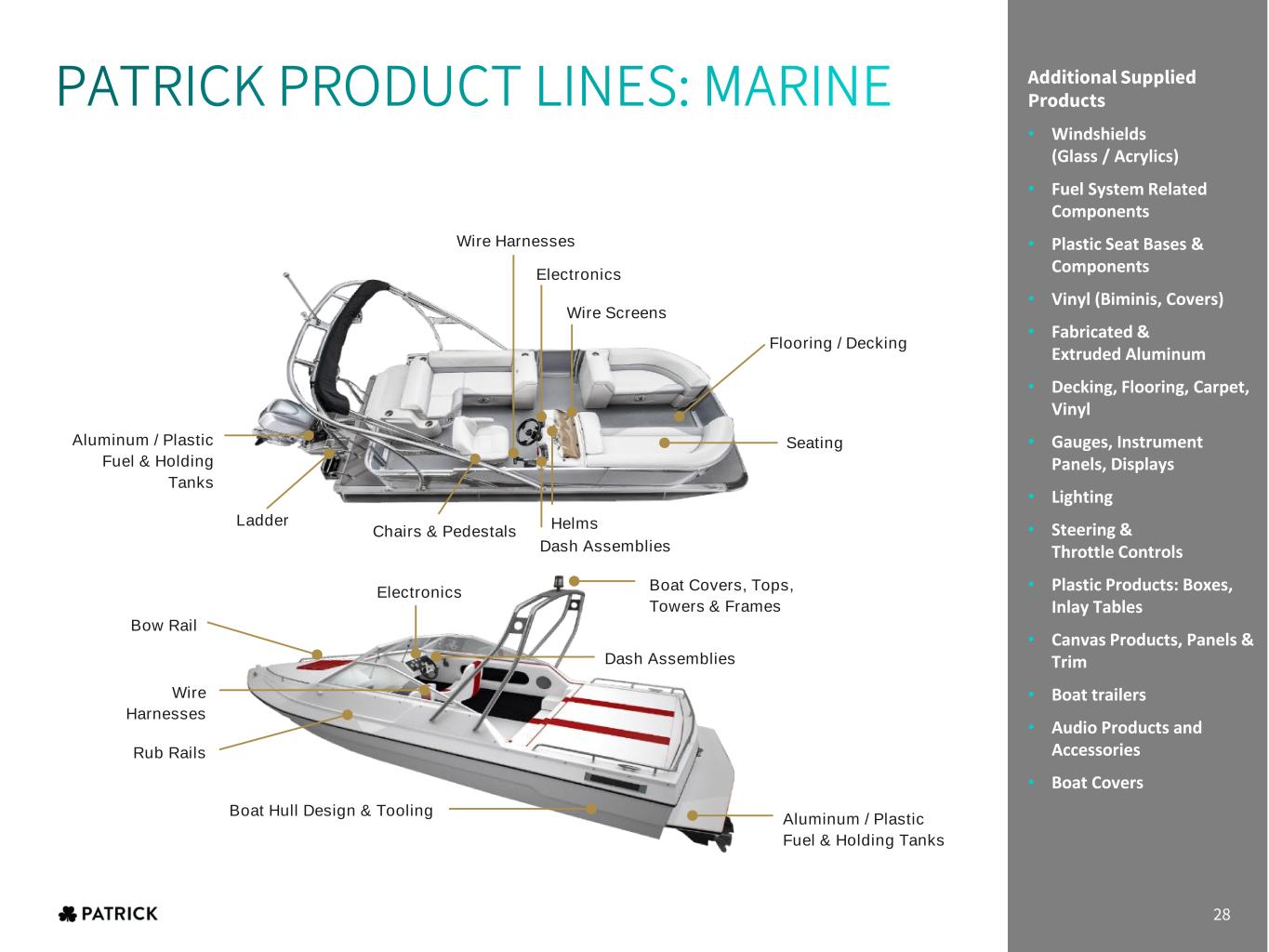 Additional Supplied Products ✓ Softwoods ✓ Full Body Paint ✓ Aluminum Gauges ✓ Steel Gauges ✓ Mill Finish & Pre-painted Aluminum and Steel ✓ Slit & Embossed Steel ✓ FRP Coil & Sheet ✓ Trim Panels ✓ Fuel Systems ✓ Metal Extrusions Aluminum / Plastic Fuel & Holding Tanks Wire Harnesses Electronics Dash Assemblies Wire Screens Helms Aluminum / Plastic Fuel & Holding Tanks Boat Hull Design & Tooling Wire Harnesses Dash Assemblies Electronics Boat Covers, Tops, Towers & Frames Ladder Chairs & Pedestals Rub Rails Bow Rail Flooring / Decking Seating PATRICK PRODUCT LINES: MARINE Additional Supplied Products • Windshields (Glass / Acrylics) • Fuel System Related Components • Plastic Seat Bases & Components • Vinyl (Biminis, Covers) • Fabricated & Extruded Aluminum • Decking, Flooring, Carpet, Vinyl • Gauges, Instrument Panels, Displays • Lighting • Steering & Throttle Controls • Plastic Products: Boxes, Inlay Tables • Canvas Products, Panels & Trim • Boat trailers • Audio Products and Accessories • Boat Covers 28