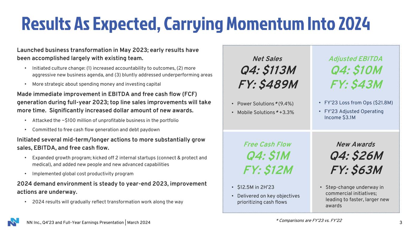 NN Inc., Q4’23 and Full-Year Earnings Presentation | March 2024 2 Forward Looking Statement & Disclosures Except for specific historical information, many of the matters discussed in this press release may express or imply projections of revenues or expenditures, statements of plans and objectives or future operations or statements of future economic performance. These statements may discuss goals, intentions and expectations as to future trends, plans, events, results of operations or financial condition, or state other information relating to NN, Inc. (the “Company”) based on current beliefs of management as well as assumptions made by, and information currently available to, management. Forward-looking statements generally will be accompanied by words such as “anticipate,” “believe,” “could,” “estimate,” “expect,” “forecast,” “guidance,” “intend,” “may,” “possible,” “potential,” “predict,” “project” or other similar words, phrases or expressions. Forward-looking statements involve a number of risks and uncertainties that are outside of management’s control and that may cause actual results to be materially different from such forward-looking statements. Such factors include, among others, general economic conditions and economic conditions in the industrial sector; the impacts of pandemics, epidemics, disease outbreaks and other public health crises, on our financial condition, business operations and liquidity; competitive influences; risks that current customers will commence or increase captive production; risks of capacity underutilization; quality issues; material changes in the costs and availability of raw materials; economic, social, political and geopolitical instability, military conflict, currency fluctuation, and other risks of doing business outside of the United States; inflationary pressures and changes in the cost or availability of materials, supply chain shortages and disruptions, the availability of labor and labor disruptions along the supply chain; our dependence on certain major customers, some of whom are not parties to long-term agreements (and/or are terminable on short notice); the impact of acquisitions and divestitures, as well as expansion of end markets and product offerings; our ability to hire or retain key personnel; the level of our indebtedness; the restrictions contained in our debt agreements; our ability to obtain financing at favorable rates, if at all, and to refinance existing debt as it matures; new laws and governmental regulations; the impact of climate change on our operations; and cyber liability or potential liability for breaches of our or our service providers’ information technology systems or business operations disruptions. The foregoing factors should not be construed as exhaustive and should be read in conjunction with the sections entitled “Risk Factors” and “Management’s Discussion and Analysis of Financial Condition and Results of Operations” included in the Company’s filings made with the Securities and Exchange Commission. Any forward-looking statement speaks only as of the date of this press release, and the Company undertakes no obligation to publicly update or review any forward-looking statement, whether as a result of new information, future developments or otherwise, except as required by law. New risks and uncertainties may emerge from time to time, and it is not possible for the Company to predict their occurrence or how they will affect the Company. The Company qualifies all forward-looking statements by these cautionary statements. With respect to any non-GAAP financial measures included in the following presentation, the accompanying information required by SEC Regulation G can be found at the back of this presentation or in the “Investors” section of the Company’s web site, www.nninc.com, under the heading “News & Events” and subheading “Presentations.”