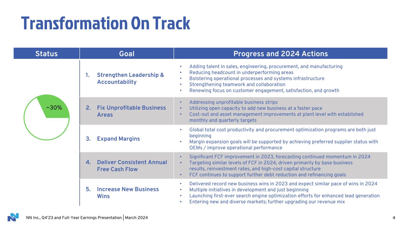 “Our fourth quarter results capped off a transformative year for NN Inc., a year in which we realigned our commercial and operational strategies to deliver improved returns and to better position the company for both short-term and long-term success,” said Harold Bevis, President and Chief Executive Officer. “In 2023, we launched a multi-year transformation and our revamped leadership team’s aggressive redirected approach is already making a clear impact on our financial and operational results, as evidenced by the strengthening of our margins, improved free cash flow performance, and accelerating sales growth. Additionally, we reset the bar on customer performance and already we are performing better with our customers. This is a tried and true path to future business expansion. We are really proud of our global team and our JV business as we are working as one team to reestablish leadership positions in multiple areas.”