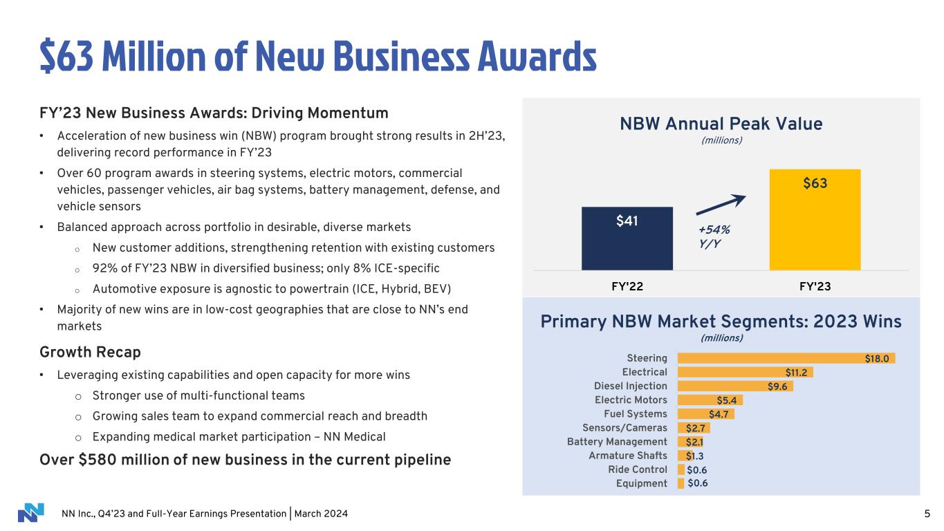 NN Inc., Q4’23 and Full-Year Earnings Presentation | March 2024 4 Status Goal Progress and 2024 Actions 1. Strengthen Leadership & Accountability • Adding talent in sales, engineering, procurement, and manufacturing • Reducing headcount in underperforming areas • Bolstering operational processes and systems infrastructure • Strengthening teamwork and collaboration • Renewing focus on customer engagement, satisfaction, and growth 2. Fix Unprofitable Business Areas • Addressing unprofitable business strips • Utilizing open capacity to add new business at a faster pace • Cost-out and asset management improvements at plant level with established monthly and quarterly targets 3. Expand Margins • Global total cost productivity and procurement optimization programs are both just beginning • Margin expansion goals will be supported by achieving preferred supplier status with OEMs / improve operational performance 4. Deliver Consistent Annual Free Cash Flow • Significant FCF improvement in 2023, forecasting continued momentum in 2024 • Targeting similar levels of FCF in 2024, driven primarily by base business results, reinvestment rates, and high-cost capital structure • FCF continues to support further debt reduction and refinancing goals 5. Increase New Business Wins • Delivered record new business wins in 2023 and expect similar pace of wins in 2024 • Multiple initiatives in development and just beginning • Launching first-ever search engine optimization efforts for enhanced lead generation • Entering new and diverse markets; further upgrading our revenue mix ~30% Transformation On Track