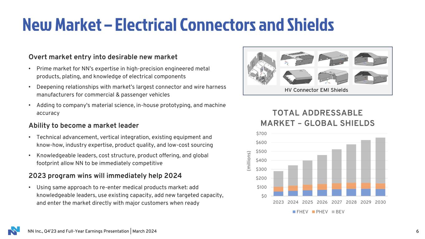 NN Inc., Q4’23 and Full-Year Earnings Presentation | March 2024 $0.6 $0.6 $1.3 $2.1 $2.7 $4.7 $5.4 $9.6 $11.2 $18.0 Equipment Ride Control Armature Shafts Battery Management Sensors/Cameras Fuel Systems Electric Motors Diesel Injection Electrical Steering 5 $63 Million of New Business Awards $41 $63 FY'22 FY'23 NBW Annual Peak Value (millions) Primary NBW Market Segments: 2023 Wins (millions) FY’23 New Business Awards: Driving Momentum • Acceleration of new business win (NBW) program brought strong results in 2H’23, delivering record performance in FY’23 • Over 60 program awards in steering systems, electric motors, commercial vehicles, passenger vehicles, air bag systems, battery management, defense, and vehicle sensors • Balanced approach across portfolio in desirable, diverse markets o New customer additions, strengthening retention with existing customers o 92% of FY’23 NBW in diversified business; only 8% ICE-specific o Automotive exposure is agnostic to powertrain (ICE, Hybrid, BEV) • Majority of new wins are in low-cost geographies that are close to NN’s end markets Growth Recap • Leveraging existing capabilities and open capacity for more wins o Stronger use of multi-functional teams o Growing sales team to expand commercial reach and breadth o Expanding medical market participation – NN Medical Over $580 million of new business in the current pipeline +54% Y/Y