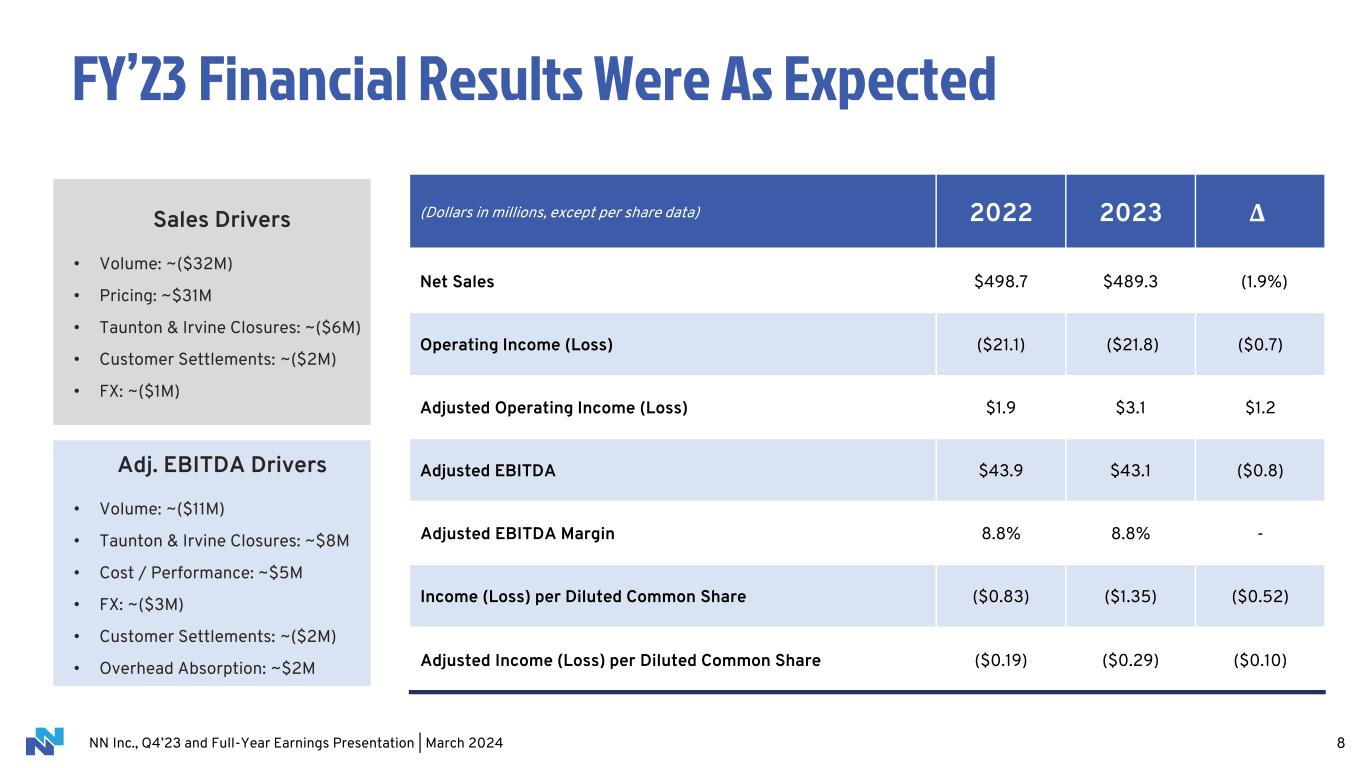 NN Inc., Q4’23 and Full-Year Earnings Presentation | March 2024 7 Q4’23 Financial Results Were As Expected Sales Drivers • Volume: ~($7M) • Pricing: ~$5M • Taunton & Irvine Closures: ~($3M) (Dollars in millions, except per share data) Q4’22 Q4’23 Δ Net Sales $118.0 $112.5 (4.6%) Operating Income (Loss) ($11.0) ($7.9) ($3.1) Adjusted Operating Income (Loss) ($3.3) ($1.4) $1.9 Adjusted EBITDA $7.8 $10.0 $2.2 Adjusted EBITDA Margin 6.6% 8.9% +2.3% Income (Loss) per Diluted Common Share ($0.33) ($0.50) ($0.17) Adjusted Income (Loss) per Diluted Common Share ($0.12) ($0.10) $0.02 Adj. EBITDA Drivers • Volume: ~($3M) • Cost Savings: ~$3M • Taunton & Irvine Closures: ~$2M • Overhead Absorption: ~$1M • FX: ~($1M)