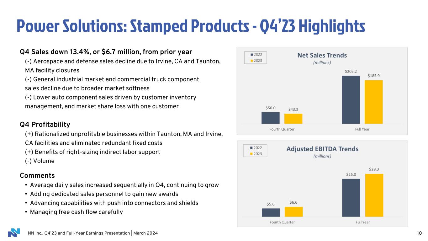 NN Inc., Q4’23 and Full-Year Earnings Presentation | March 2024 Mobile Solutions: Machined Products - Q4’23 Highlights 9 Q4 Sales up 1.8%, or $1.2 million, from prior year (+) Pricing (+) Foreign exchange effects (-) Volume Q4 Profitability (+) Improved product mix and operating performance within several facilities (+) Benefits of right-sizing indirect labor support Comments • 2023 new business wins in-line with the business plan • China wins were above plan and other regions gaining traction • Growth target and plans set for 2024 • Reinforcing the sales team, globally • Aggressive use of digital tools, including SEO for sales leads • Strong cost-down program in place • Operating performance improving in-line with business plan • Protecting cash flow through capital expenditure and working capital management