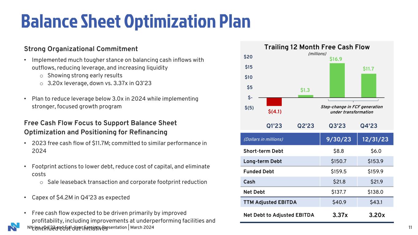 Bevis concluded, “Our organization-wide commitment to our transformation into a profitable, growing company is working and gaining momentum, and we are expecting 2024 to continue to demonstrate progress reflected by improved results on new business wins, profitability, free cash flow, and customer service. Our capital efficient model and low-risk strategy to structurally improve our operations will prove critical in lowering risk for our company. These efforts will ultimately help optimize our balance sheet. While we are encouraged by the early success across our transformation efforts, our improvements are just beginning. We remain committed to advancing and expanding our progress as we move forward. Our decisive actions are taking hold and I would like to thank all our NN team globally, whose dedication and hard work are driving our transformation.”