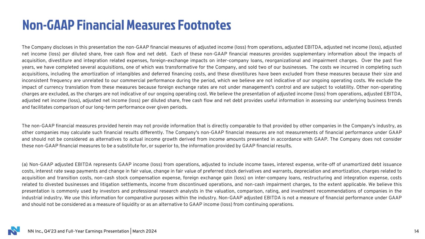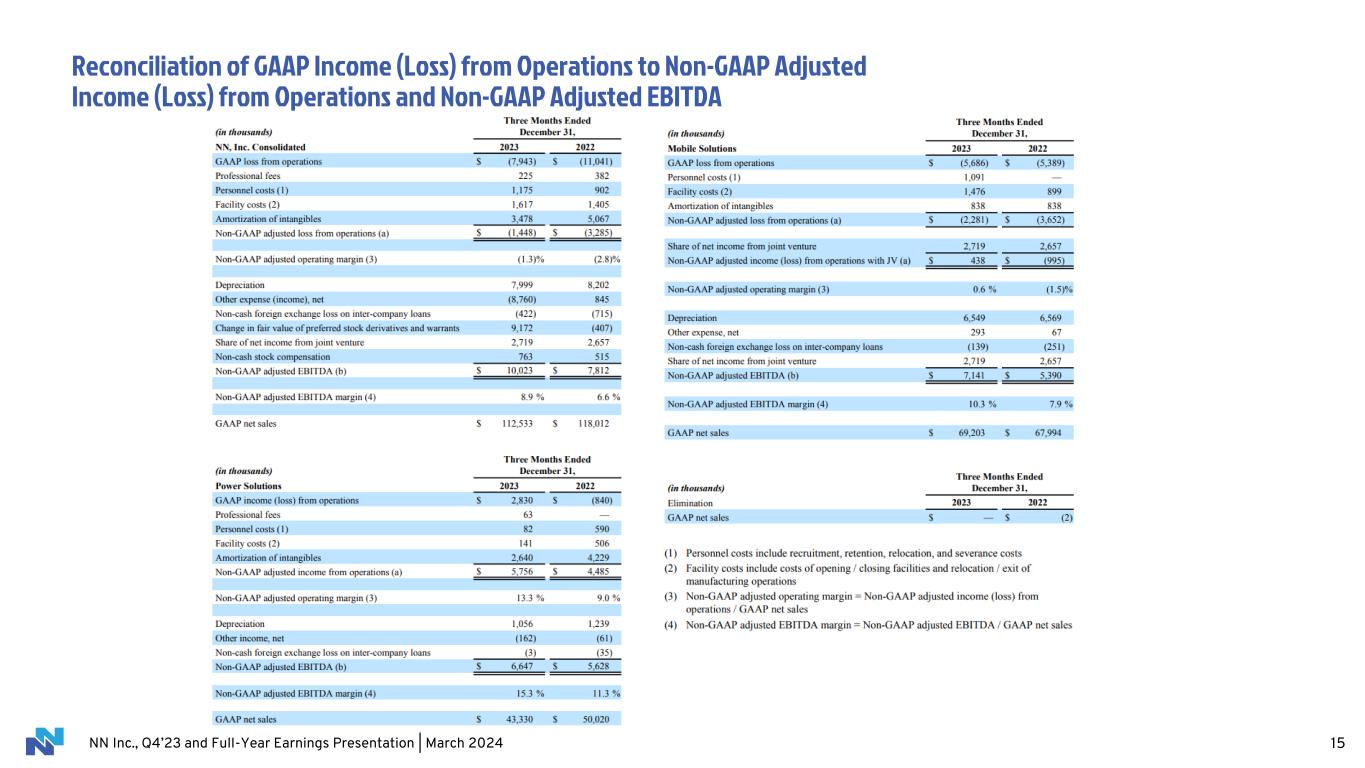 NN Inc., Q4’23 and Full-Year Earnings Presentation | March 2024 14 Non-GAAP Financial Measures Footnotes The Company discloses in this presentation the non-GAAP financial measures of adjusted income (loss) from operations, adjusted EBITDA, adjusted net income (loss), adjusted net income (loss) per diluted share, free cash flow and net debt. Each of these non-GAAP financial measures provides supplementary information about the impacts of acquisition, divestiture and integration related expenses, foreign-exchange impacts on inter-company loans, reorganizational and impairment charges. Over the past five years, we have completed several acquisitions, one of which was transformative for the Company, and sold two of our businesses. The costs we incurred in completing such acquisitions, including the amortization of intangibles and deferred financing costs, and these divestitures have been excluded from these measures because their size and inconsistent frequency are unrelated to our commercial performance during the period, which we believe are not indicative of our ongoing operating costs. We exclude the impact of currency translation from these measures because foreign exchange rates are not under management’s control and are subject to volatility. Other non-operating charges are excluded, as the charges are not indicative of our ongoing operating cost. We believe the presentation of adjusted income (loss) from operations, adjusted EBITDA, adjusted net income (loss), adjusted net income (loss) per diluted share, free cash flow and net debt provides useful information in assessing our underlying business trends and facilitates comparison of our long-term performance over given periods. The non-GAAP financial measures provided herein may not provide information that is directly comparable to that provided by other companies in the Company's industry, as other companies may calculate such financial results differently. The Company's non-GAAP financial measures are not measurements of financial performance under GAAP and should not be considered as alternatives to actual income growth derived from income amounts presented in accordance with GAAP. The Company does not consider these non-GAAP financial measures to be a substitute for, or superior to, the information provided by GAAP financial results. (a) Non-GAAP adjusted EBITDA represents GAAP income (loss) from operations, adjusted to include income taxes, interest expense, write-off of unamortized debt issuance costs, interest rate swap payments and change in fair value, change in fair value of preferred stock derivatives and warrants, depreciation and amortization, charges related to acquisition and transition costs, non-cash stock compensation expense, foreign exchange gain (loss) on inter-company loans, restructuring and integration expense, costs related to divested businesses and litigation settlements, income from discontinued operations, and non-cash impairment charges, to the extent applicable. We believe this presentation is commonly used by investors and professional research analysts in the valuation, comparison, rating, and investment recommendations of companies in the industrial industry. We use this information for comparative purposes within the industry. Non-GAAP adjusted EBITDA is not a measure of financial performance under GAAP and should not be considered as a measure of liquidity or as an alternative to GAAP income (loss) from continuing operations.