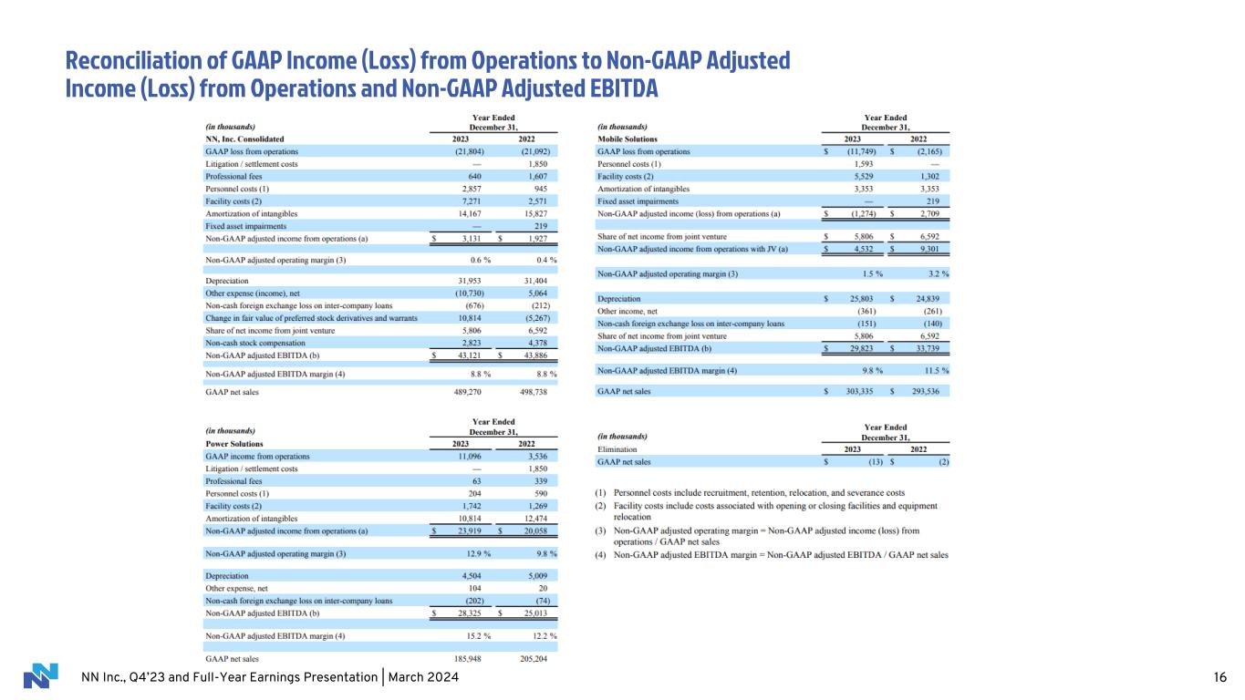 NN Inc., Q4’23 and Full-Year Earnings Presentation | March 2024 Reconciliation of GAAP Income (Loss) from Operations to Non-GAAP Adjusted Income (Loss) from Operations and Non-GAAP Adjusted EBITDA 15