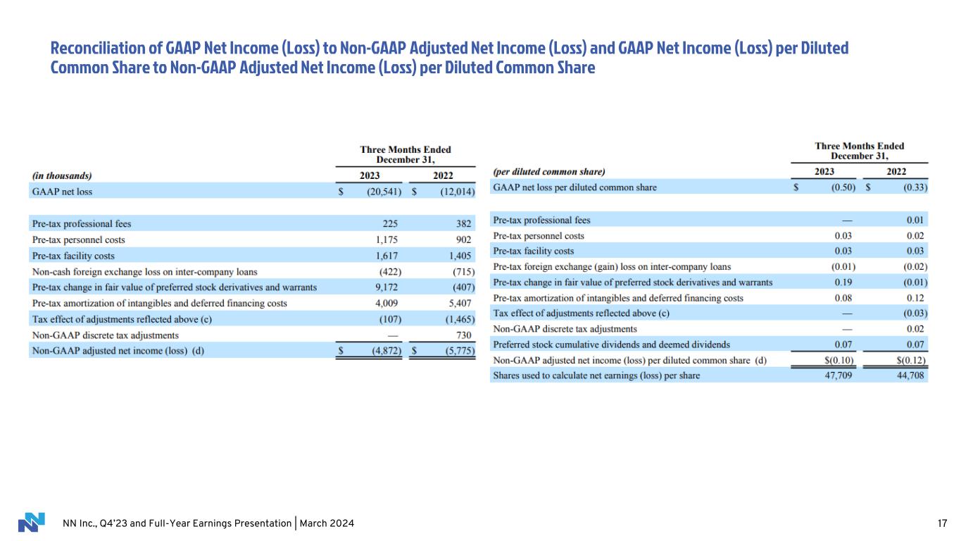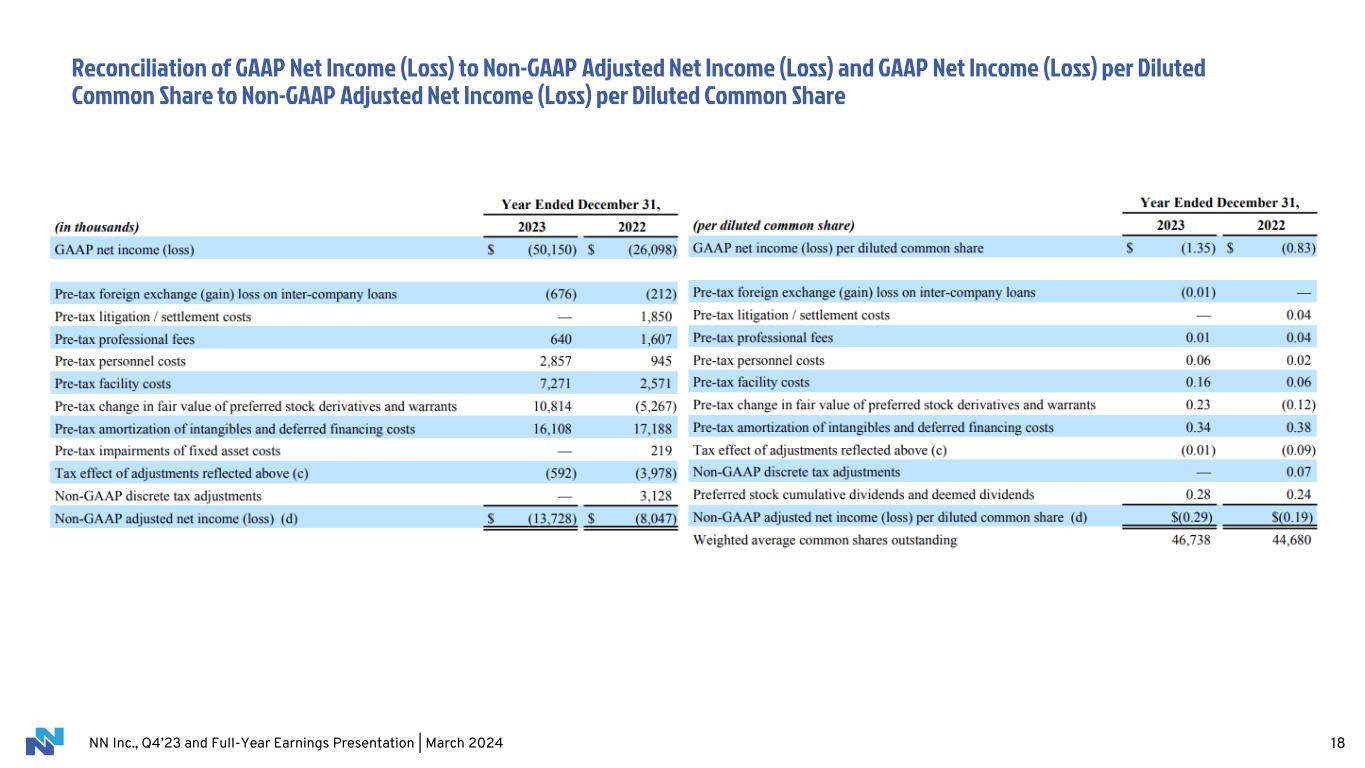 NN Inc., Q4’23 and Full-Year Earnings Presentation | March 2024 Reconciliation of GAAP Net Income (Loss) to Non-GAAP Adjusted Net Income (Loss) and GAAP Net Income (Loss) per Diluted Common Share to Non-GAAP Adjusted Net Income (Loss) per Diluted Common Share 17