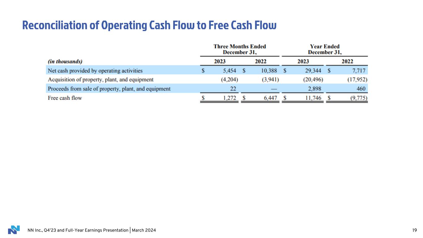NN Inc., Q4’23 and Full-Year Earnings Presentation | March 2024 Reconciliation of Operating Cash Flow to Free Cash Flow 19