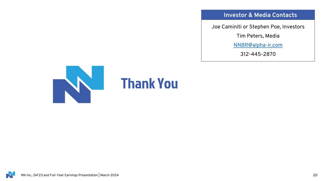NN Inc., Q4’23 and Full-Year Earnings Presentation | March 2024 Thank You 20 Joe Caminiti or Stephen Poe, Investors Tim Peters, Media NNBR@alpha-ir.com 312-445-2870 Investor & Media Contacts