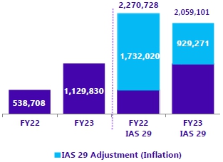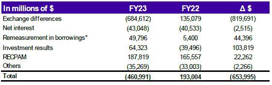 Net Financial Results (including Financial Expenses on Debt and Other Financial Results) showed a loss of P$460,991 million in FY23 (vs. an income of P$193,004 million in FY22), mainly due to: