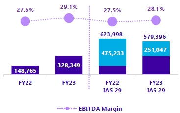 | · | The margin over revenues has improved, even in the challenging context in Argentina, registering 28.1% in FY23 (compared to 27.5% in FY22). This variation is due to the effective management of Operating Costs before Depreciation, Amortization, and Impairment of Fixed Assets, which experienced a strong decline in real terms during EE23 (-10.1% vs EE22). In FY23, Operating Income before Depreciation, Amortization and Impairment of Fixed Assets (“Operating Income Before D, A & I”) amounted to P$579,396 million (-7.1% vs. FY22). |