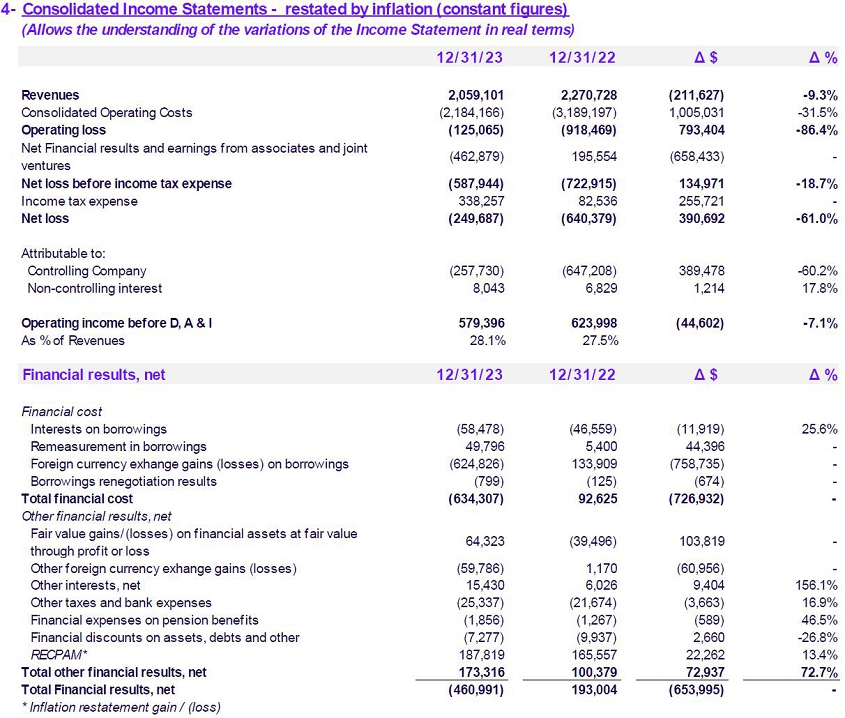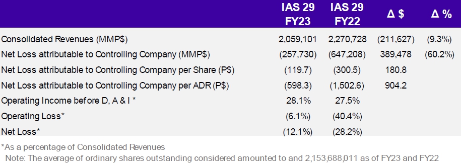 | · | As a result of the strong devaluation of the Argentine peso against the US dollar in real terms, during the FY23, the Company recorded a net loss of P$249,687 million (vs. a loss of P$640,379 million in FY22) mainly explained by exchange [rate?] differences losses included in Financial Results. |