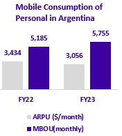 In FY23, mobile service revenues in Argentina amounted to P$763,043 million (-$71,638 million or -8.6% vs FY22). The average monthly revenue per user (“ARPU”) amounted to P$3,056.1 during the FY23 (vs. $3,433.6 in FY22). The effect generated by the restatement in terms of the current measurement unit as of December 31, 2023, included in the ARPU amounted to P$1,383.1 and P$2,613.5 for FY23 and FY22, respectively. The average monthly churn rate was 1.8% in FY23 (compared to an average of 2.3% in FY22).