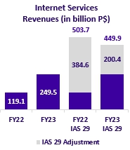 Internet services revenues totaled P$449,904 million during the FY23 (-P$53,767 million or -10.7% vs. FY22). Total broadband subscribers reached approximately 4.1 million in FY23 (-42 thousand vs. FY22) remaining relatively steady since the second quarter of the year. The monthly churn rate of Internet services was positioned at 1.8% and 1.6% as of December 31, 2023, and 2022, respectively.
