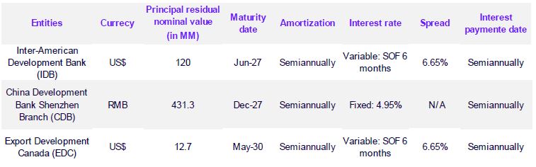 The Company holds certain loans with IFC, IIC, IDB, Finnvera, EDC, and CDB, hereinafter collectively referred to as the "Lenders", whose balances as of December 31, 2023, amounted to $769,919 million. These loans establish, among other provisions, the obligation to comply with certain financial ratios, which are calculated based on contractual definitions: i) "Net Debt/EBITDA" and ii) "EBITDA/Interest Net" on a quarterly basis, along with the presentation of the Company’s financial statements.