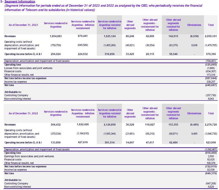 Note: For the figures included in the FFSS, the Company has accounted for the effects of inflation adjustment adopted by Resolution 777/18 of the Comisión Nacional de Valores (“CNV”), which establishes that the restatement will be applied to annual financial statements, interim and special periods ending as of December 31, 2018 inclusive. Accordingly, the reported figures corresponding to FY23 include the effects of the adoption of inflationary accounting in accordance with IAS 29. Finally, comments related to variations of results of FY23 and vs. FY22 mentioned in this press release correspond to “figures restated by inflation” or “constant”. Moreover, Table 3 contemplates information broken down by segment for periods ended as of December 31 of 2023 and 2022, as analyzed by the Executive Committee and the CEO, who receive periodically the financial information of Telecom and its subsidiaries (in historical values). For further details, please refer to the titles of the financial tables beginning from page 11. |