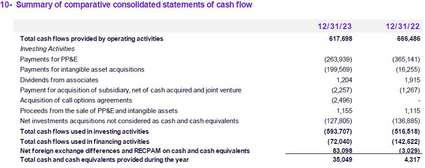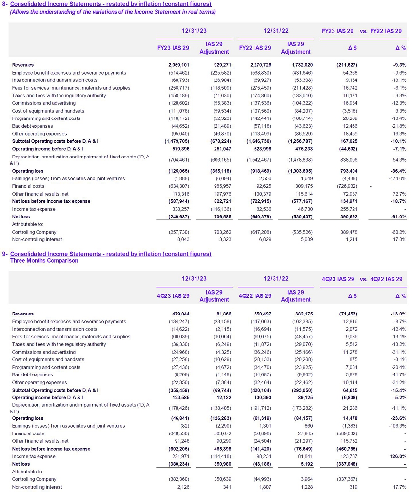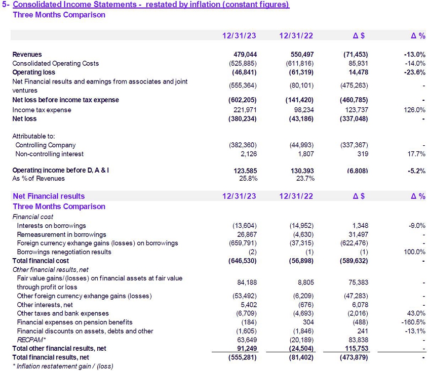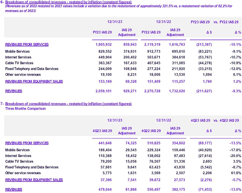 | · | Even with a scenario of strong inflationary acceleration, Service Revenues improved in real terms. In FY22 was observed a variation of –11.7% vs. FY21, while in FY23 was observed a variation of -10.1% compared to FY22, amounting $1,905,932. The Company's Consolidated Revenues amounted to $2,059,101 million in FY23 (-9.3% in constant currency compared to FY22). |