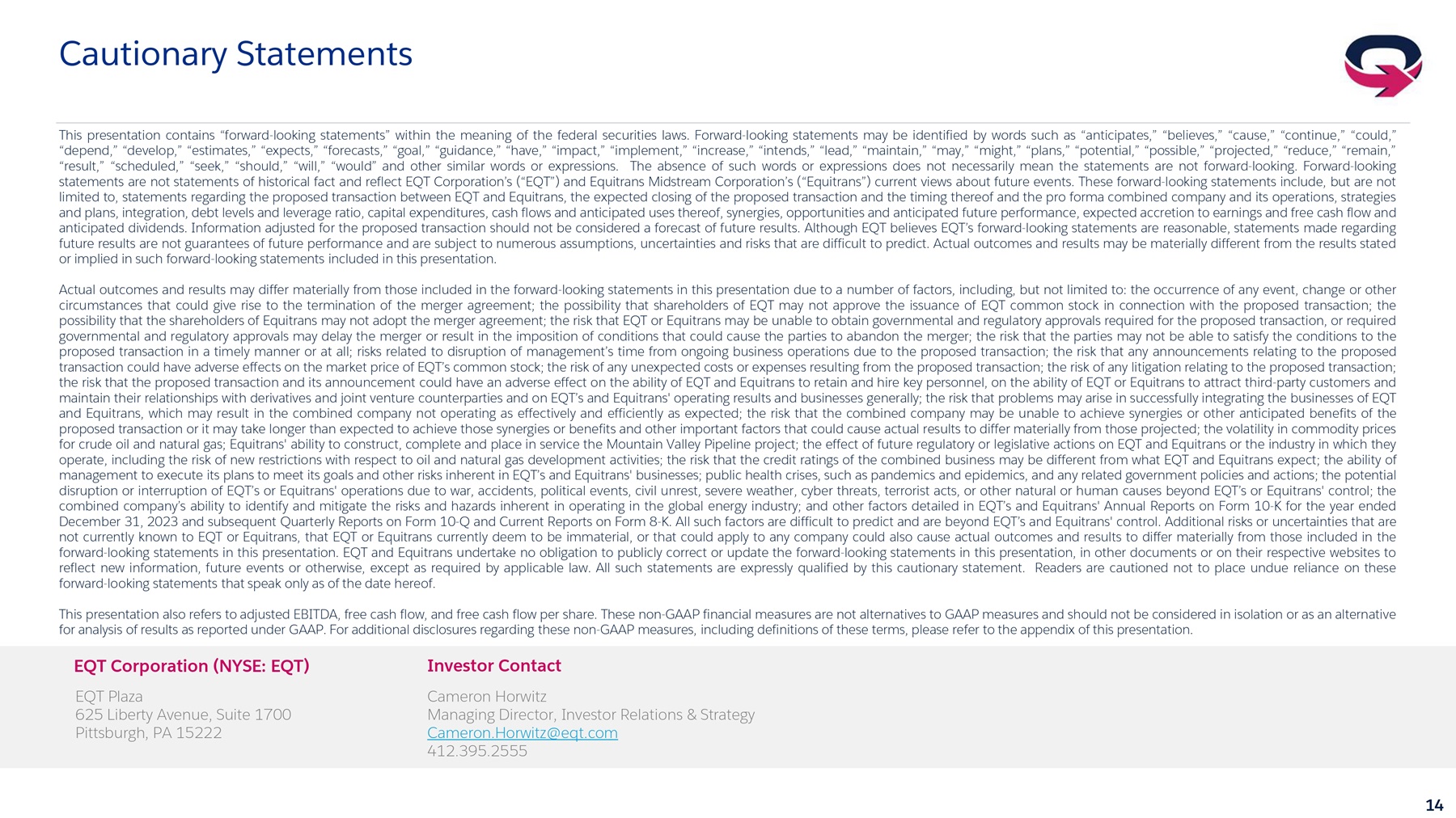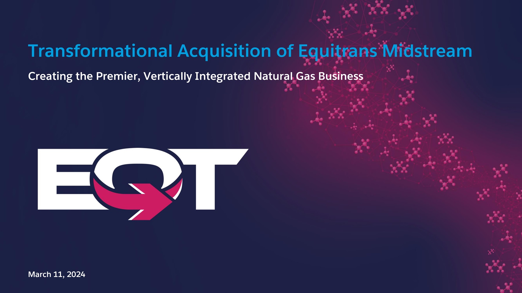 15 Information About Proxy Solicitation IMPORTANT INFORMATION FOR INVESTORS AND SHAREHOLDERS ; ADDITIONAL INFORMATION AND WHERE TO FIND IT In connection with the proposed transaction between EQT and Equitrans, EQT intends to file with the U . S . Securities and Exchange Commission (“SEC”) a registration statement on Form S - 4 (the “registration statement”) that will include a joint proxy statement of EQT and Equitrans and that will also constitute a prospectus of EQT (the “joint proxy statement/prospectus”) . EQT and Equitrans also intend to file other documents regarding the proposed transaction with the SEC . This document is not a substitute for the joint proxy statement/prospectus or the registration statement or any other document EQT or Equitrans may file with the SEC . BEFORE MAKING ANY VOTING DECISION, INVESTORS ARE URGED TO CAREFULLY READ THE REGISTRATION STATEMENT, THE JOINT PROXY STATEMENT/PROSPECTUS, AND ALL OTHER RELEVANT DOCUMENTS FILED OR THAT MAY BE FILED WITH THE SEC IN CONNECTION WITH THE PROPOSED TRANSACTION, AS WELL AS ANY AMENDMENTS OR SUPPLEMENTS TO THOSE DOCUMENTS, AS THEY BECOME AVAILABLE BECAUSE THEY CONTAIN OR WILL CONTAIN IMPORTANT INFORMATION ABOUT EQT, EQUITRANS, THE PROPOSED TRANSACTION, THE RISKS THERETO AND RELATED MATTERS . After the registration statement has been declared effective, a definitive joint proxy statement/prospectus will be mailed to the shareholders of EQT and the shareholders of Equitrans . Investors will be able to obtain free copies of the registration statement and joint proxy statement/prospectus and other relevant documents filed or that will be filed with the SEC by EQT or Equitrans through the website maintained by the SEC at www . sec . gov . Copies of the documents filed with the SEC by EQT may be obtained free of charge on EQT’s website at www . ir . eqt . com/investor - relations . Copies of the documents filed with the SEC by Equitrans may be obtained free of charge on Equitrans' website at www . ir . equitransmidstream . com . PARTICIPANTS IN SOLICITATION EQT and Equitrans and their respective directors, executive officers and other members of management and employees may be deemed to be participants in the solicitation of proxies in connection with the proposed transaction contemplated by the joint proxy statement/prospectus . Information regarding EQT’s directors and executive officers and their ownership of EQT’s securities is set forth in EQT’s filings with the SEC, including EQT’s Annual Report on Form 10 - K for the fiscal year ended December 31 , 2023 and its Definitive Proxy Statement on Schedule 14 A that was filed with the SEC on March 1 , 2024 . To the extent such person’s ownership of EQT’s securities has changed since the filing of such proxy statement, such changes have been or will be reflected on Statements of Changes in Beneficial Ownership on Form 4 filed with the SEC . Information regarding Equitrans' directors and executive officers and their ownership of Equitrans' securities is set forth in Equitrans' filings with the SEC, including Equitrans' Annual Report on Form 10 - K for the fiscal year ended December 31 , 2023 and its Definitive Proxy Statement on Schedule 14 A that was filed with the SEC on March 4 , 2024 . To the extent such person’s ownership of Equitrans' securities has changed since the filing of such proxy statement, such changes have been or will be reflected on Statements of Changes in Beneficial Ownership on Form 4 filed with the SEC . Additional information regarding the interests of those persons and other persons who may be deemed participants in the proposed transaction may be obtained by reading the joint proxy statement/prospectus and other relevant materials that will be filed with the SEC regarding the proposed transaction when such documents become available . You may obtain free copies of these documents as described in the preceding paragraph . NO OFFER OR SOLICITATION This presentation relates to the proposed transaction between EQT and Equitrans . This presentation is for informational purposes only and shall not constitute an offer to sell or exchange, or the solicitation of an offer to buy or exchange, any securities or a solicitation of any vote or approval, in any jurisdiction, pursuant to the proposed transaction or otherwise, nor shall there be any sale, issuance, exchange or transfer of the securities referred to in this document in any jurisdiction in contravention of applicable law . No offer of securities shall be made except by means of a prospectus meeting the requirements of Section 10 of the Securities Act of 1933 , as amended .