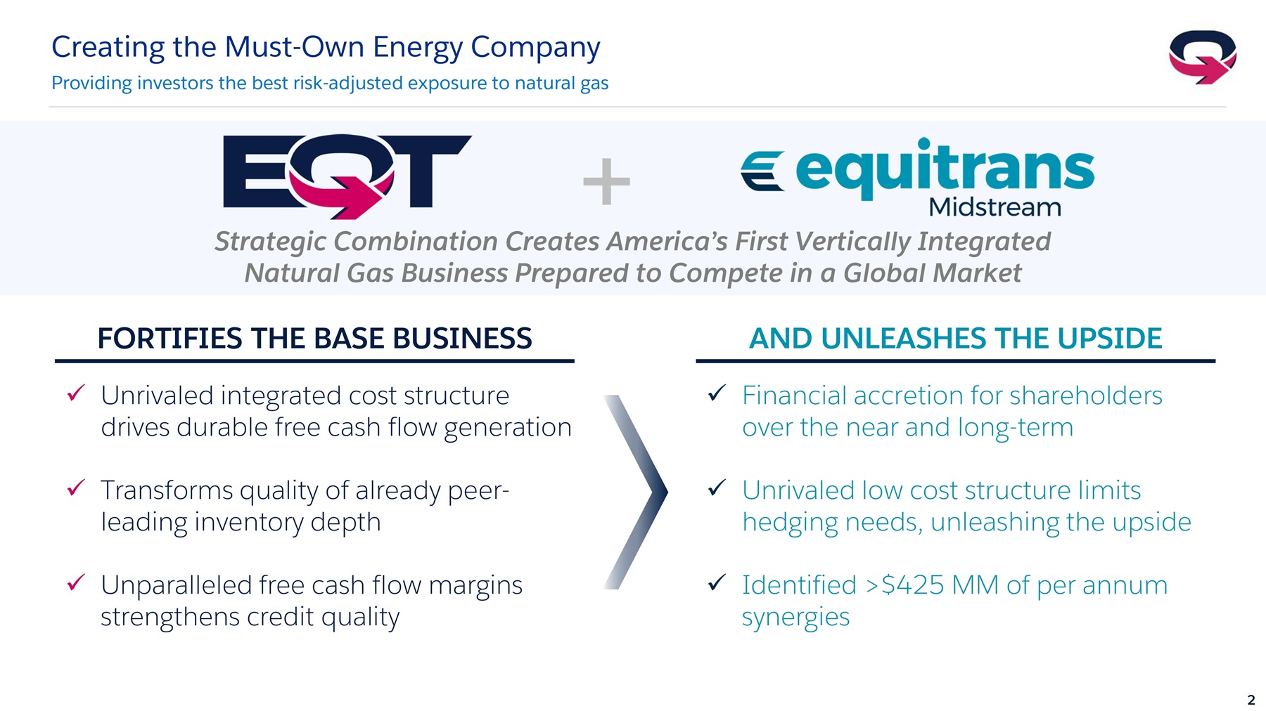 Turning to the deal structure. Consideration is all-stock with EQT shareholders owning approximately 74% of the pro forma company and Equitrans shareholders owning 26%. We are excited to broaden our shareholder base to investors that covet the durability of critical infrastructure assets, while also providing the best upside exposure to the structural growth we see in natural gas demand for decades to come.