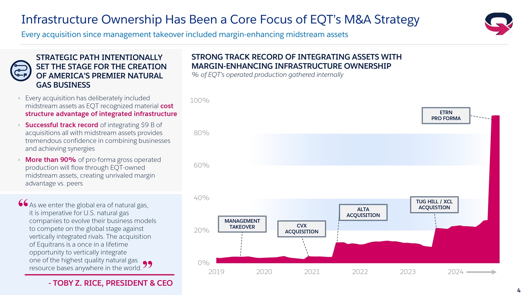 3 Equitrans Merger Creates the Premier American Natural Gas Company Solidifies EQT as the lowest cost natural gas producer, driving robust free cash generation in all commodity price environmen ts + >$35 B Enterprise Value ~$23 B Equity Value $7.5 B Long - Term Debt Target >8.0 Bcfe/d Gathered Volume Throughput ~90% EQT Integrated Volumes PROVIDING INVESTORS THE BEST RISK - ADJUSTED EXPOSURE TO NATURAL GAS ~6.3 Bcfe/d Upstream Net Production 1. Non - GAAP measure. See appendix for definition. EQT pro forma forecast assumes strip pricing as of March 6, 2024. ~$6 B Annual Adj. EBITDA (1) ~30% Midstream Cash Flows ~$16 B 2025E – 2029E Cumulative FCF (1) ETRN BRINGS EXTENSIVE OVERLAP AND DIRECT CONNECTIVITY IN CORE OPERATIONS AREA Gathering: ~1, 22 0 miles Water: ~200 miles Transmission: ~940 miles MVP: ~300 miles